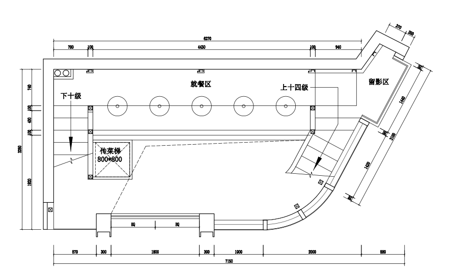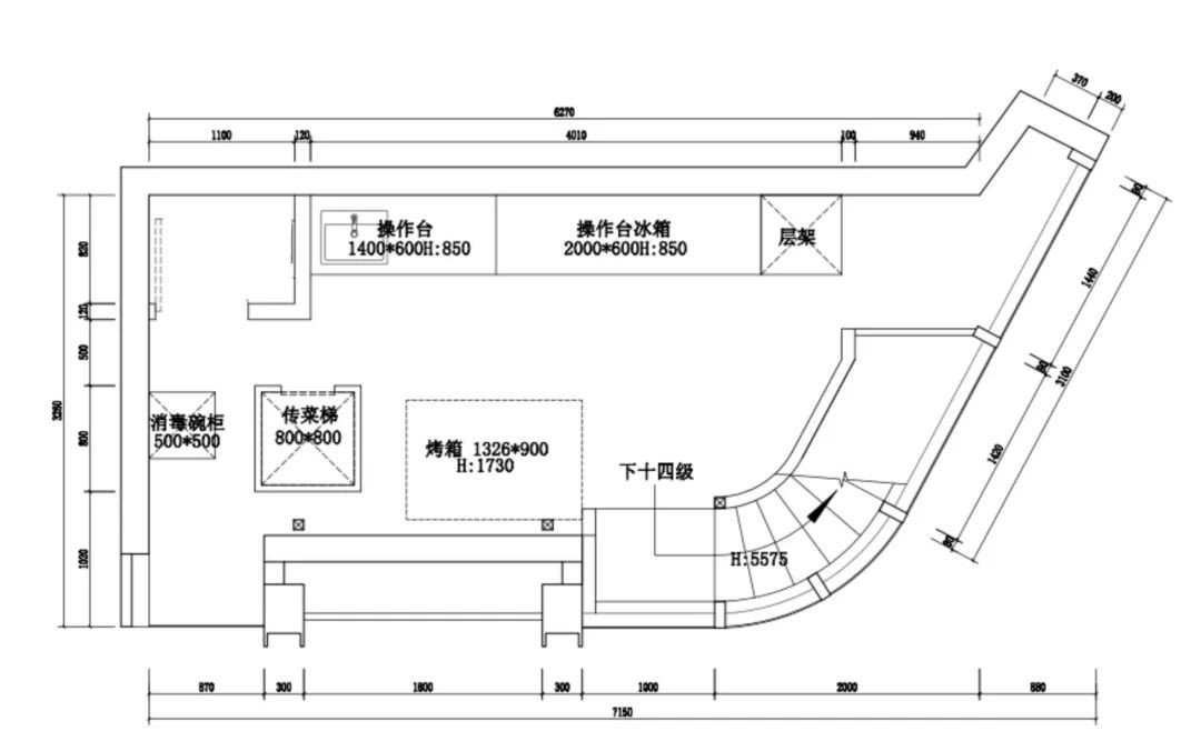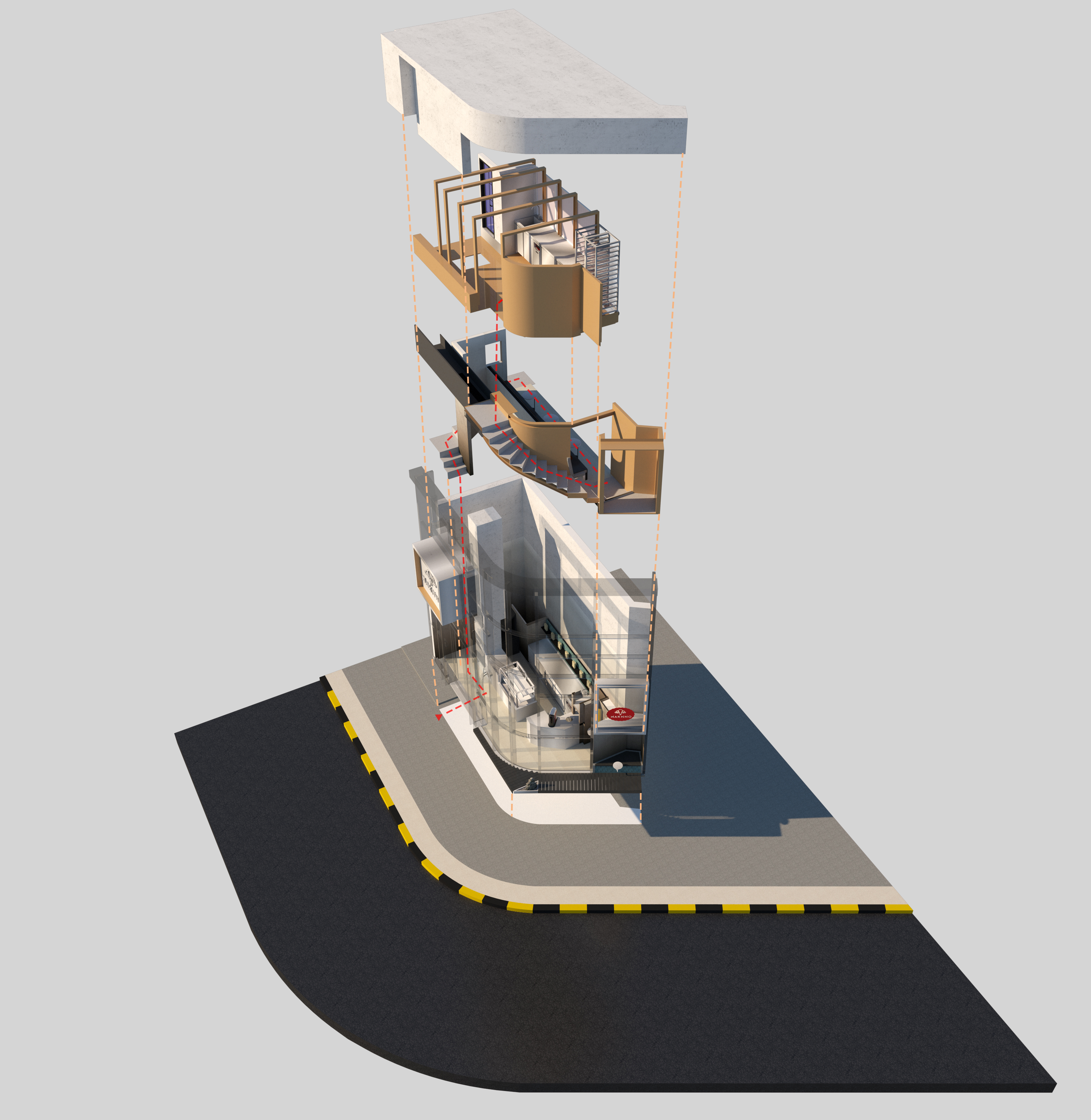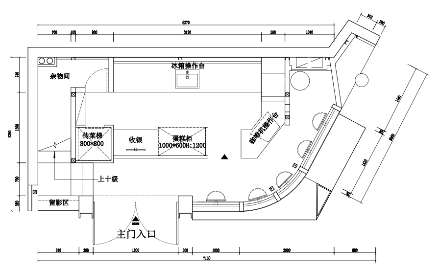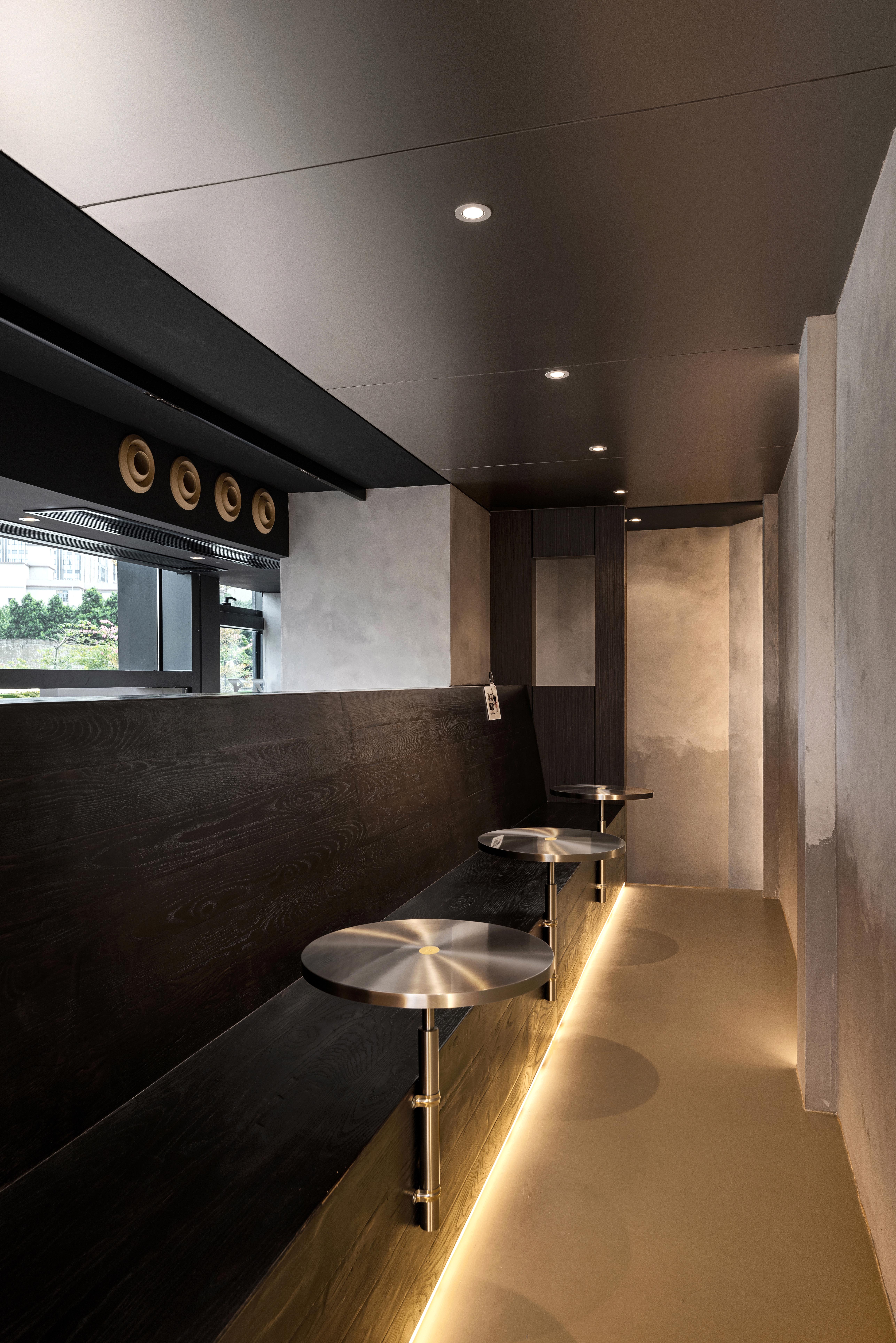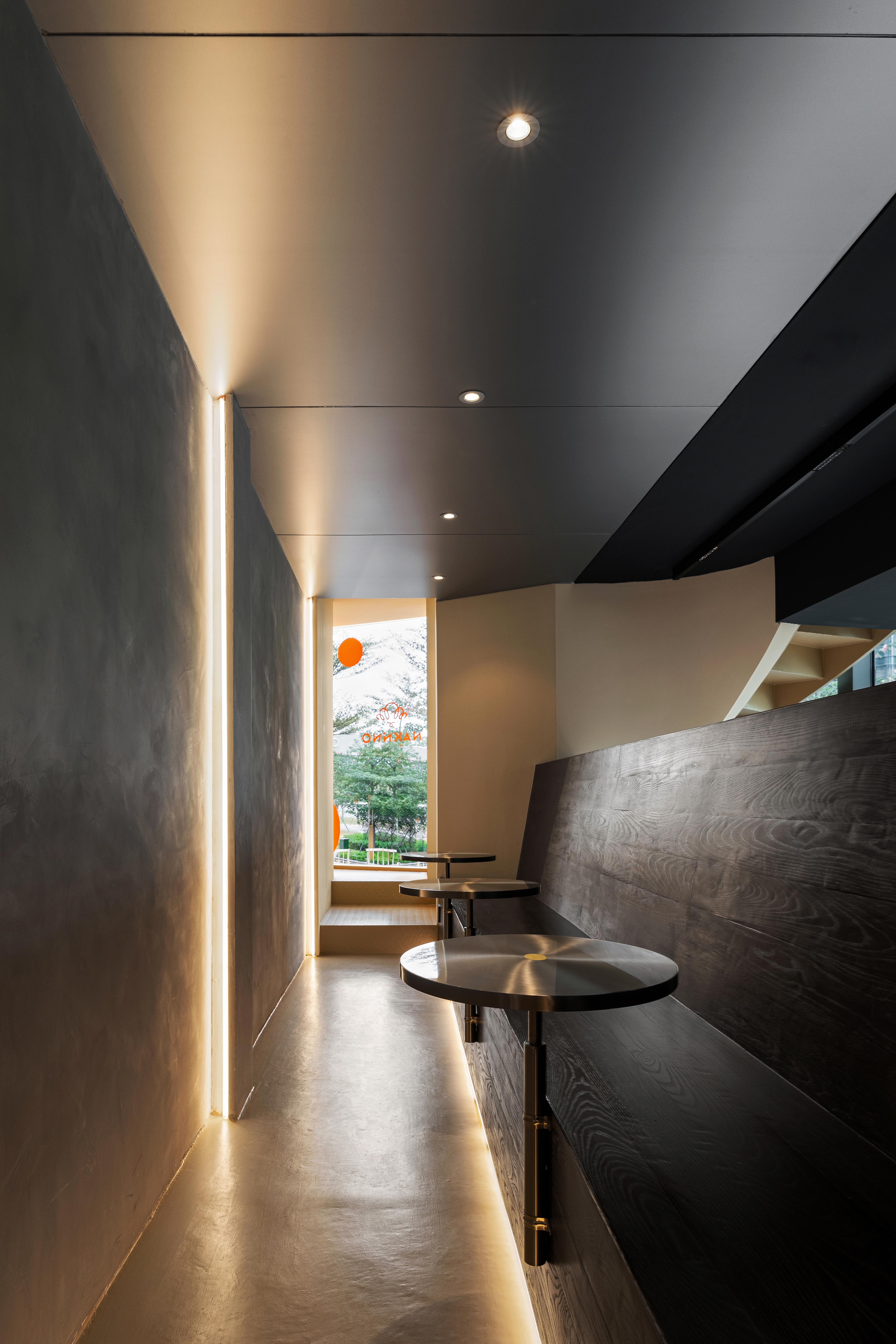 首先我们把入口放到空间的中央,让参观者能从高大的位置体验空间,我们把空间局部隔成三层,上中下成了大概3段,前台、过道&座位,厨房,中层的极限过道连接了一层和三层,各个空间相互渗透,流淌,形成多个有趣的空间;通过高低,围合的变化赋予空间节奏感。 -