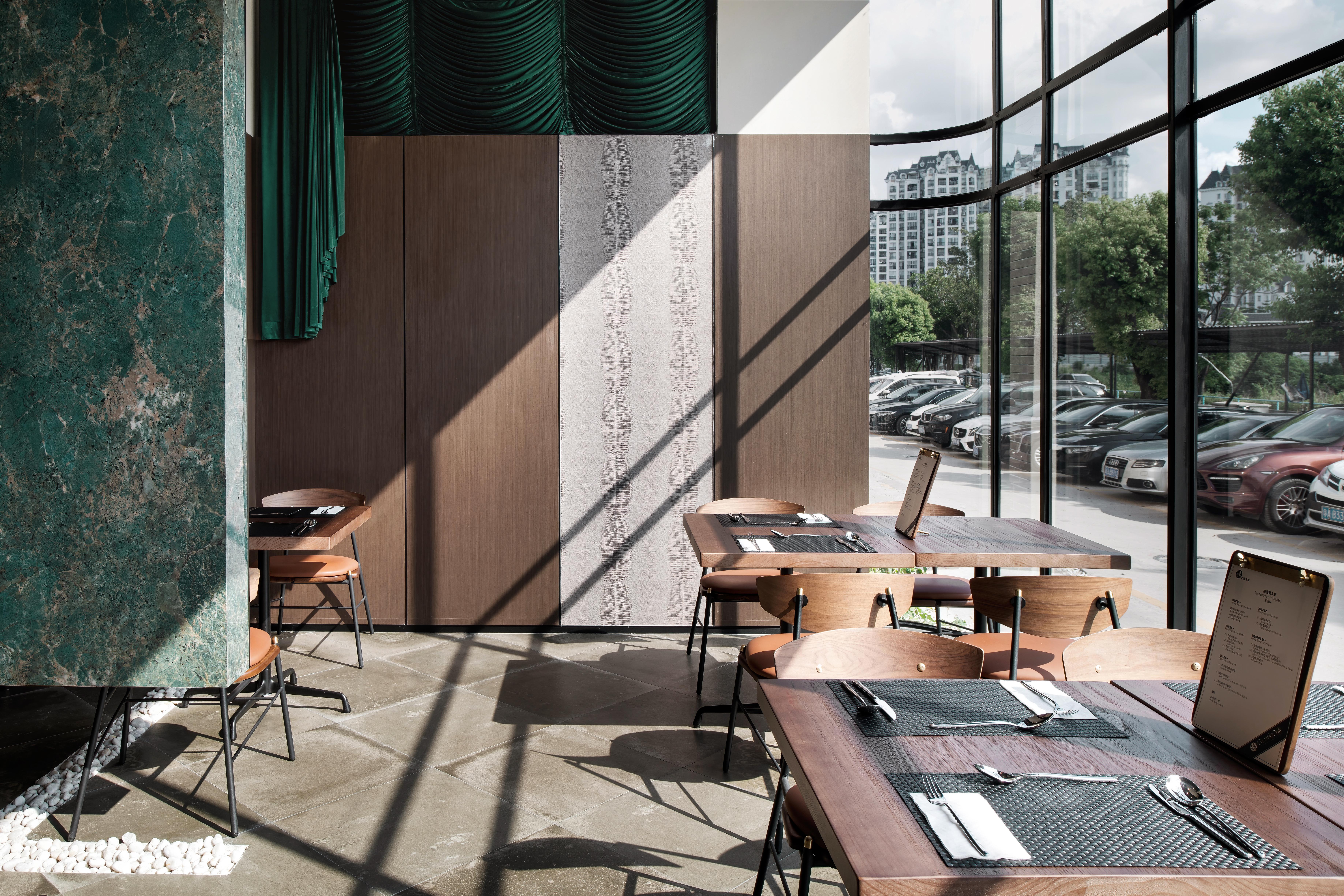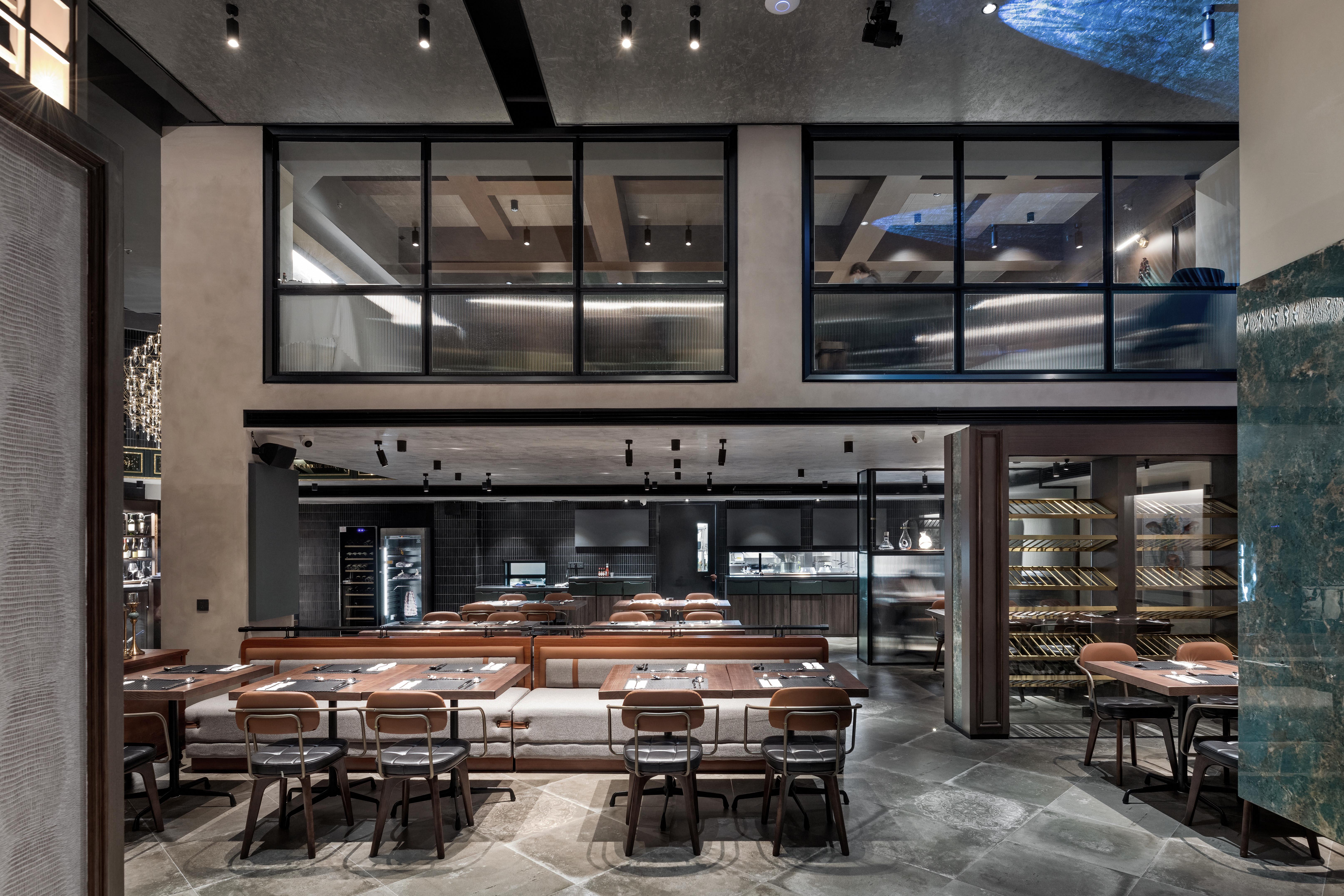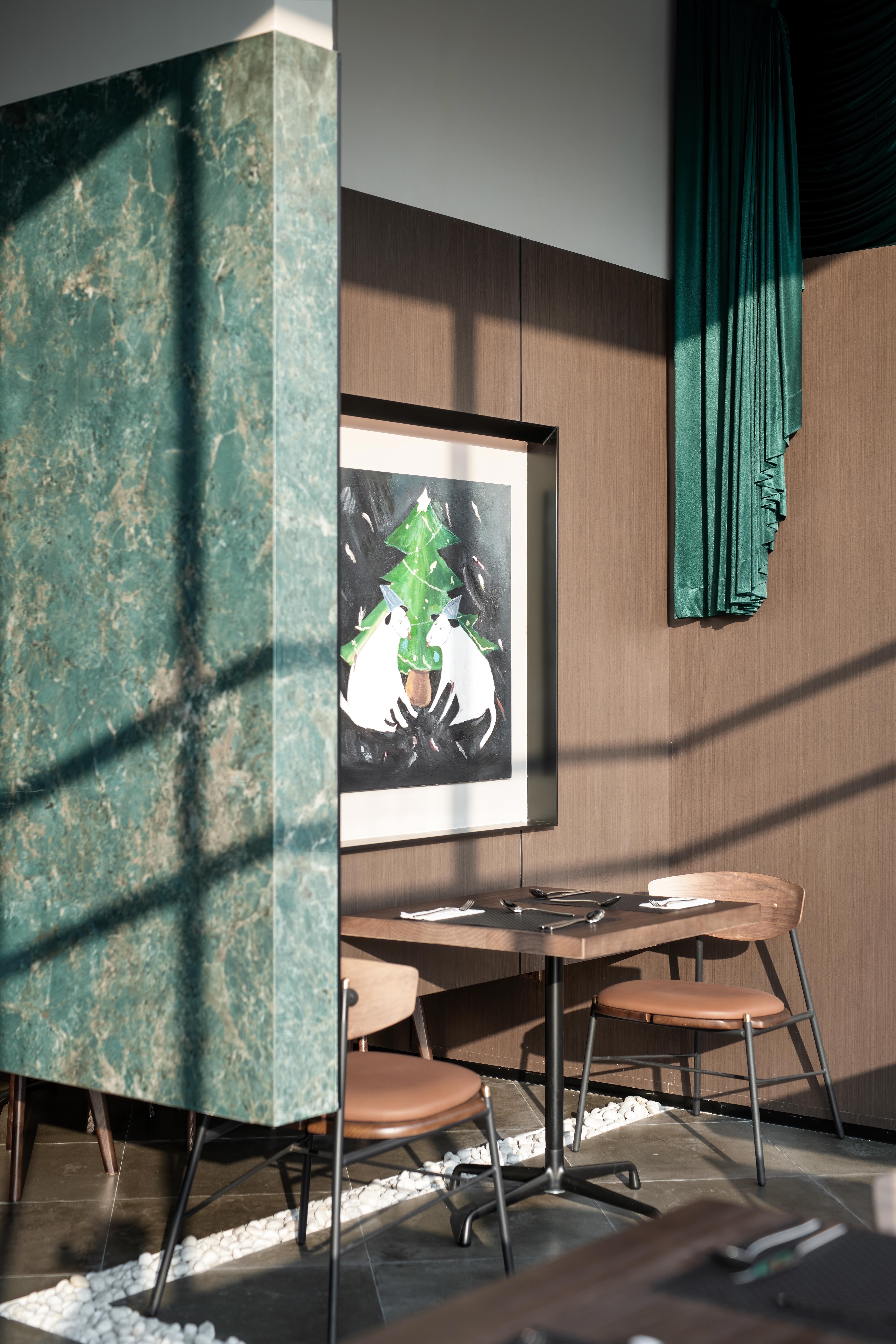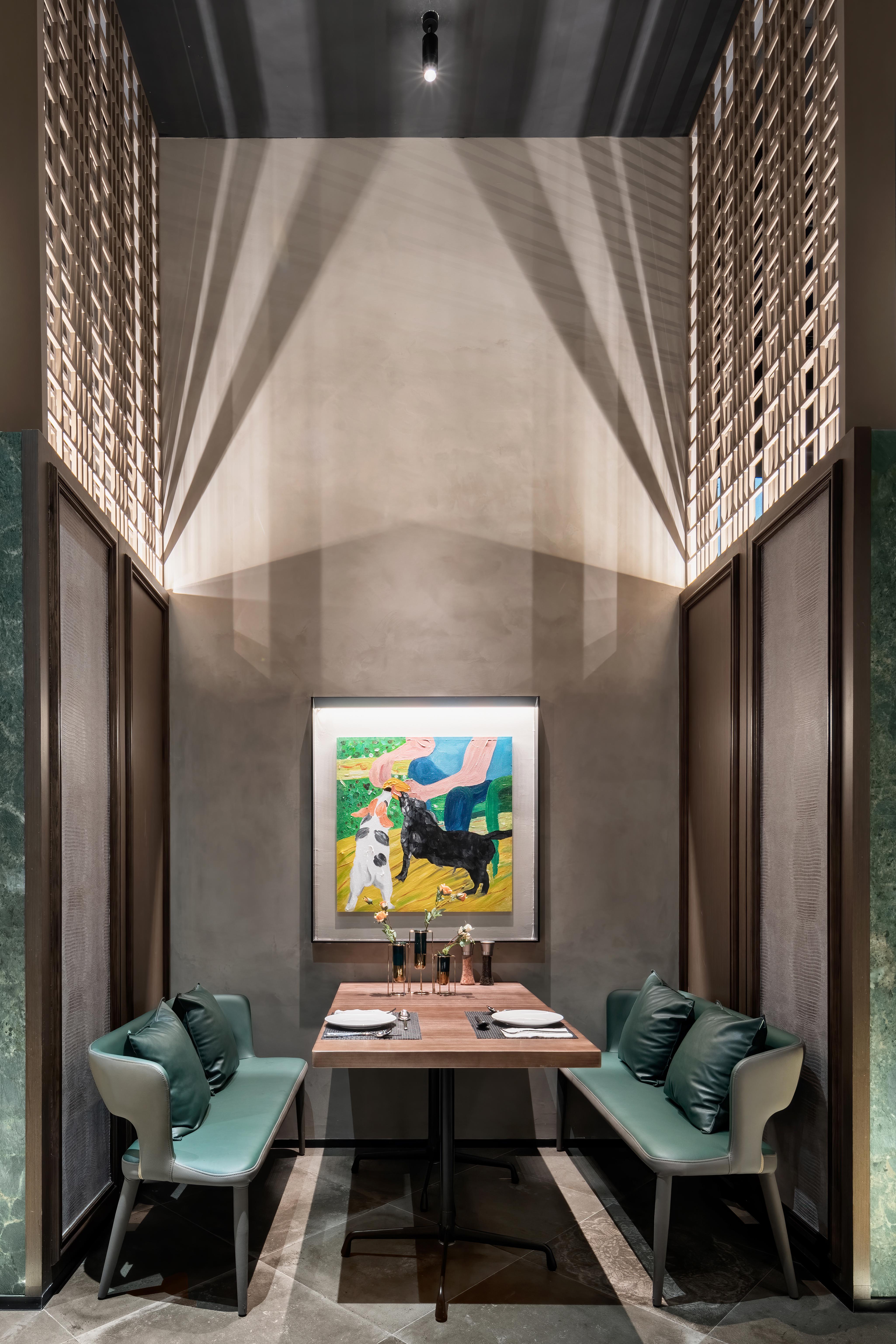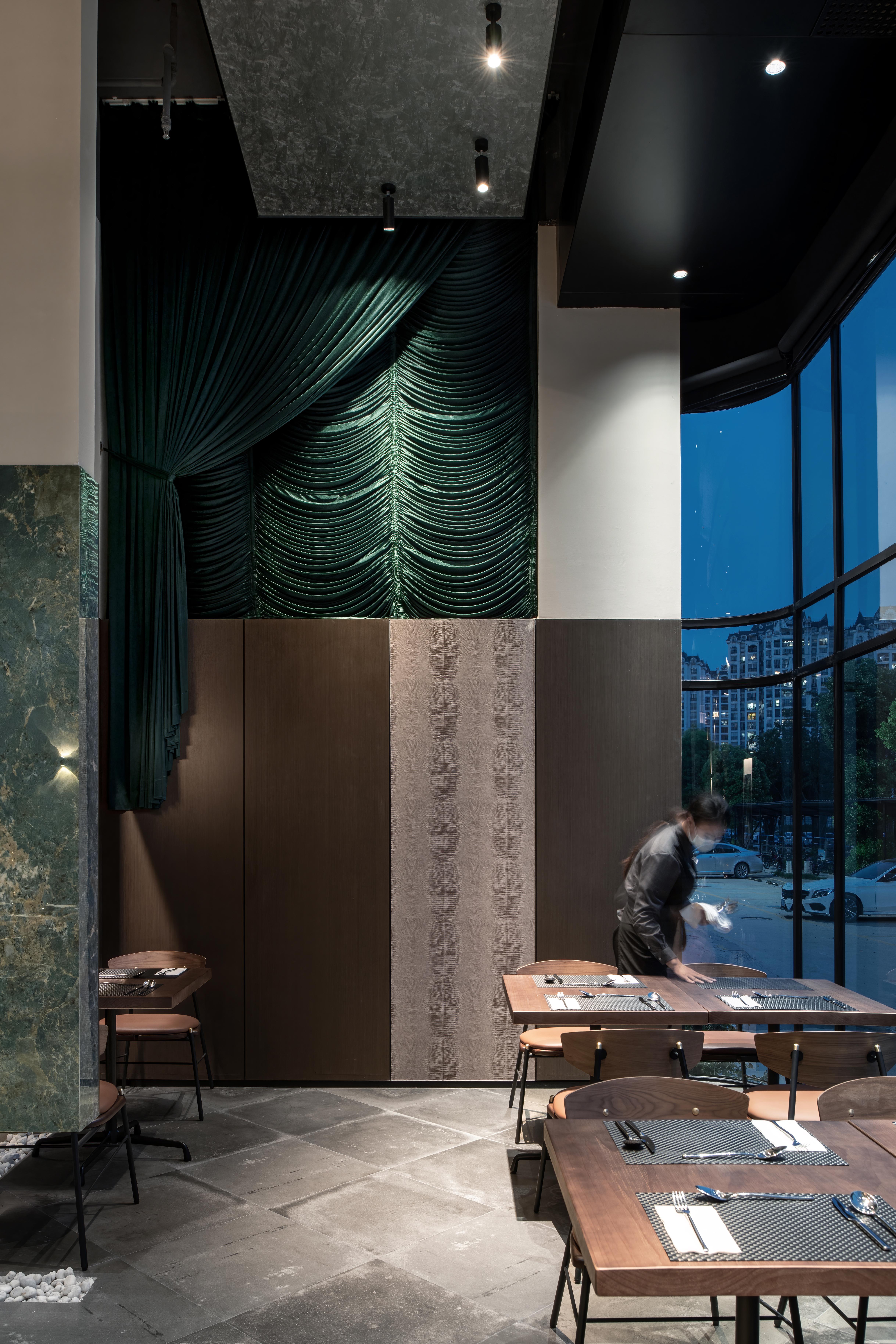 项目定位:项目地点位于番禺喜盈汇,是未来地铁上盖的热闹商区,我们试图在复杂且活跃的餐饮集中地定义一个新的西餐形式。我们希望通过材料、色彩和光线,营造舒适轻松且优雅有格调的场所氛围。利用空间布局和设计元素,提升消费者对于「干式熟成牛排」整体感受。