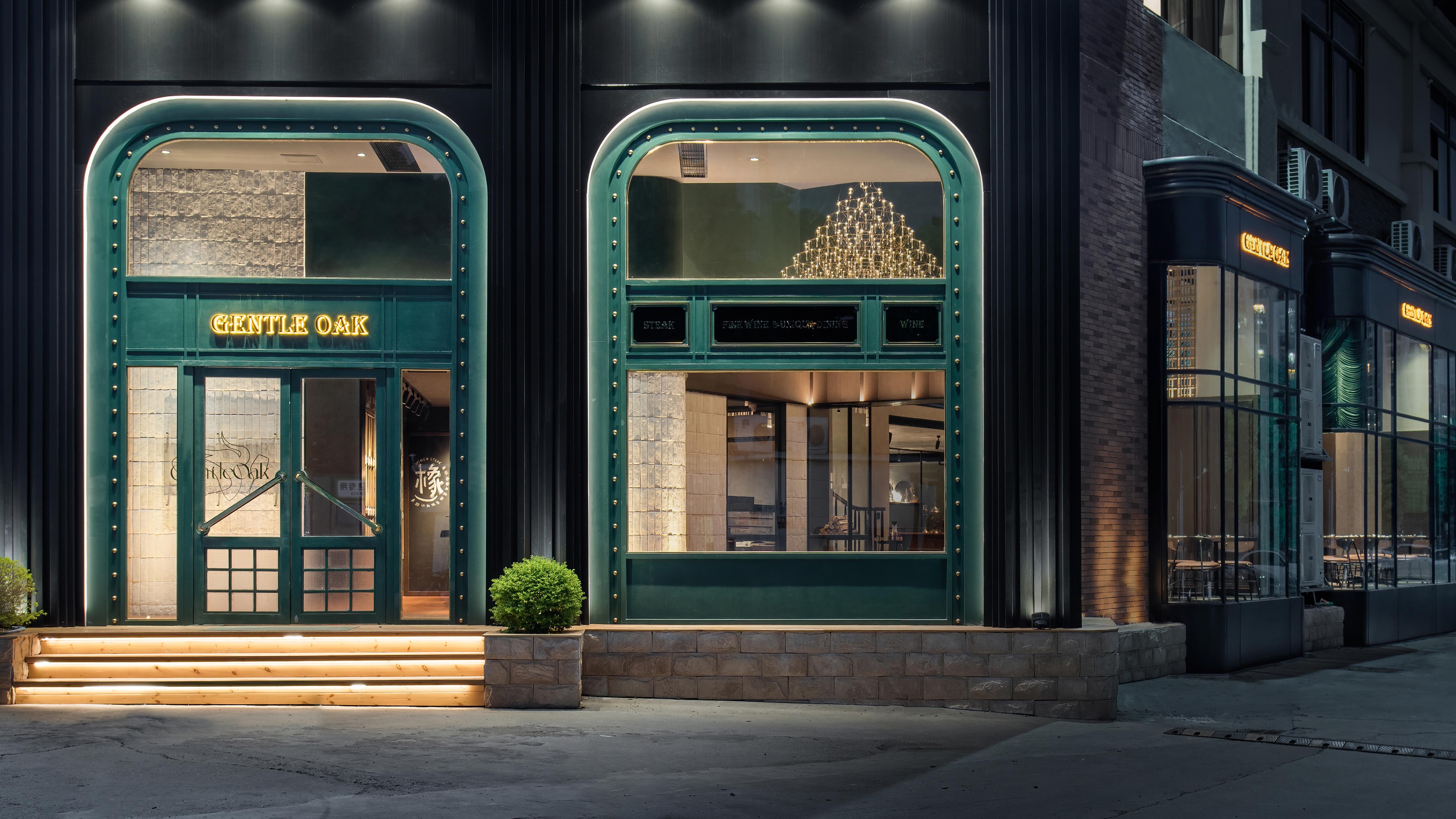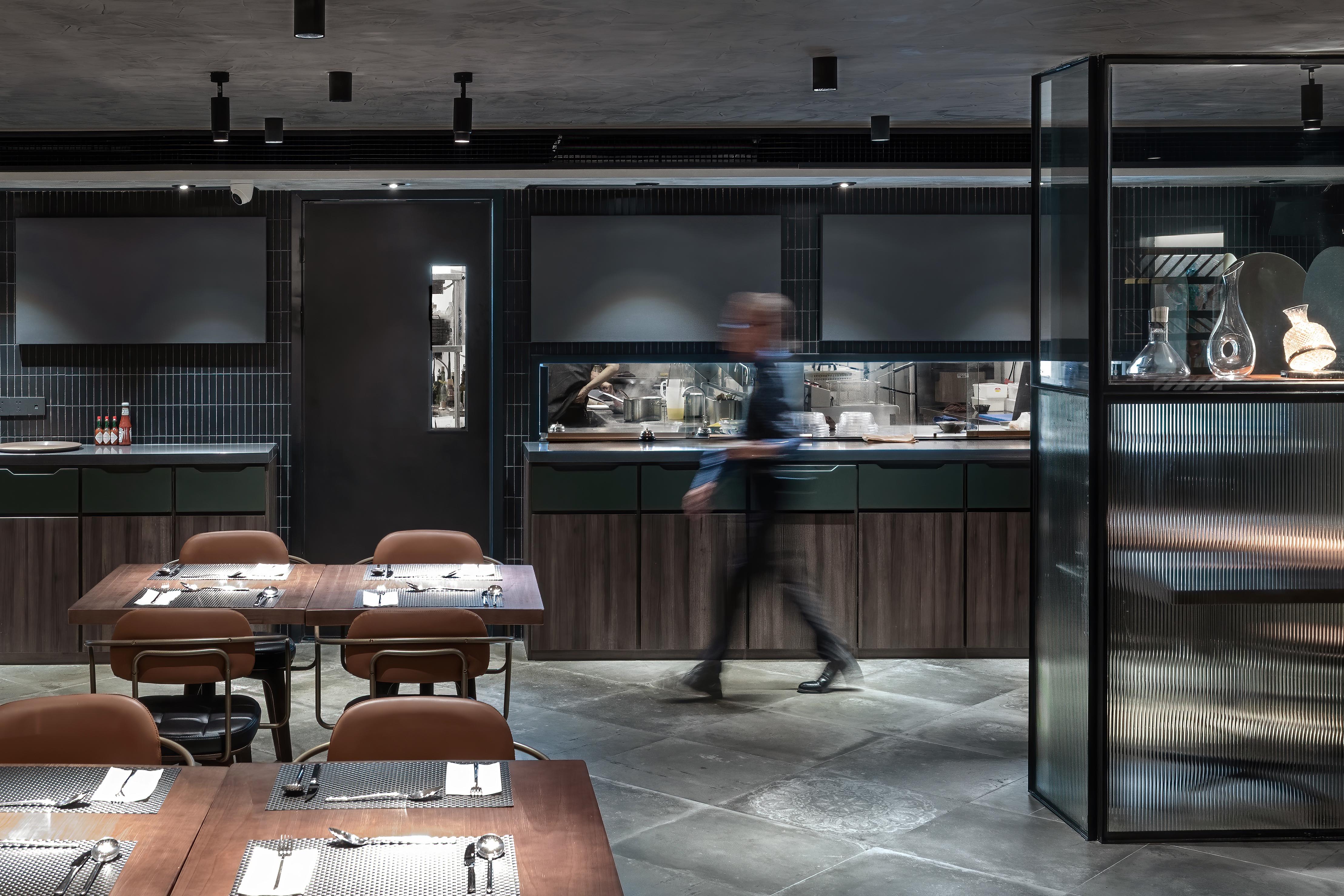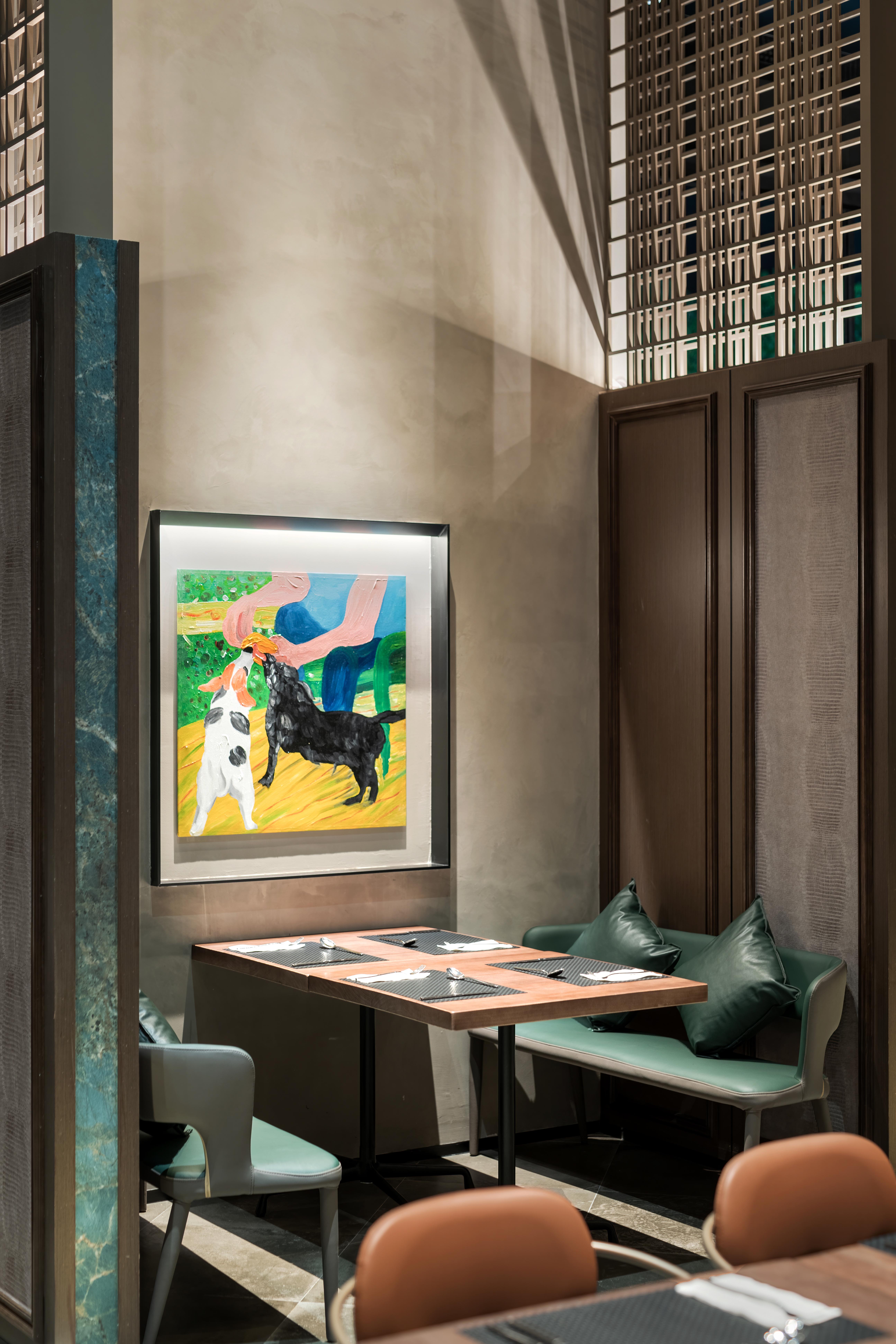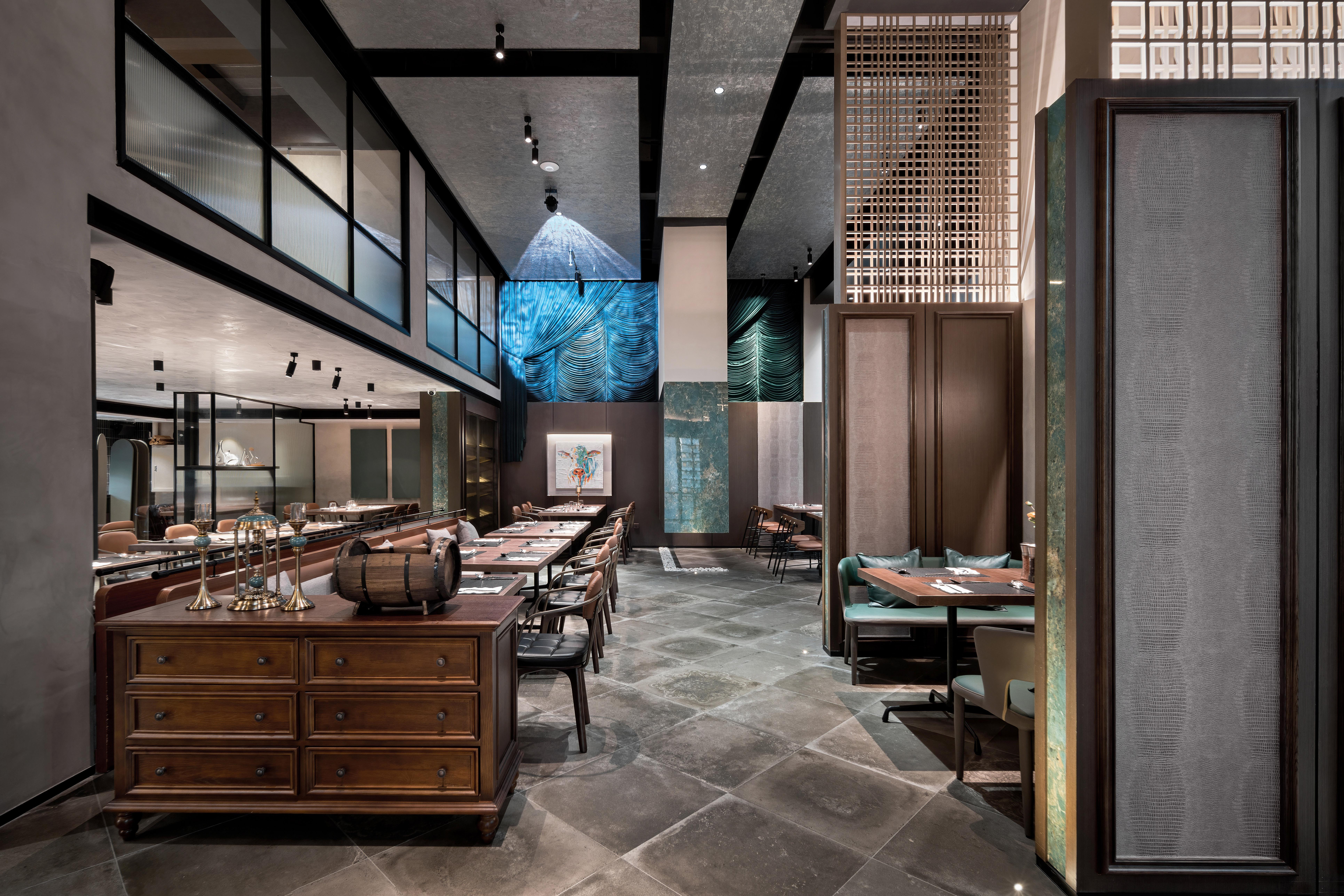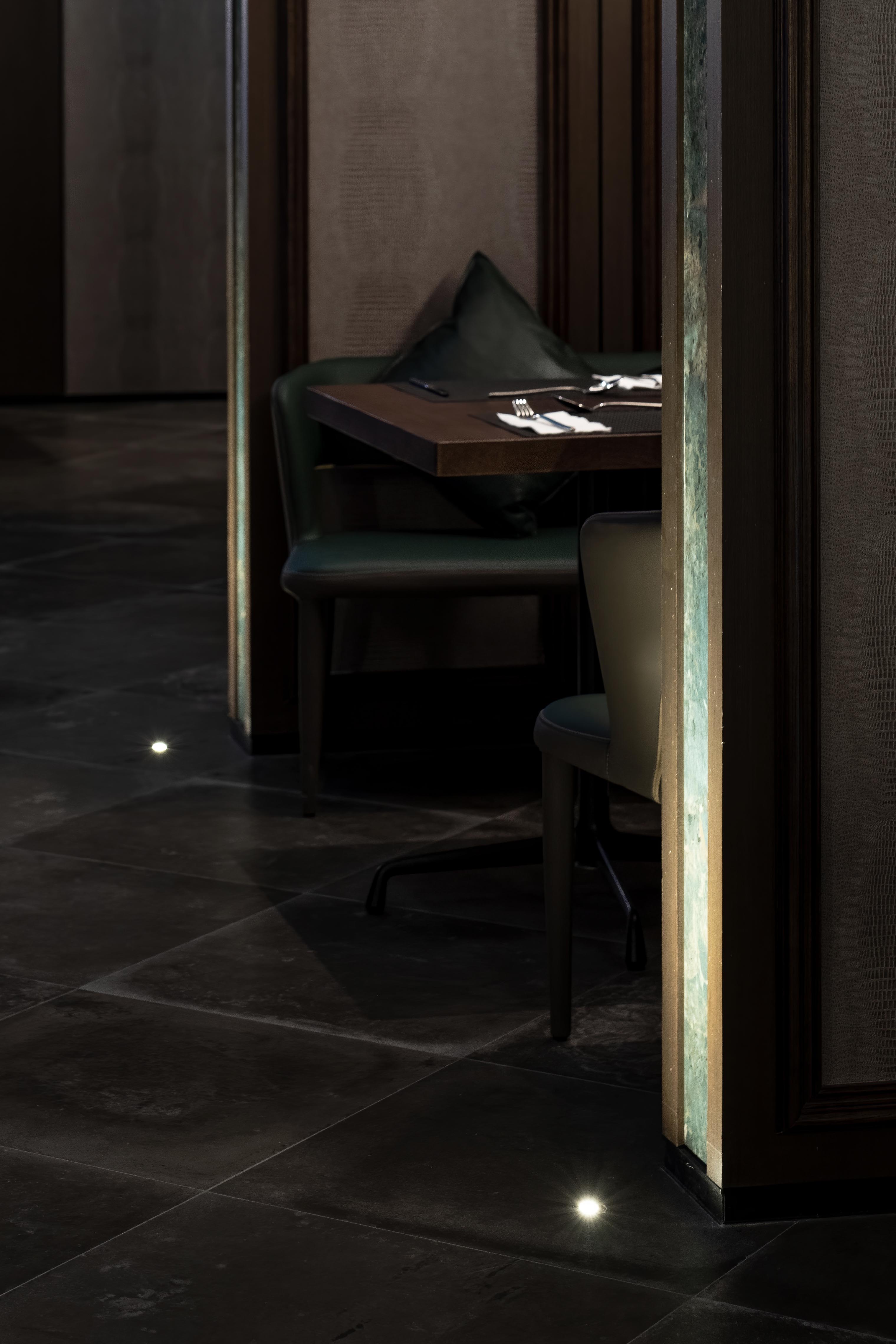 项目定位:项目地点位于番禺喜盈汇,是未来地铁上盖的热闹商区,我们试图在复杂且活跃的餐饮集中地定义一个新的西餐形式。我们希望通过材料、色彩和光线,营造舒适轻松且优雅有格调的场所氛围。利用空间布局和设计元素,提升消费者对于「干式熟成牛排」整体感受。