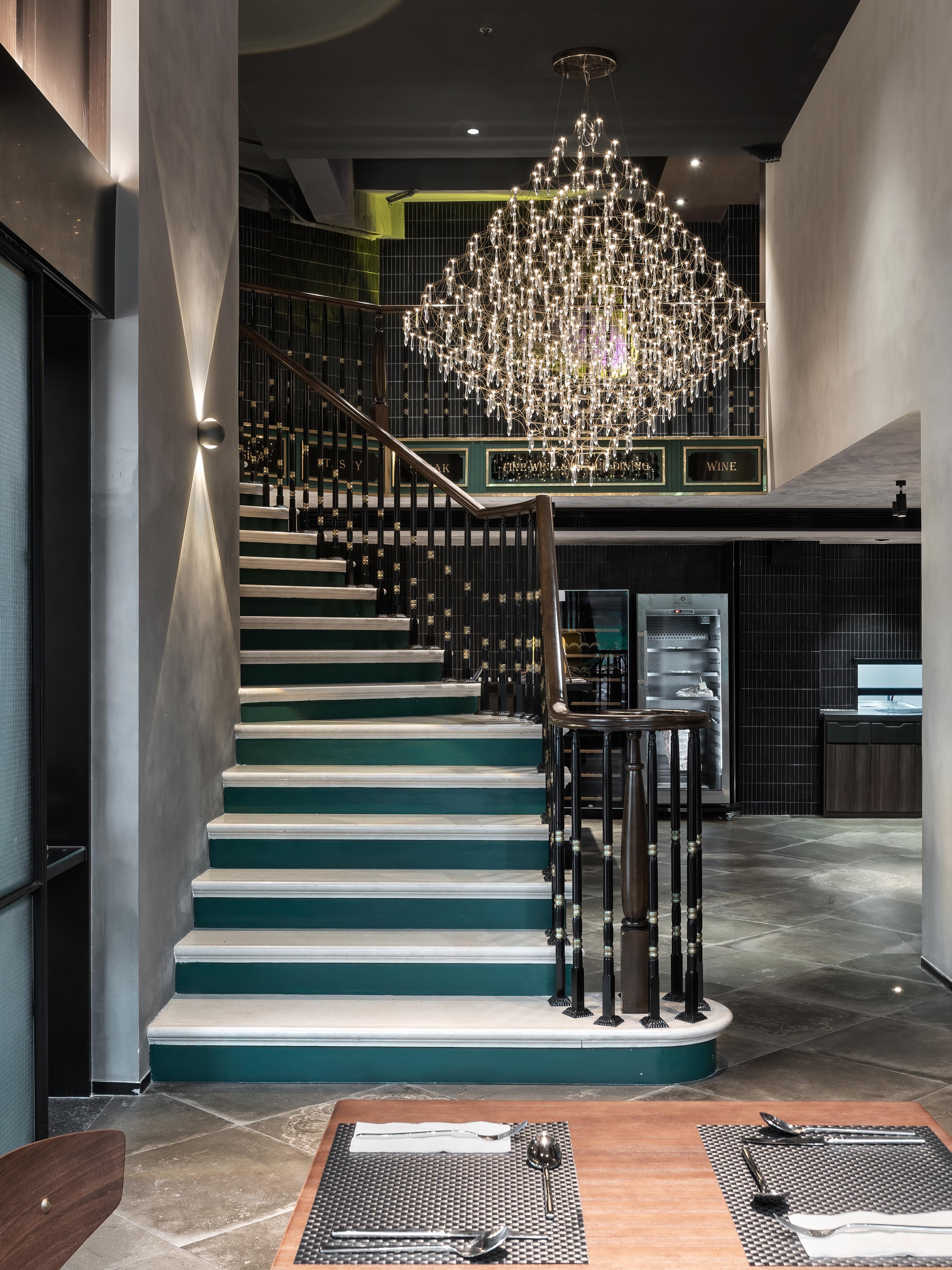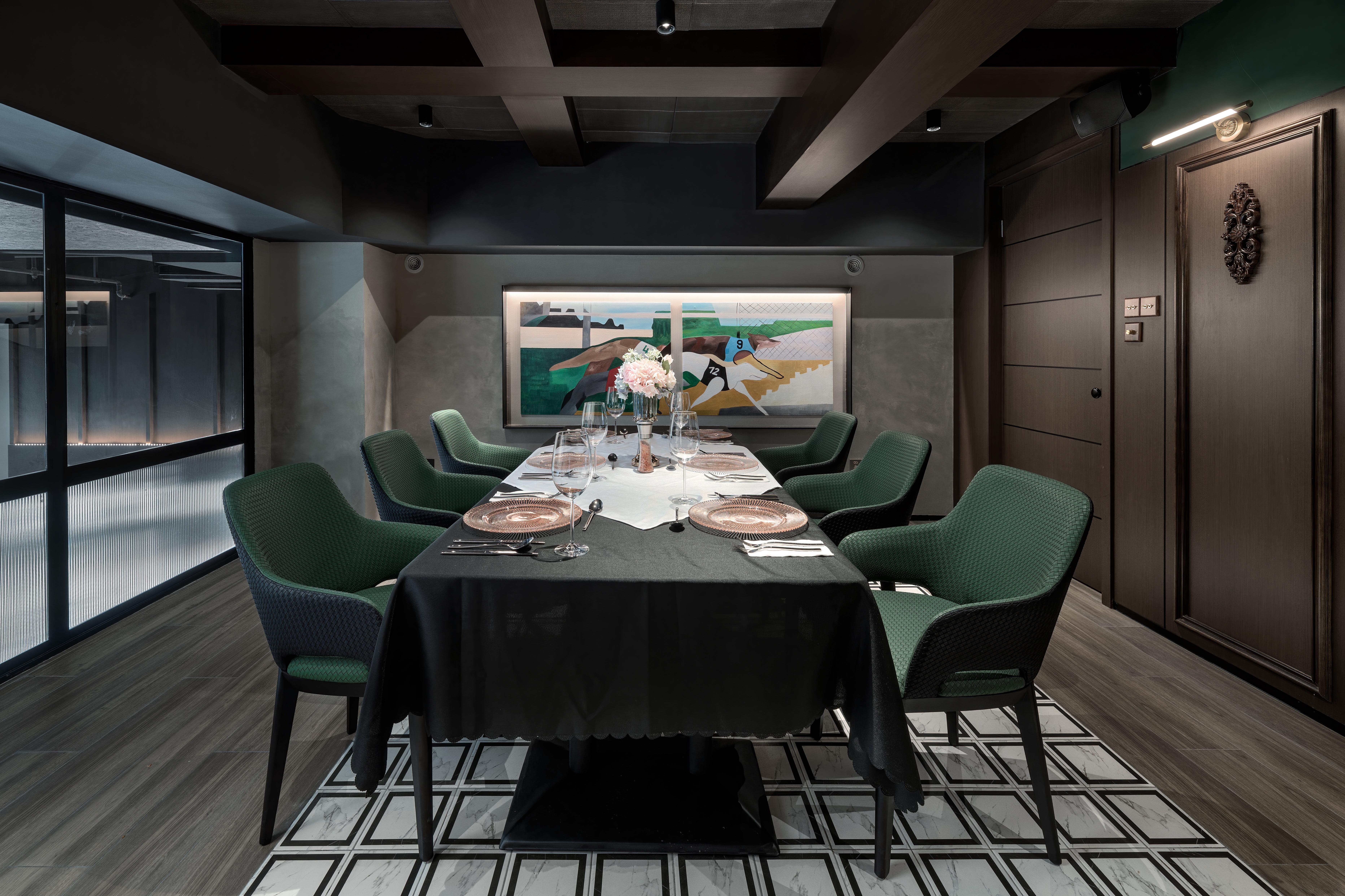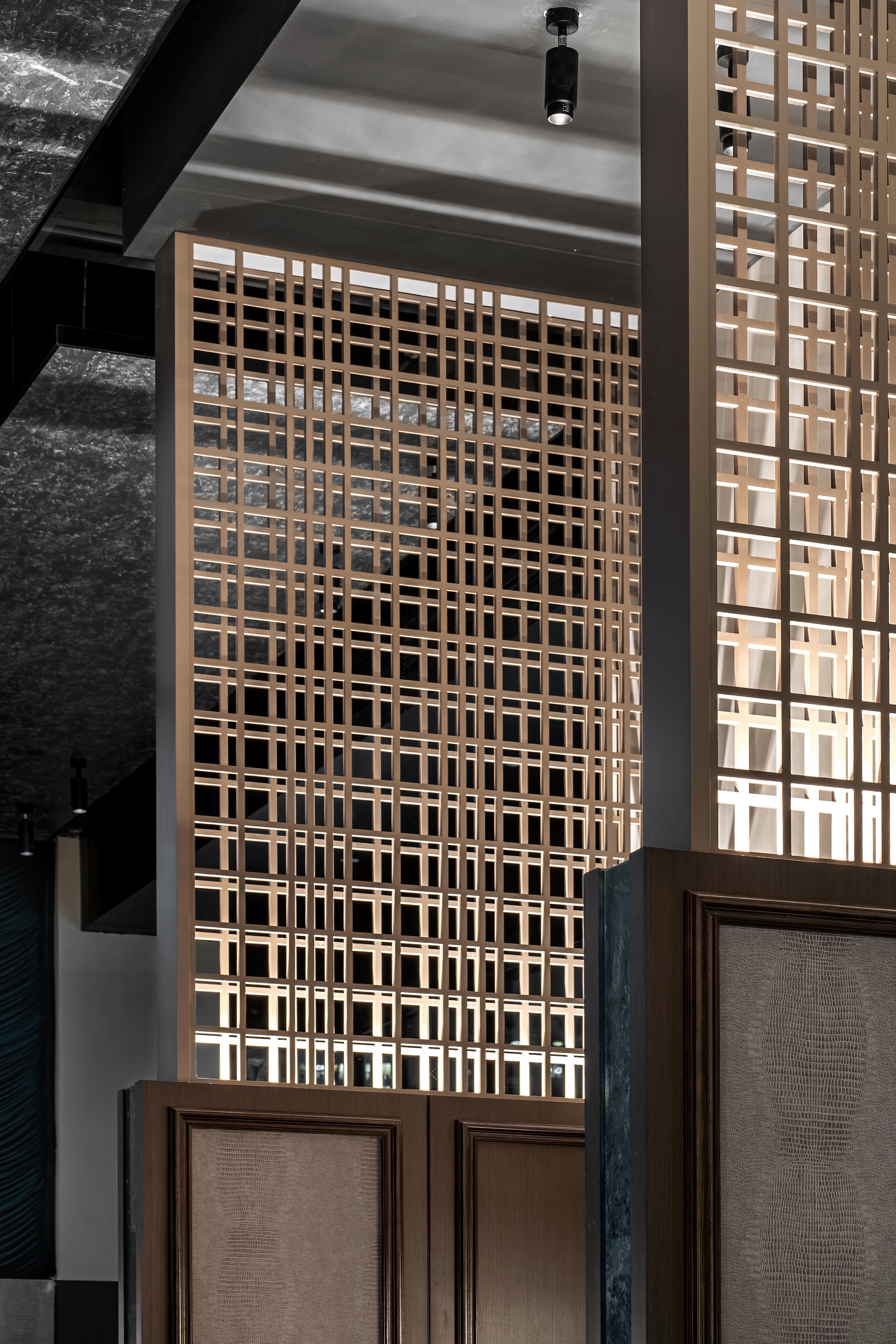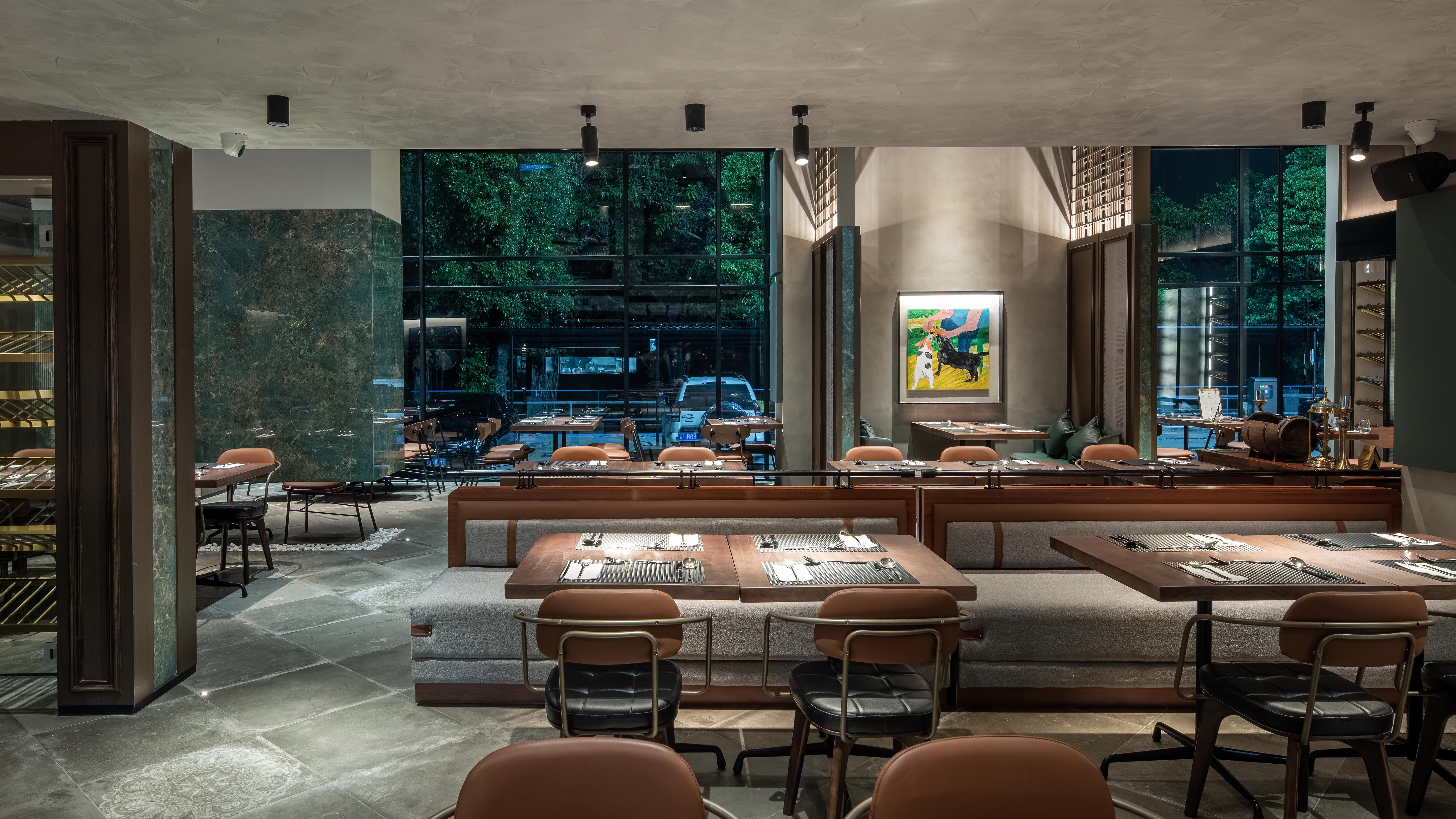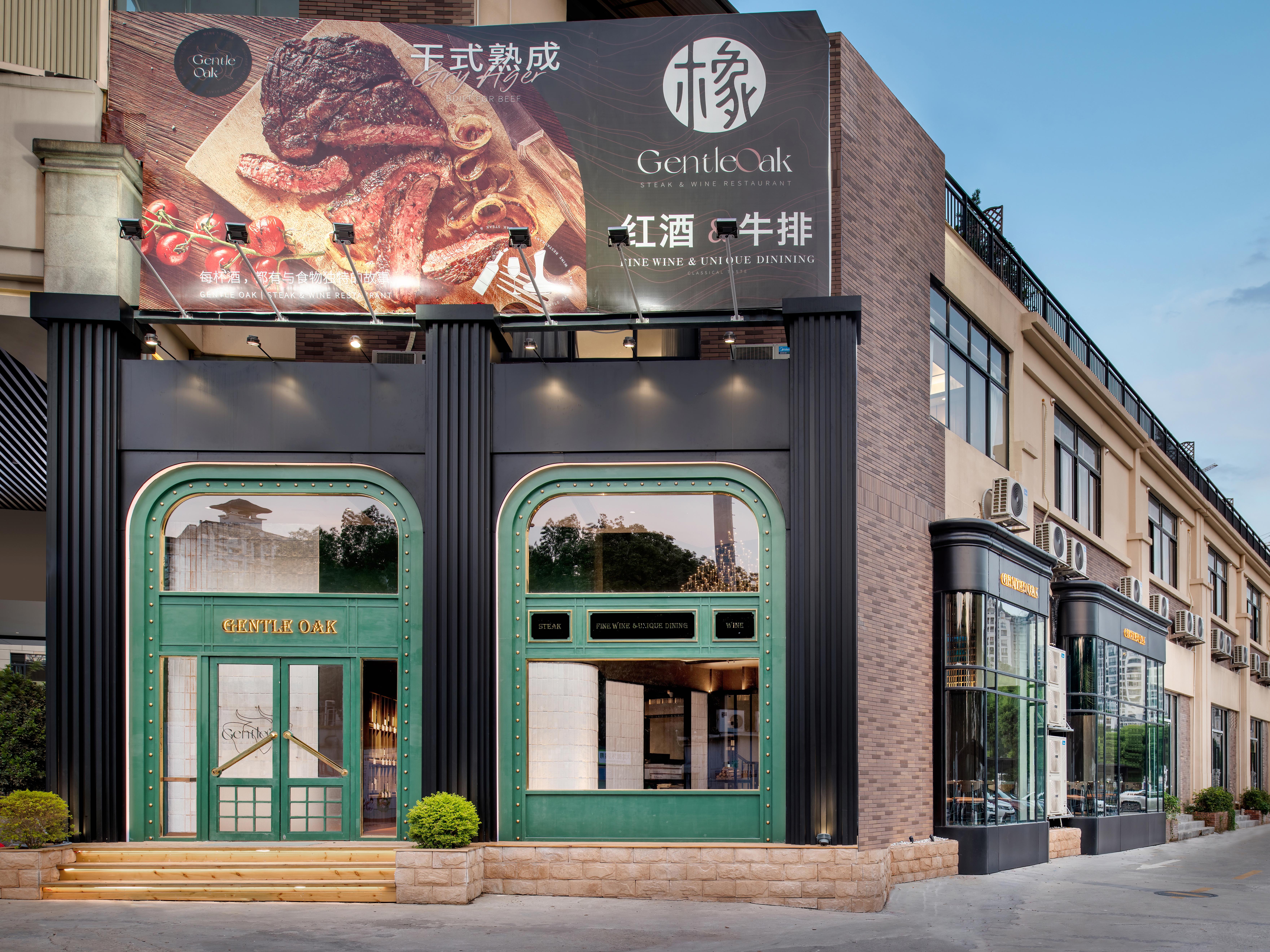 项目定位:项目地点位于番禺喜盈汇,是未来地铁上盖的热闹商区,我们试图在复杂且活跃的餐饮集中地定义一个新的西餐形式。我们希望通过材料、色彩和光线,营造舒适轻松且优雅有格调的场所氛围。利用空间布局和设计元素,提升消费者对于「干式熟成牛排」整体感受。