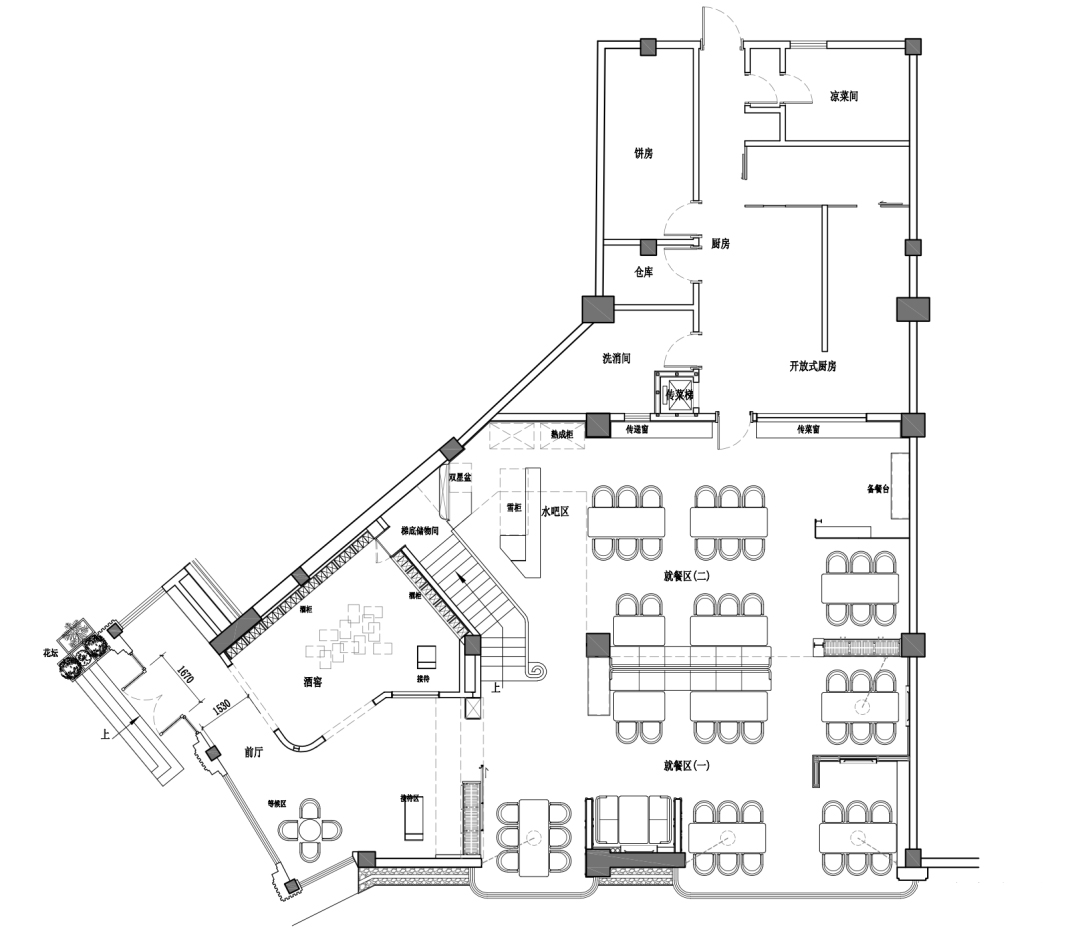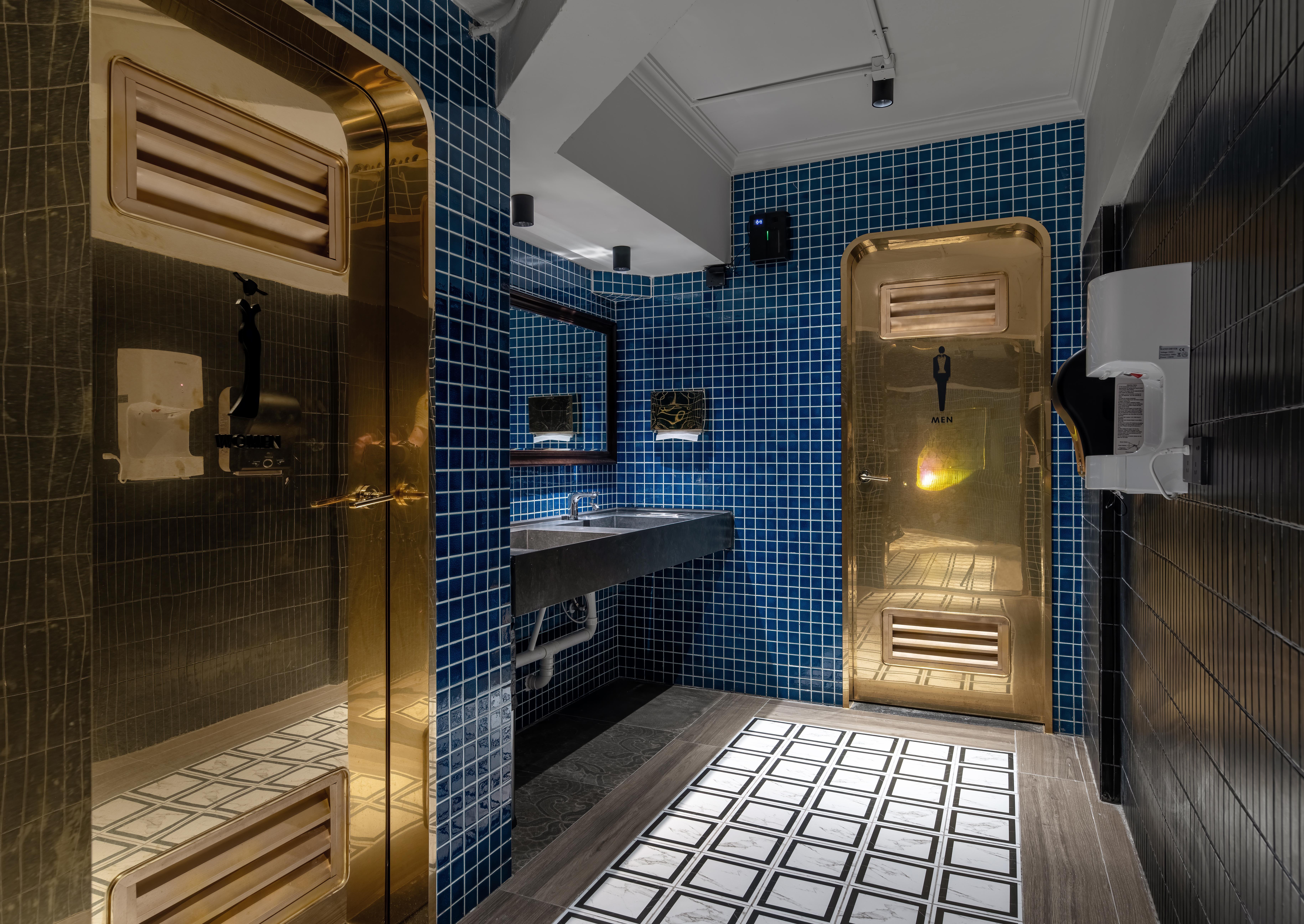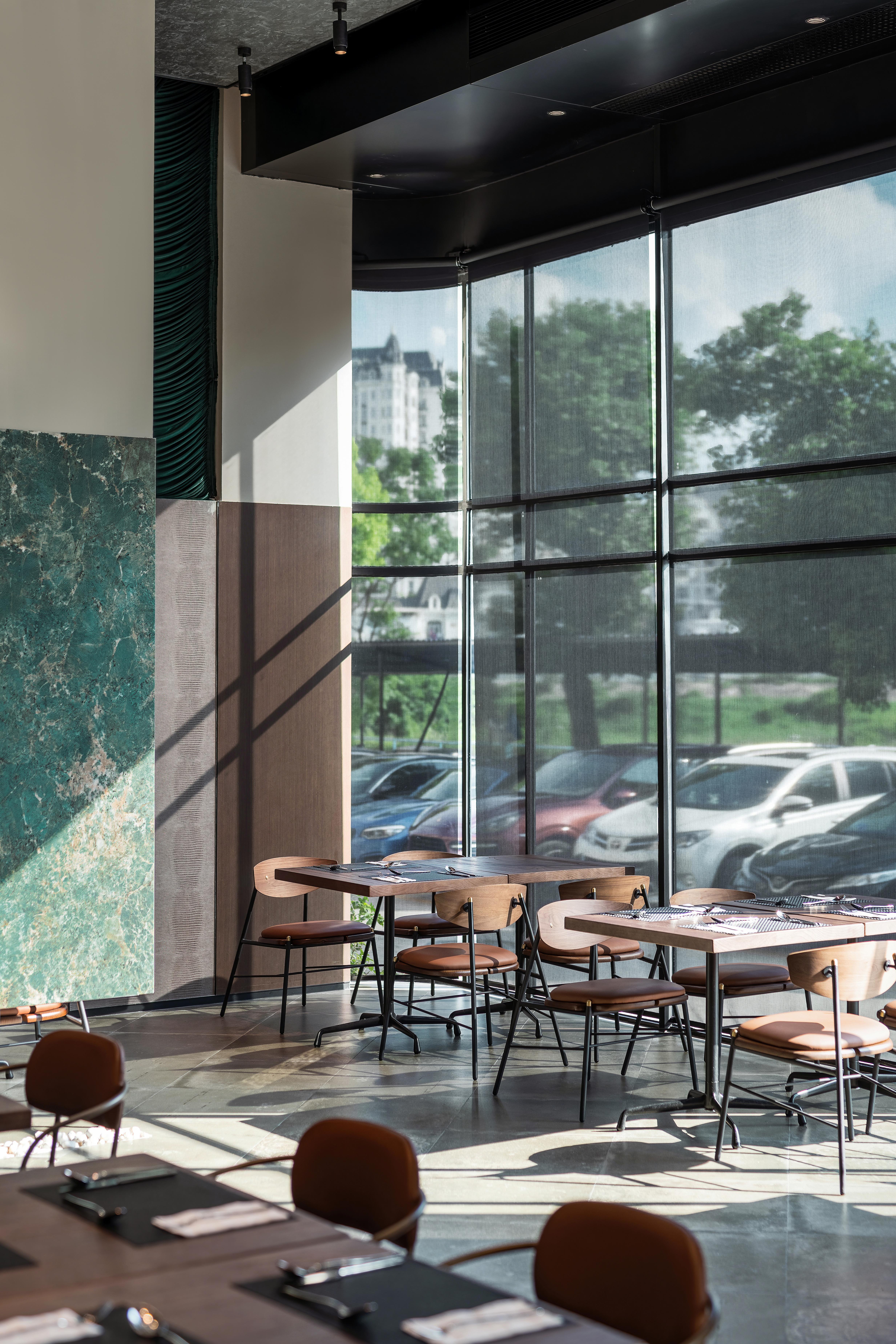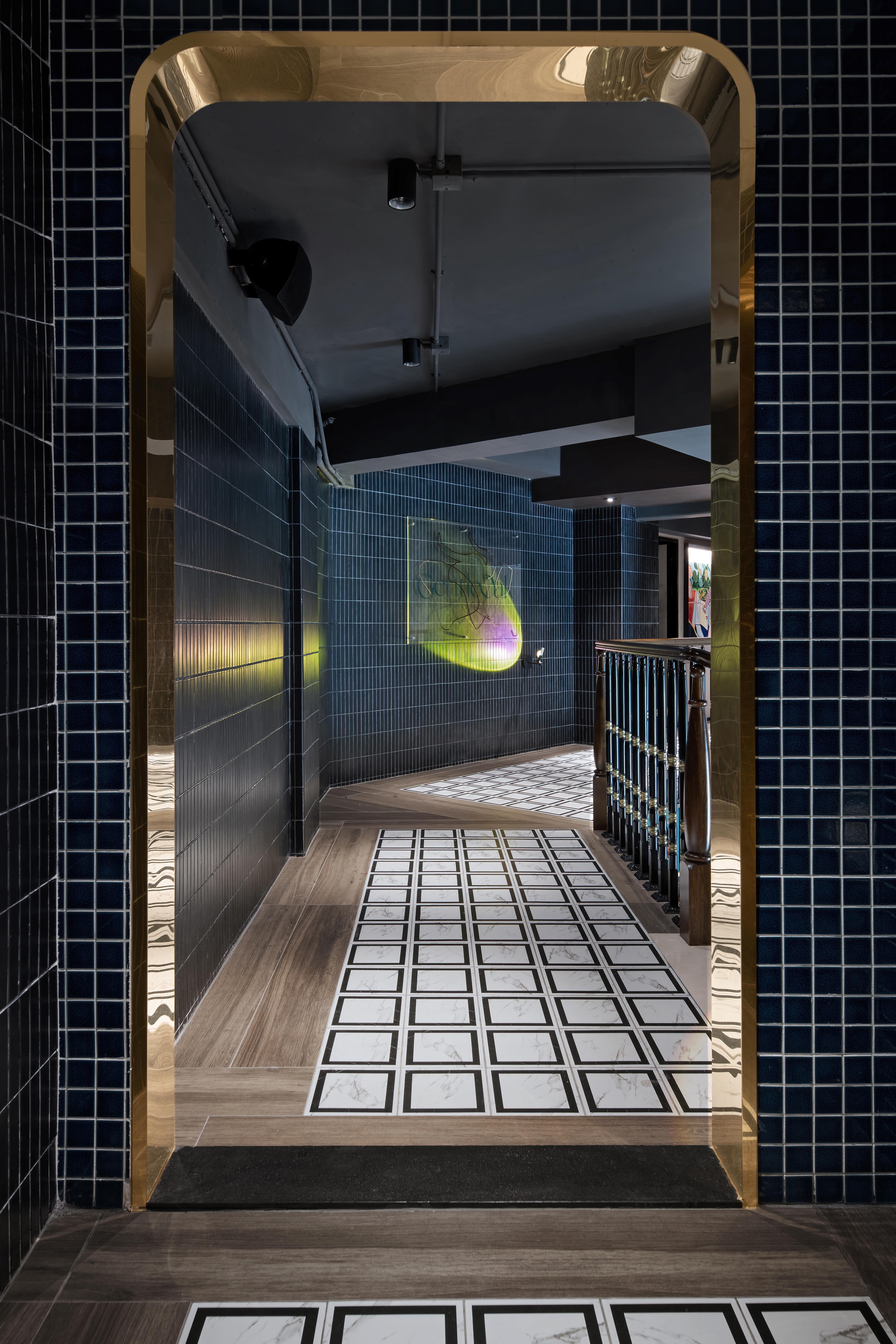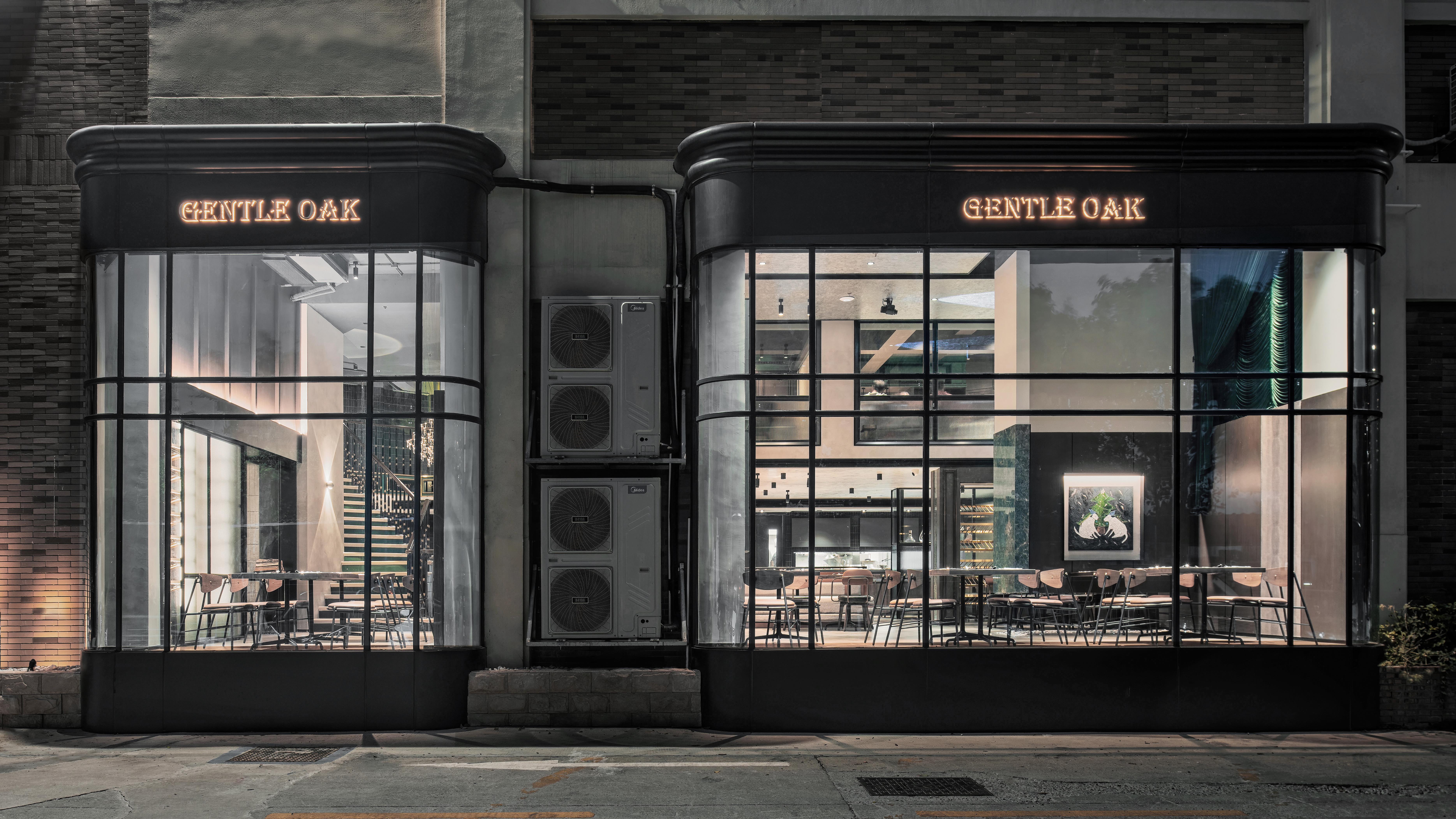 项目定位:项目地点位于番禺喜盈汇,是未来地铁上盖的热闹商区,我们试图在复杂且活跃的餐饮集中地定义一个新的西餐形式。我们希望通过材料、色彩和光线,营造舒适轻松且优雅有格调的场所氛围。利用空间布局和设计元素,提升消费者对于「干式熟成牛排」整体感受。