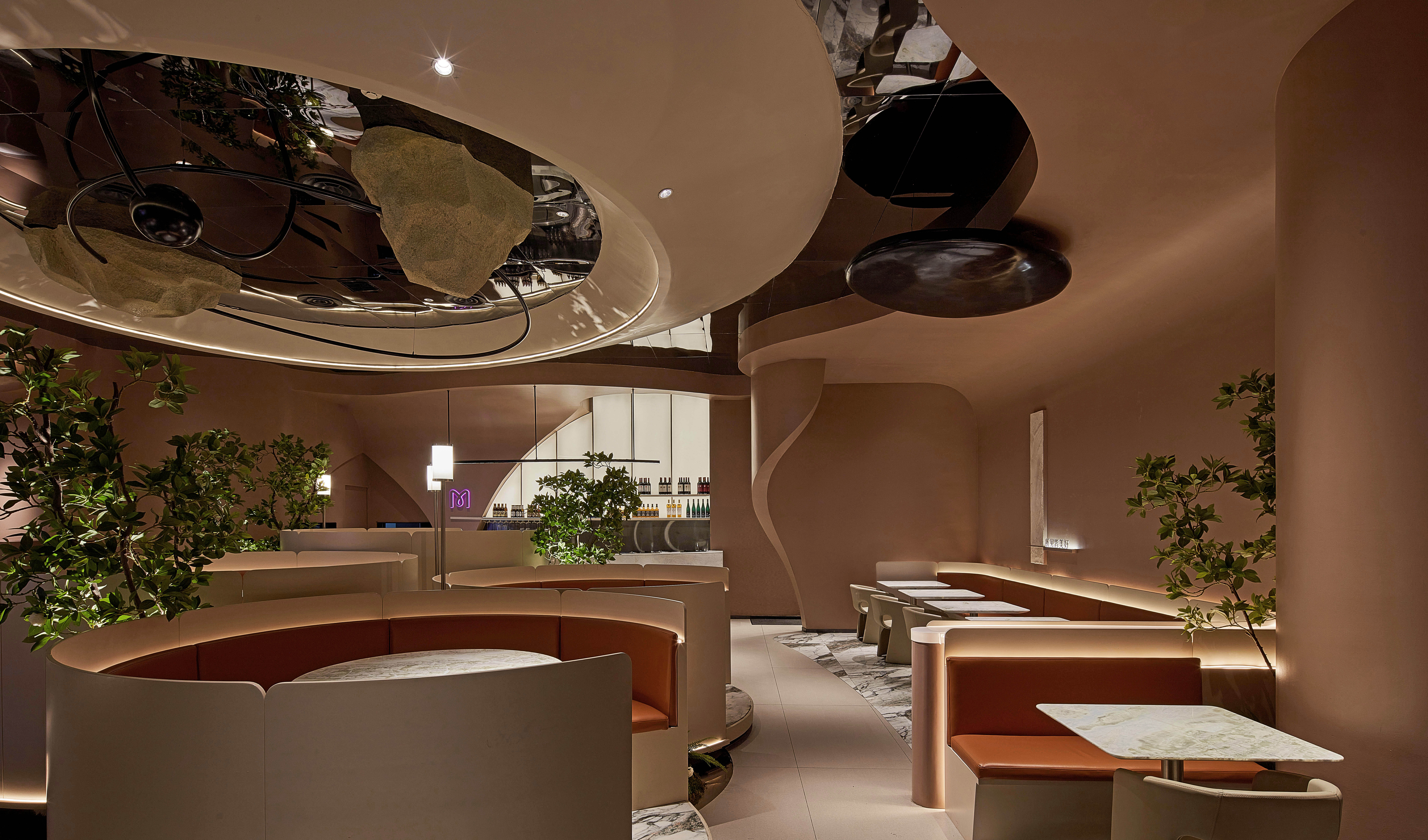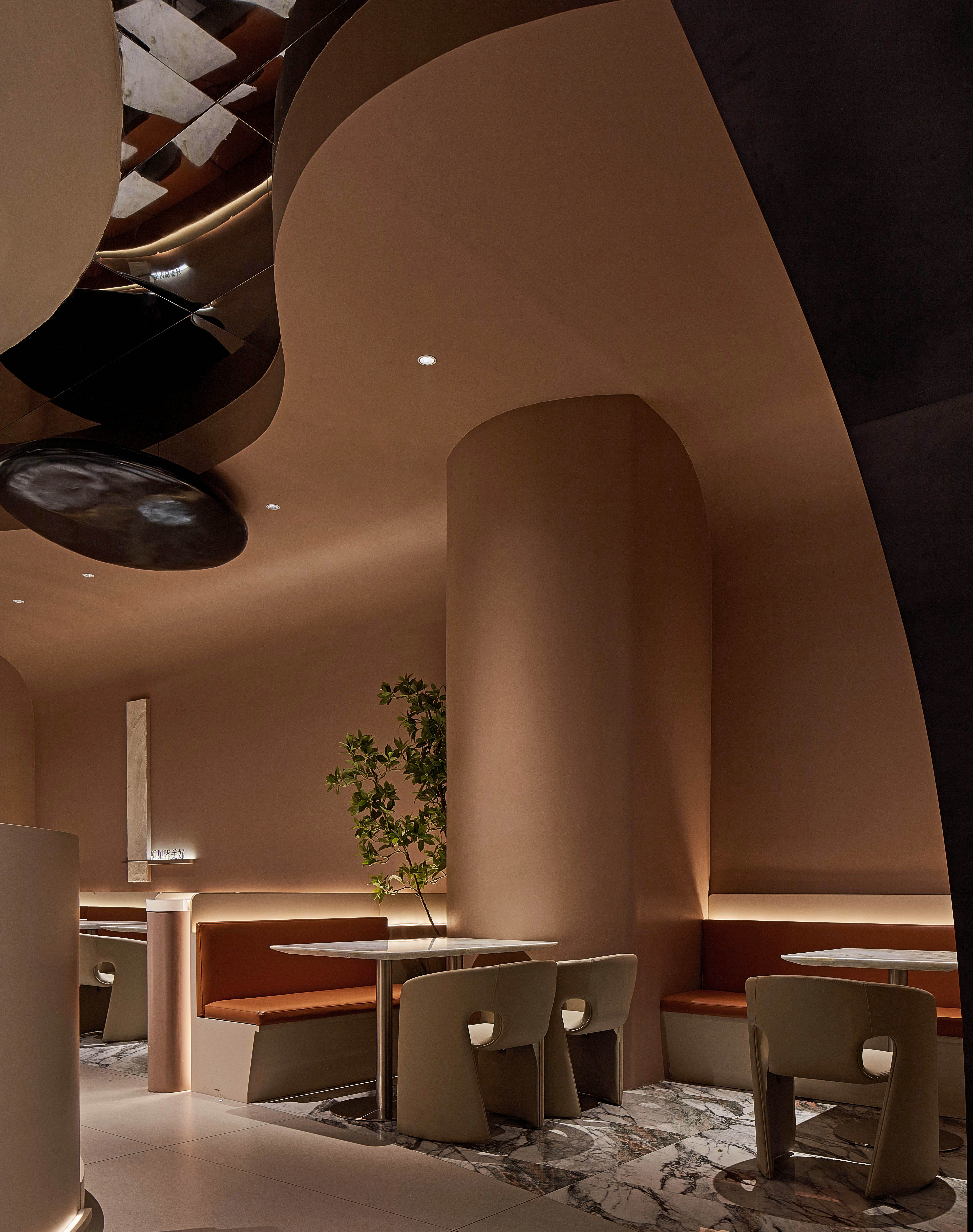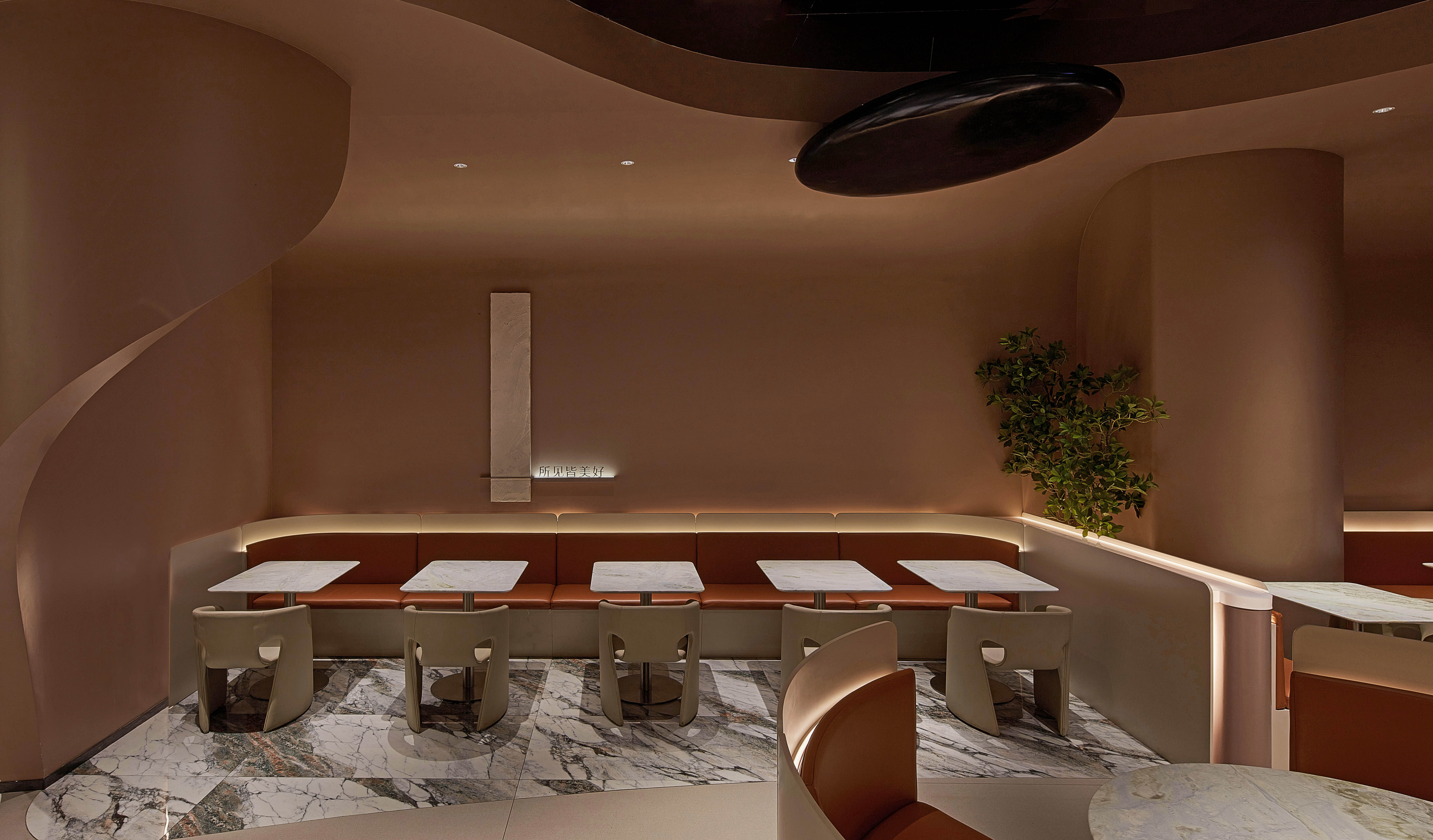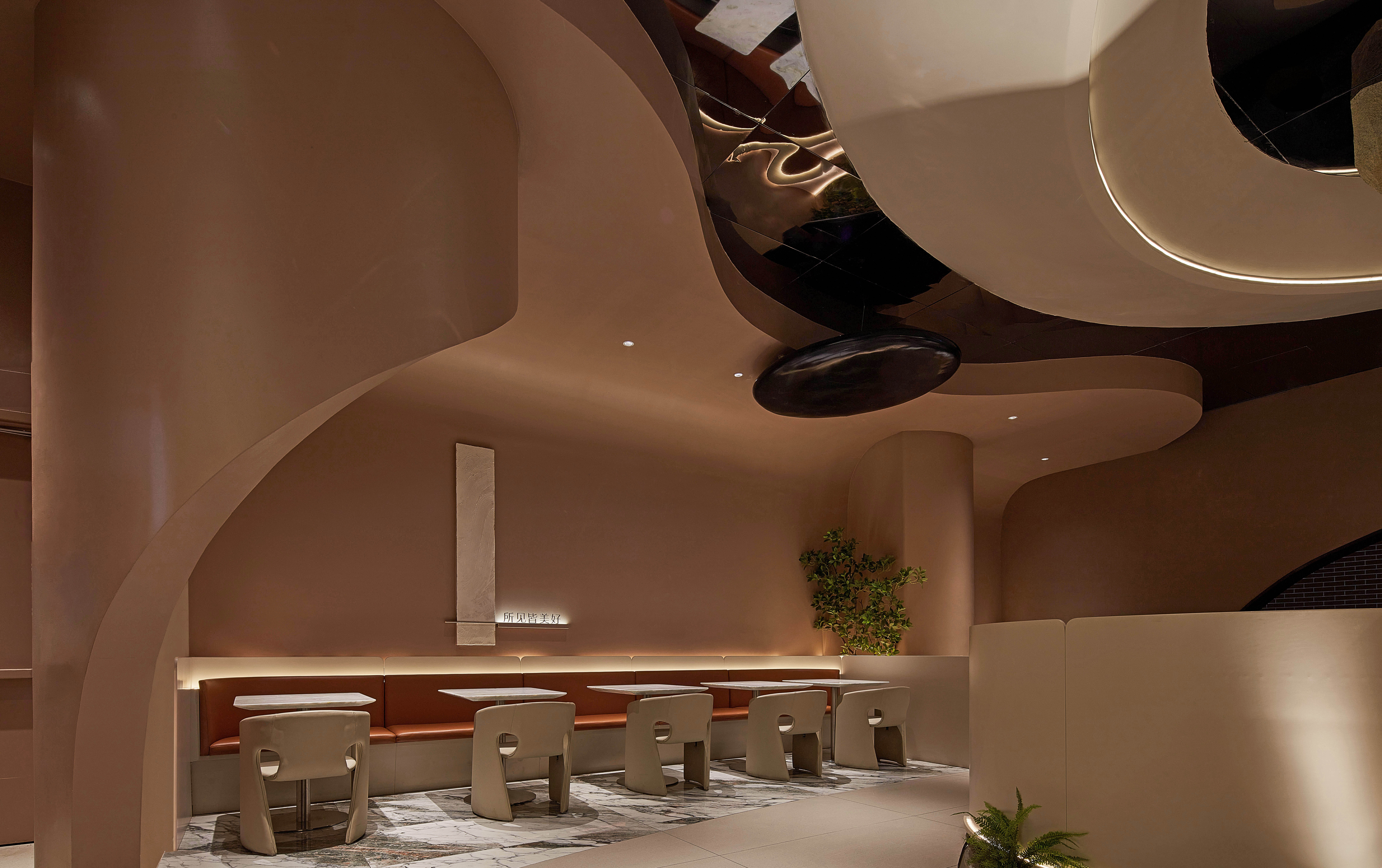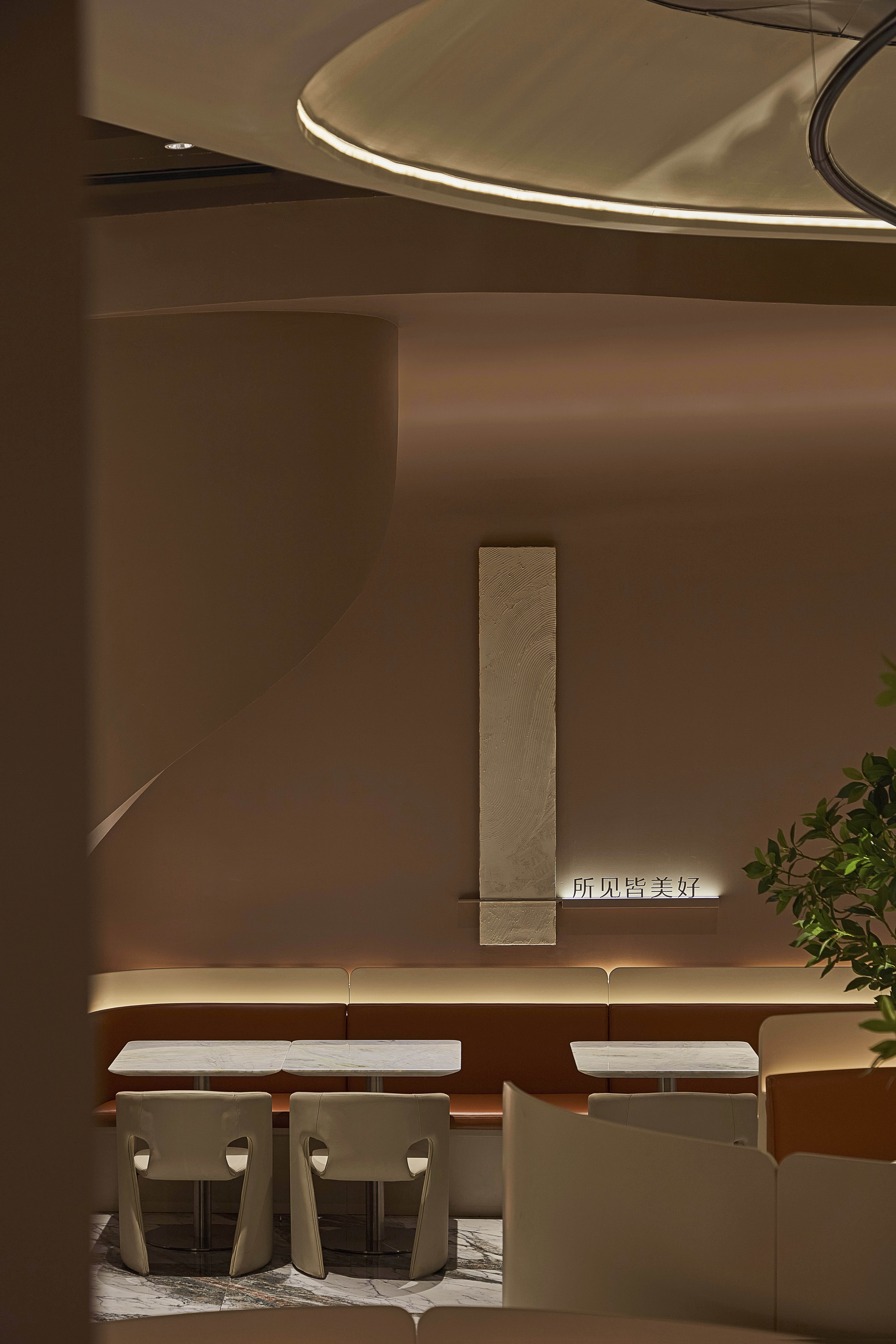 项目定位:抽象化的情感,转化为能够感知的空间,以曲线造型的感性与流动,为规整的餐厅空间带来变化,营造出一种深刻记忆中的视觉印象和心灵体验,直达心底。