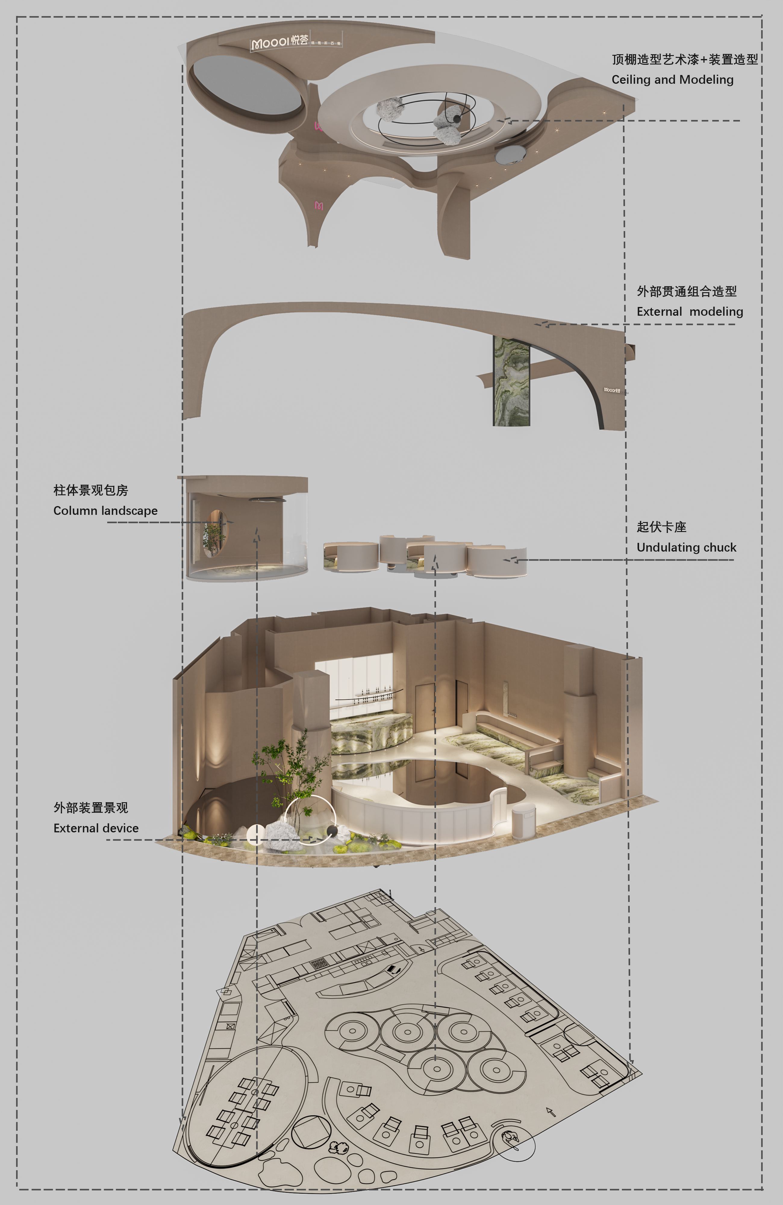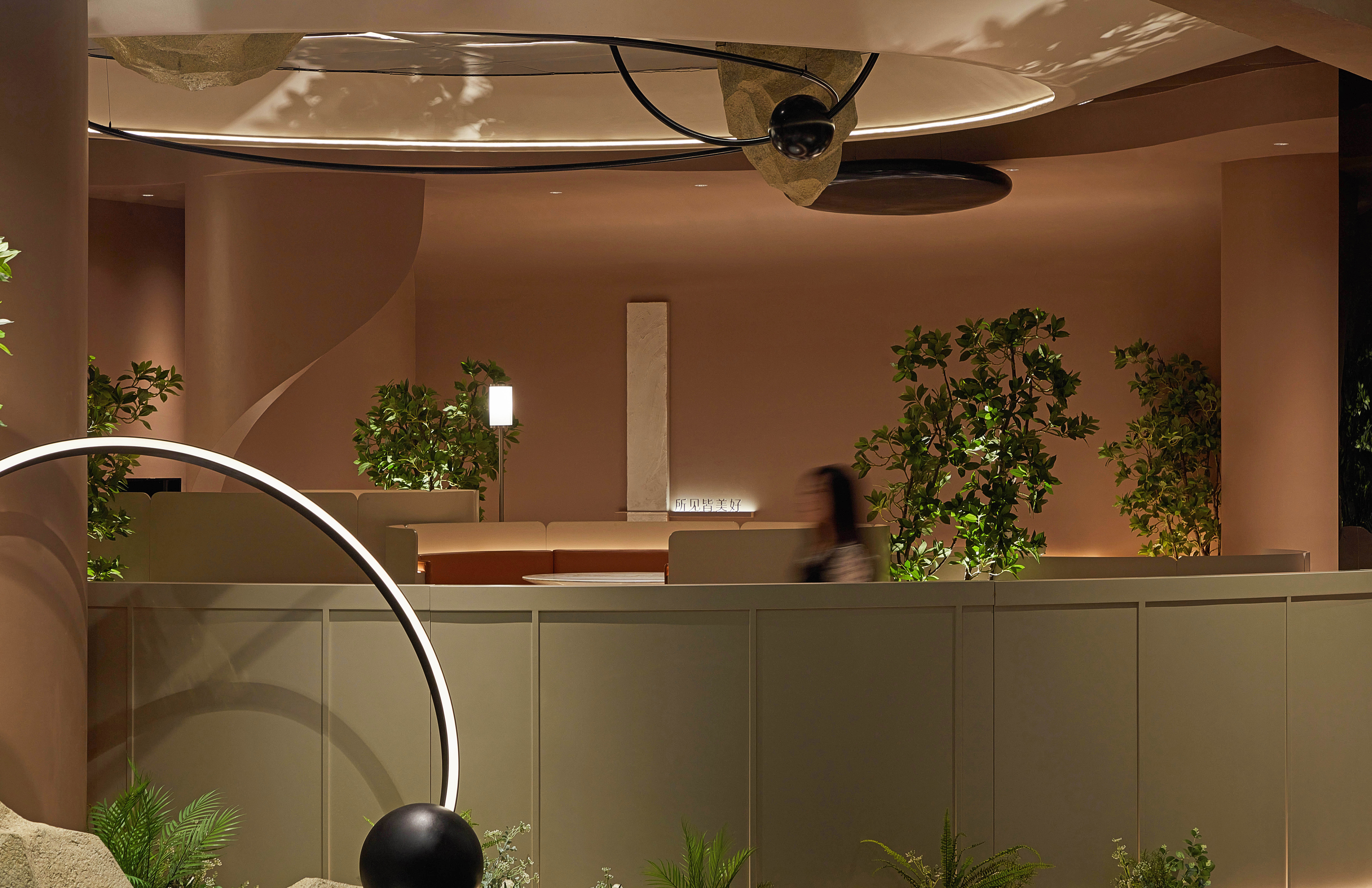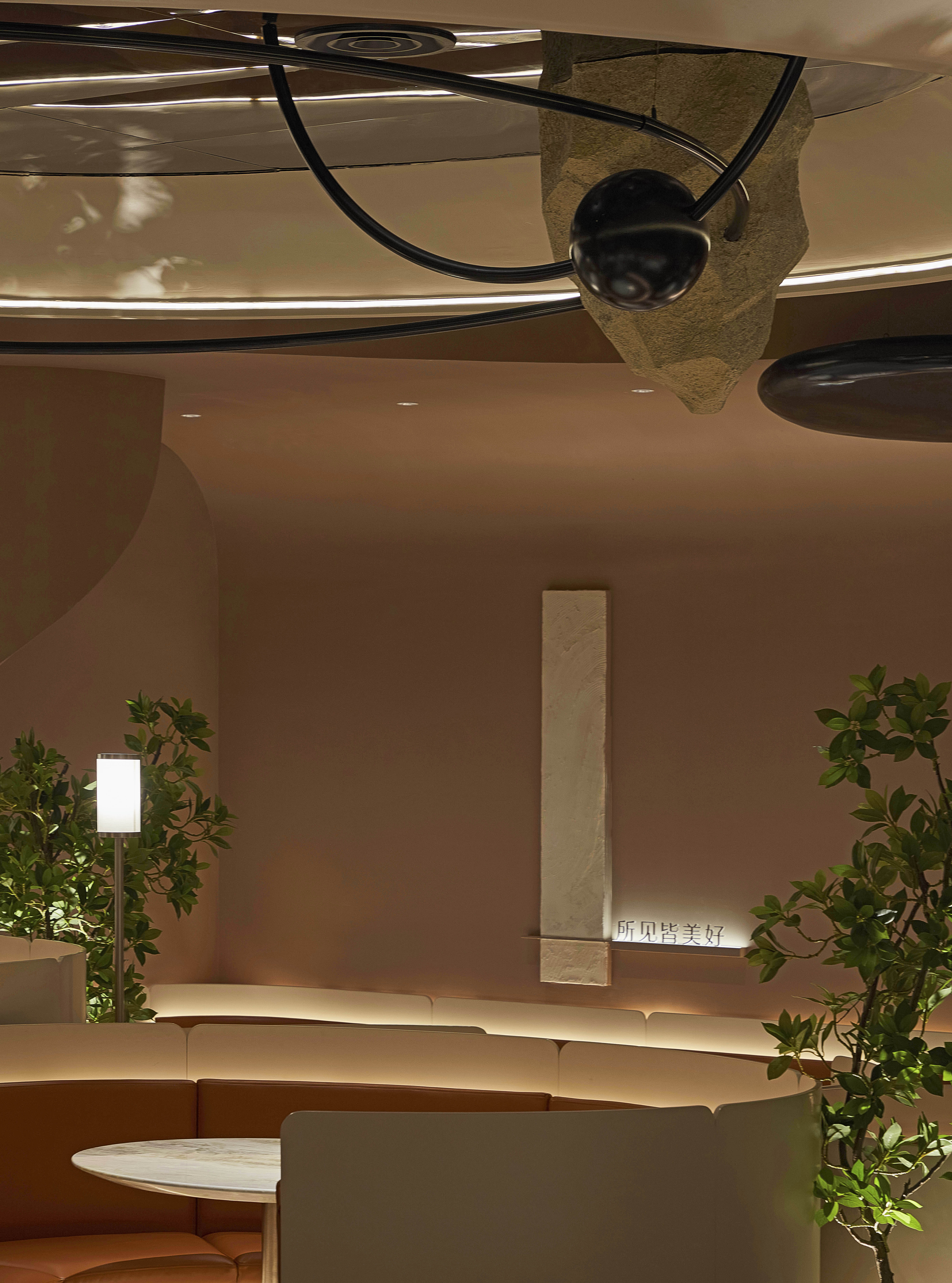 空间意境:漂浮感建筑体让餐厅穿越时空,向人们昭示一种超越日常的美好。设计以“太空”为起点,融入场地、延续宇宙的线索,共同营造内外一体的时光漫游。