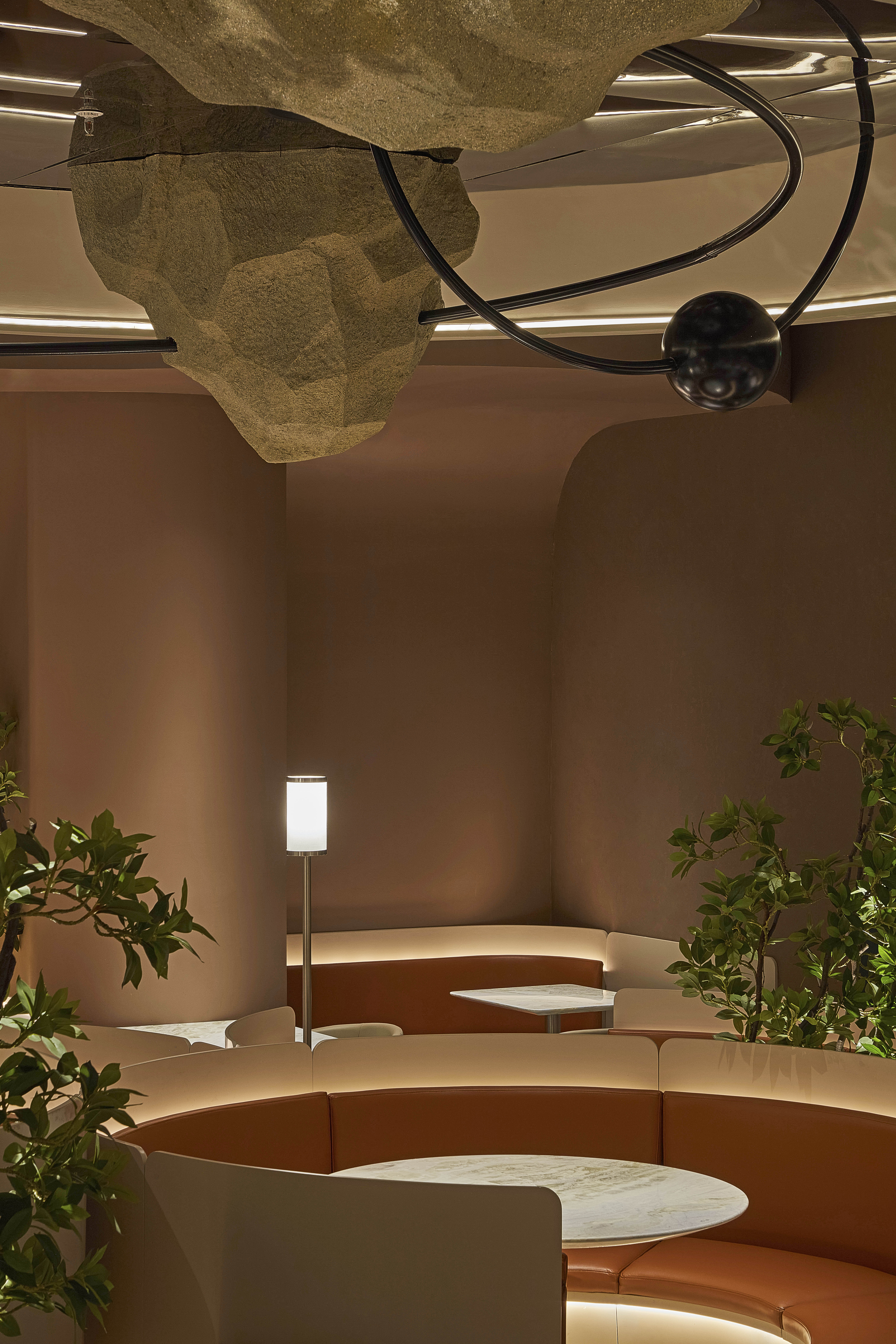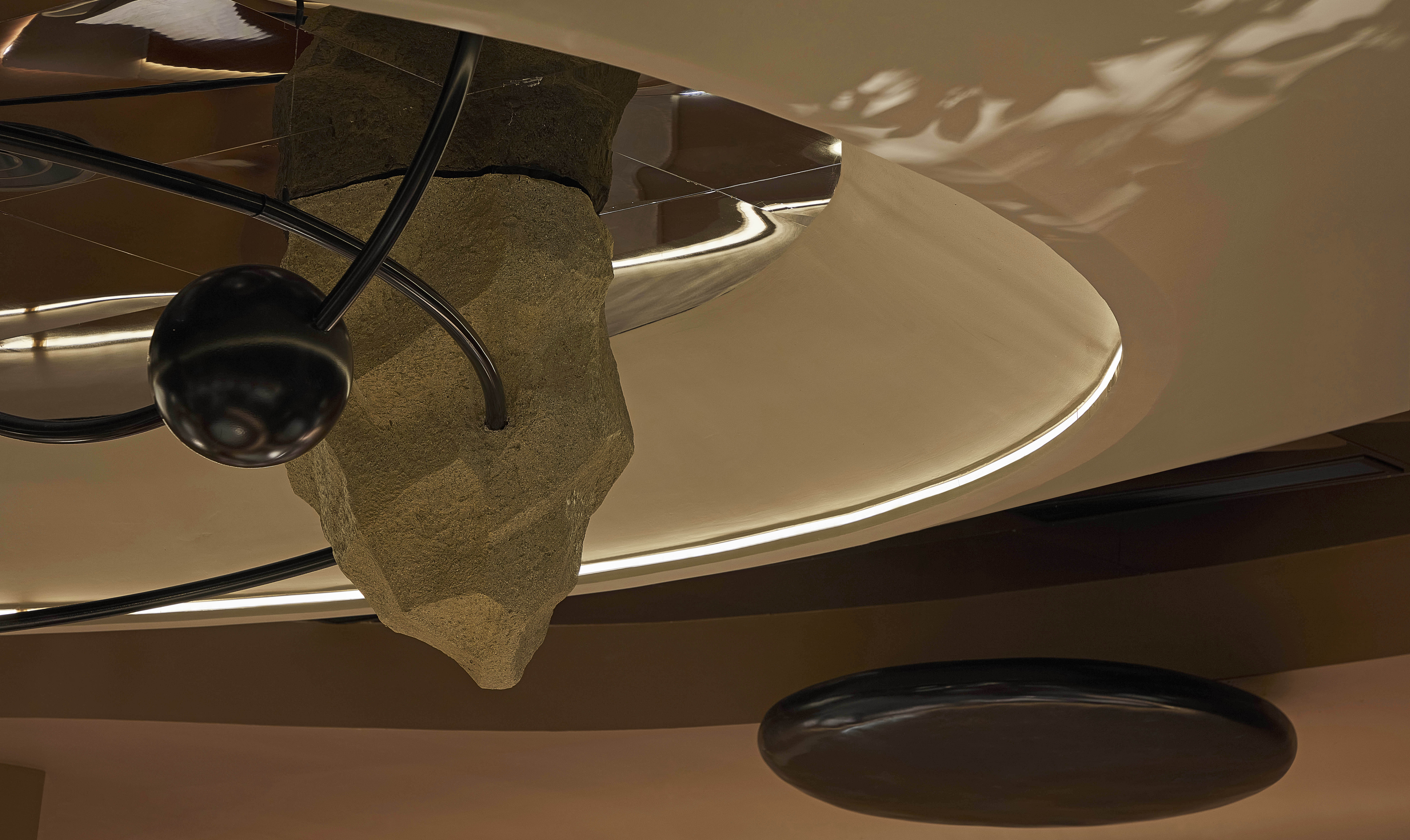 2、在垂直向度,半球形的天花以圆形与卡座区轮廓相对,如同星球运行的痕迹,记录着陨石碎片随机的、无序的运行轨迹,空间因此被“激活”。 -