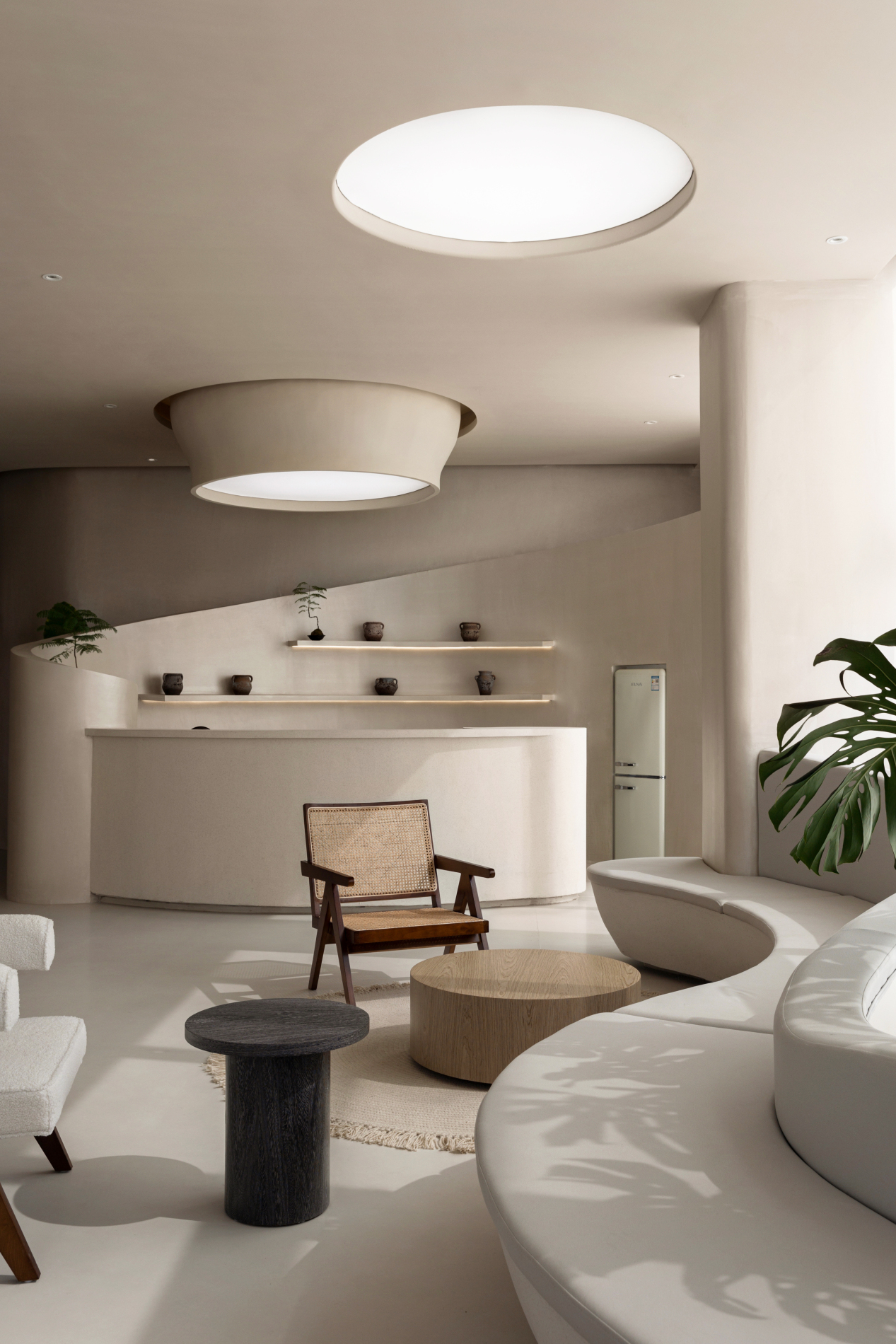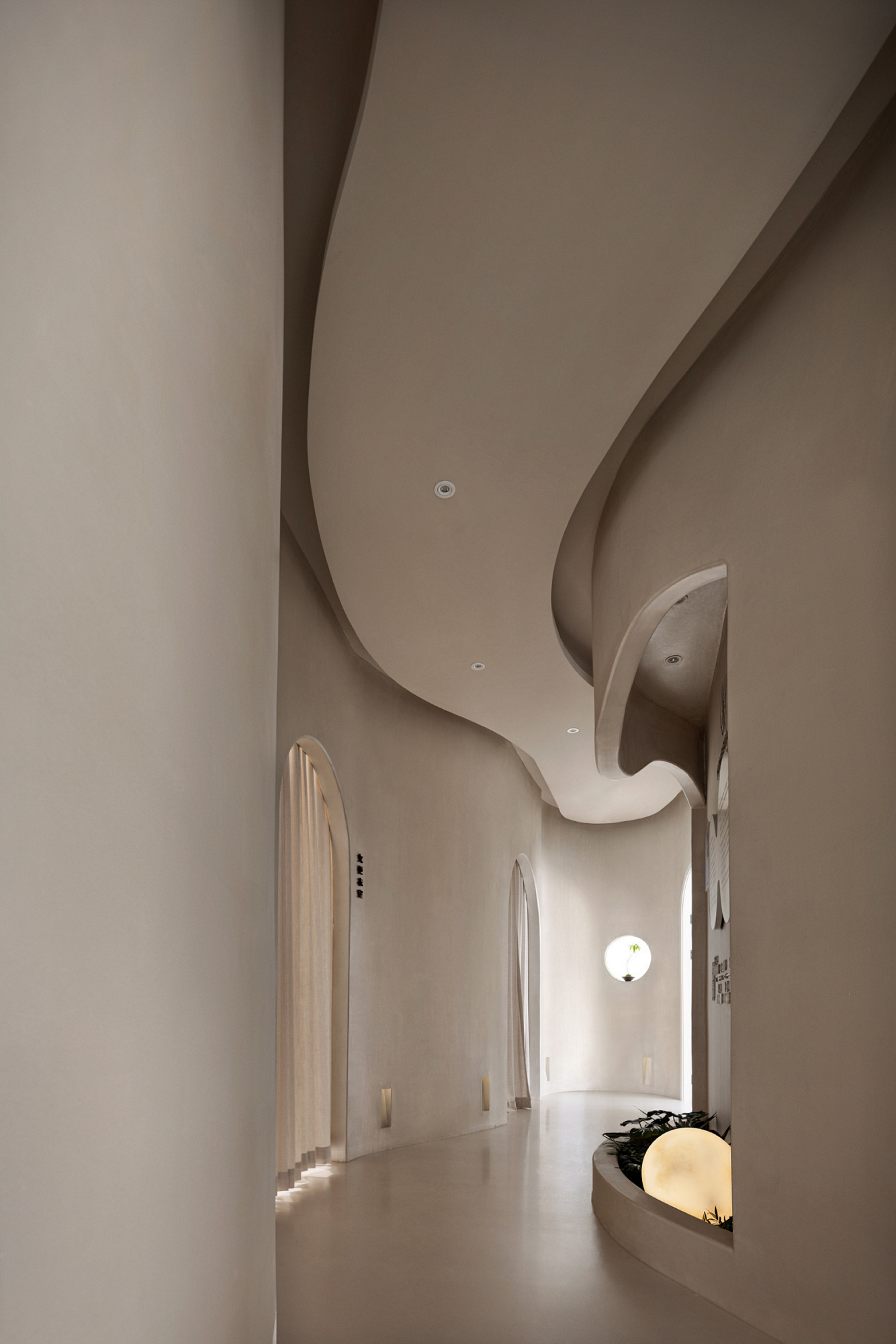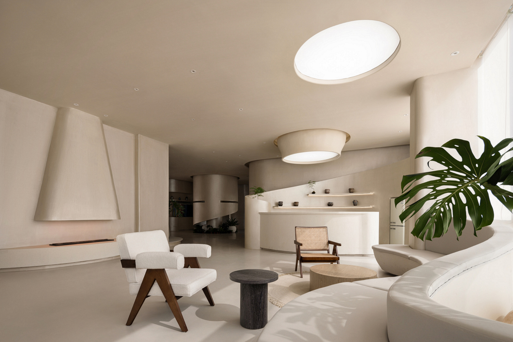 空间意境:返璞归真,诧寂风格,至简克制的表达;注重能量和氛围感的营造,大面积运用曲线元素和造型,柔美的空间,搭配干净素雅的色系。