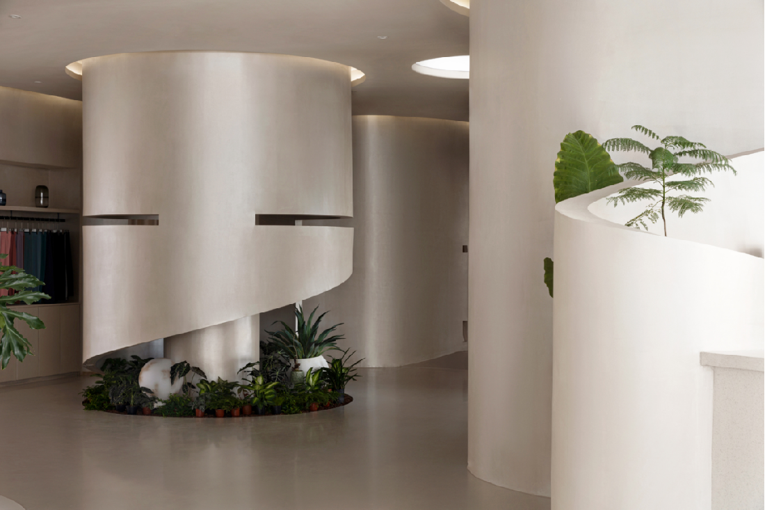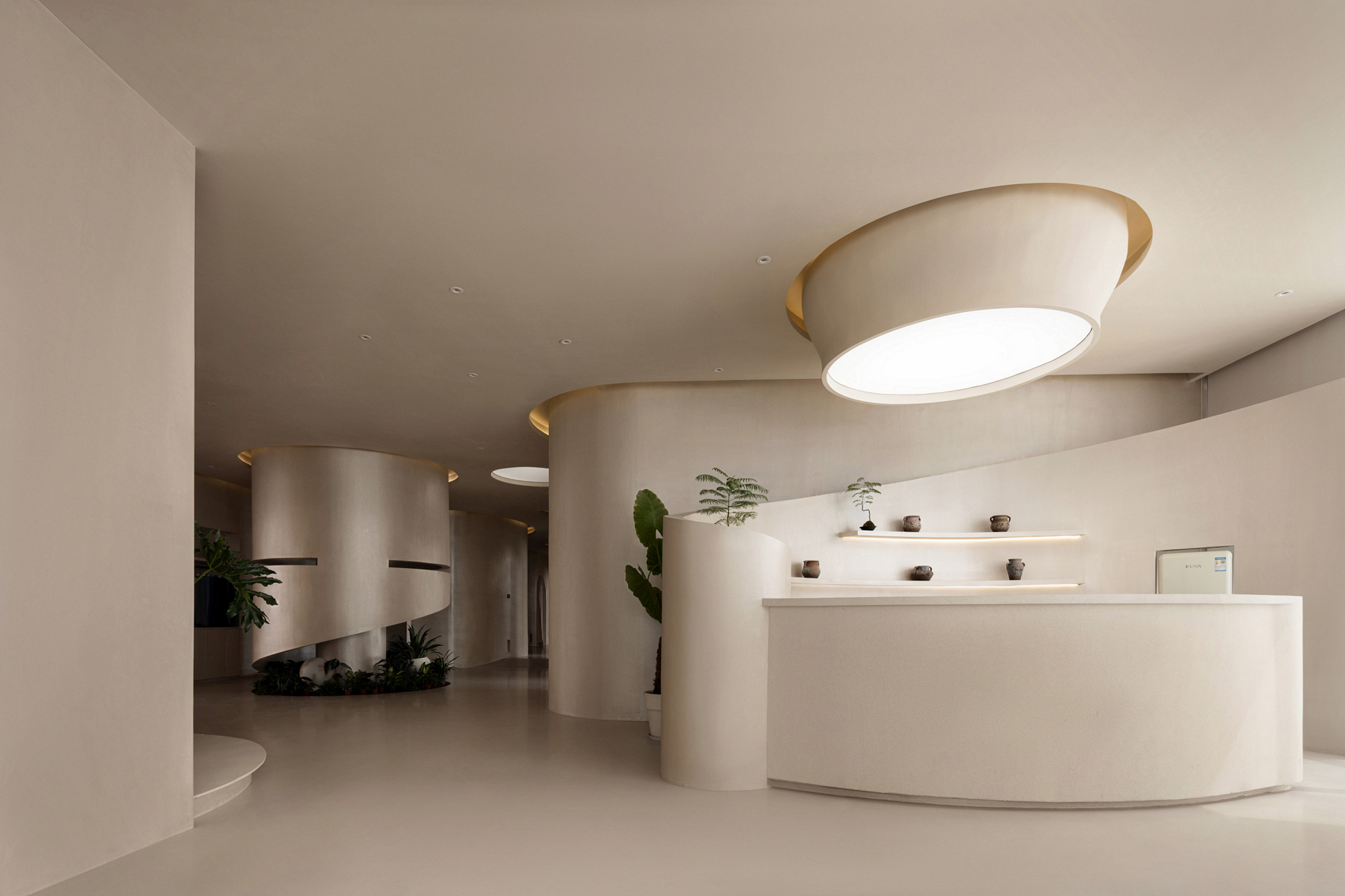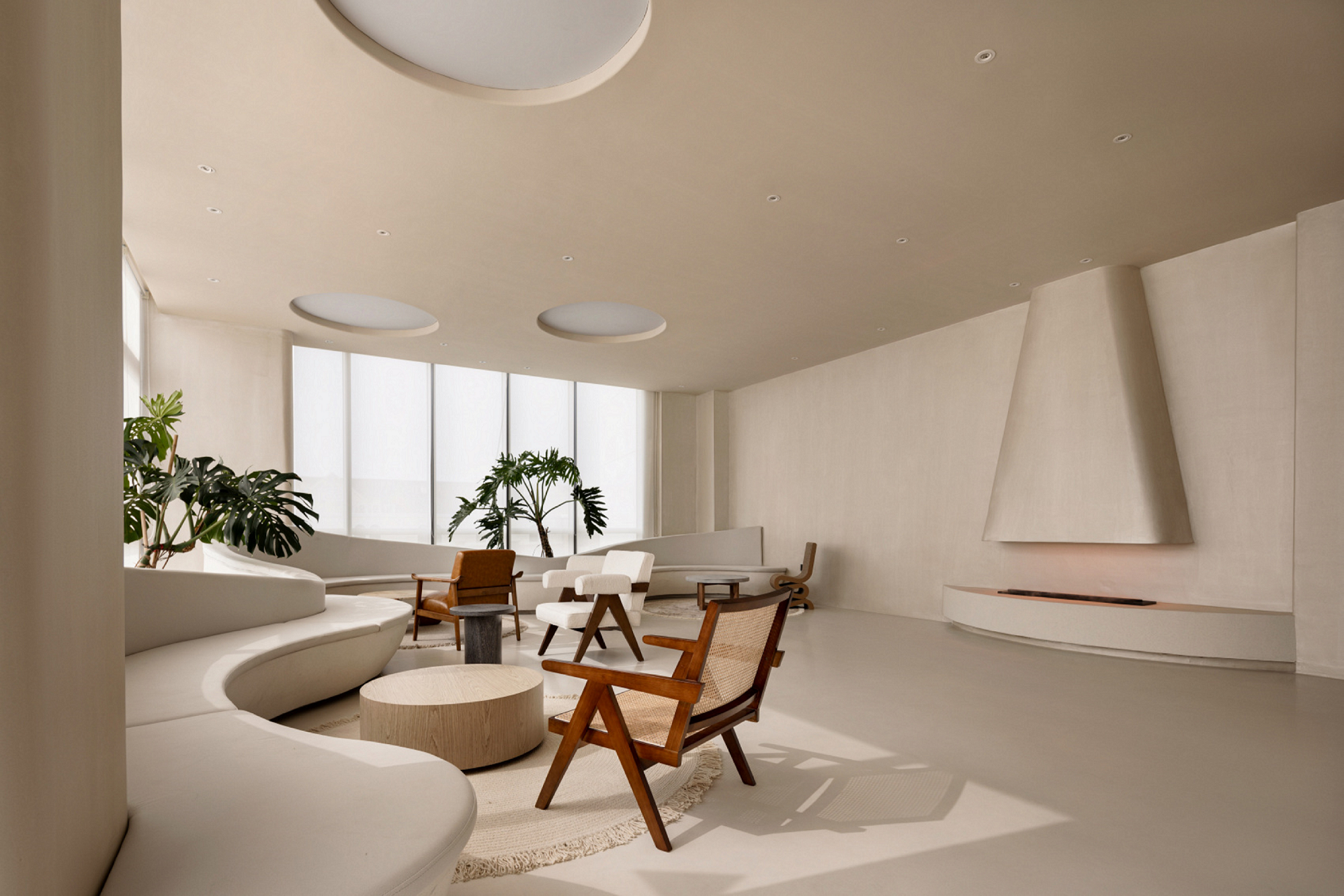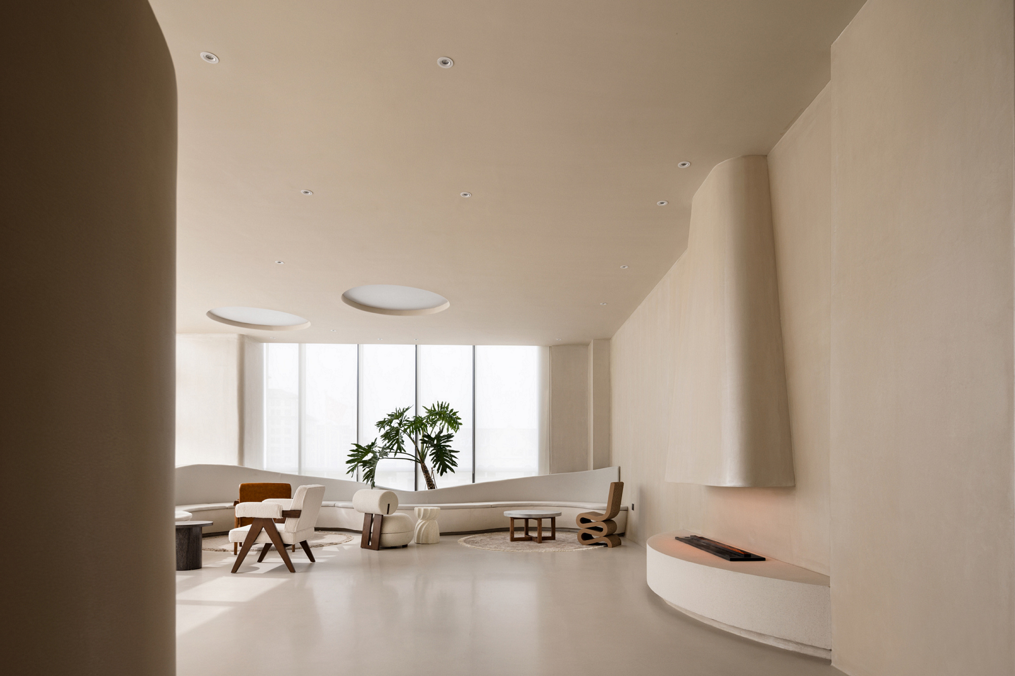 空间意境:返璞归真,诧寂风格,至简克制的表达;注重能量和氛围感的营造,大面积运用曲线元素和造型,柔美的空间,搭配干净素雅的色系。