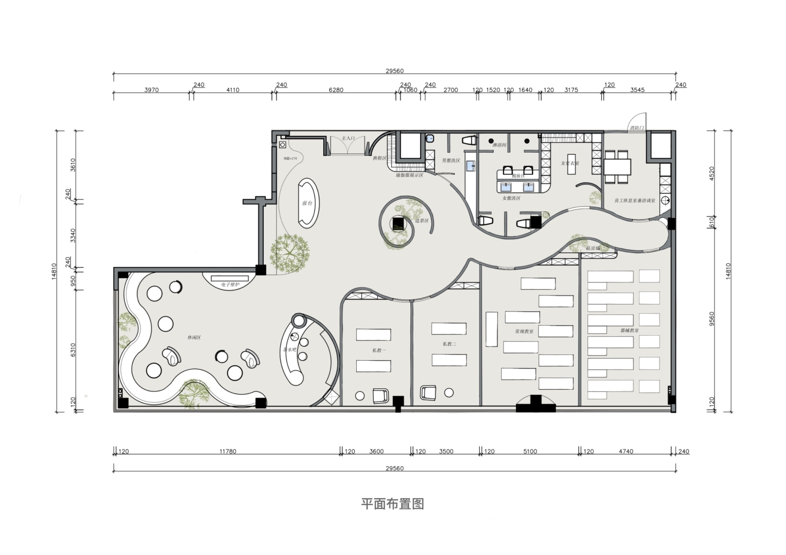 3、休闲区和茶水吧融为一体,打开空间,增加了两个功能的互动性,去掉传统的沙发,沿着窗户定制一大排蜿蜒曲折的休闲卡座,阳光和树影洒落在布艺坐垫上的那种宁静,可以让人暂停脚步,水吧台的环抱造型,与卡座相呼应,呈现出无限包容感,给会员创造深度放松的体验空间。 -