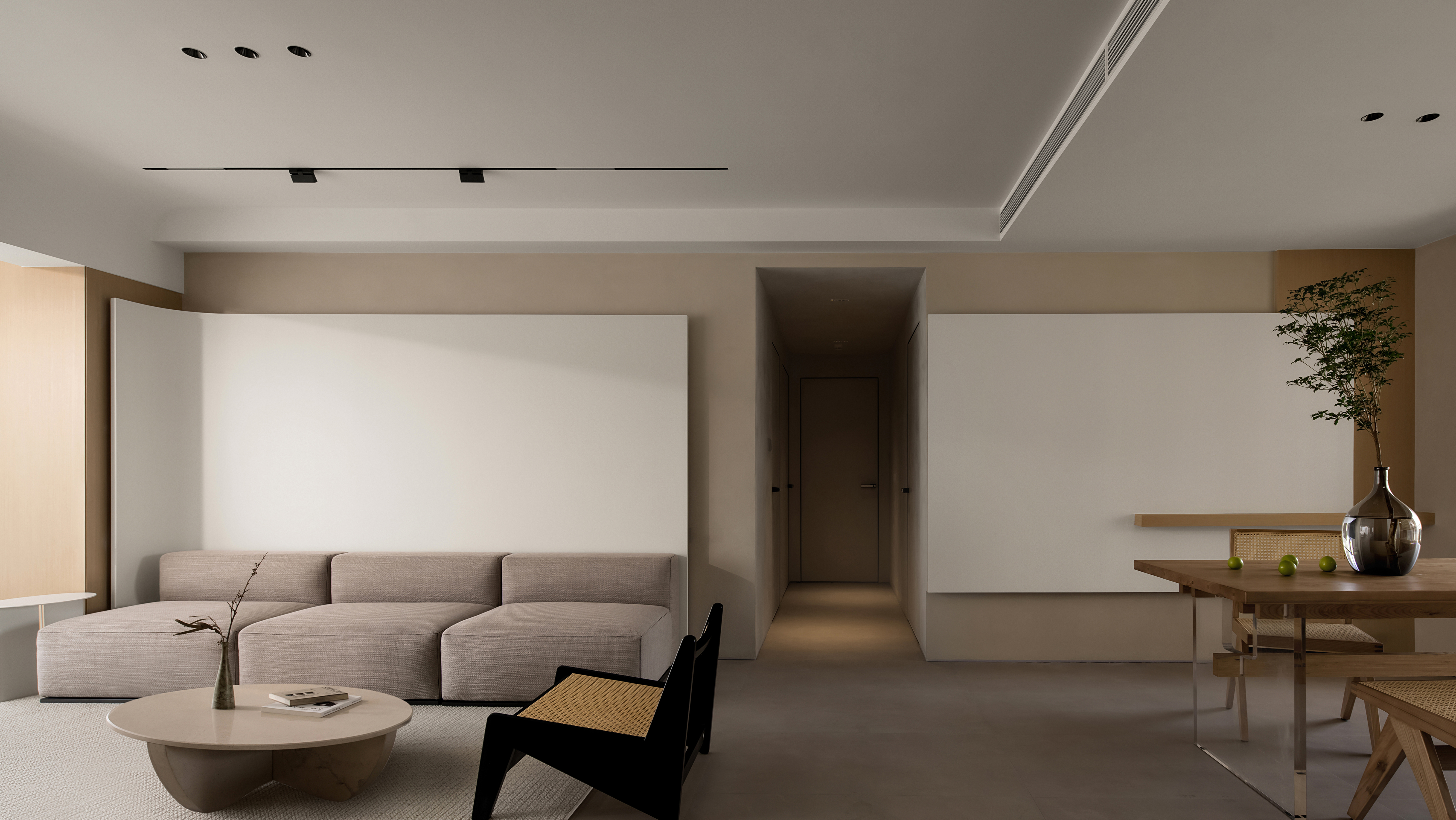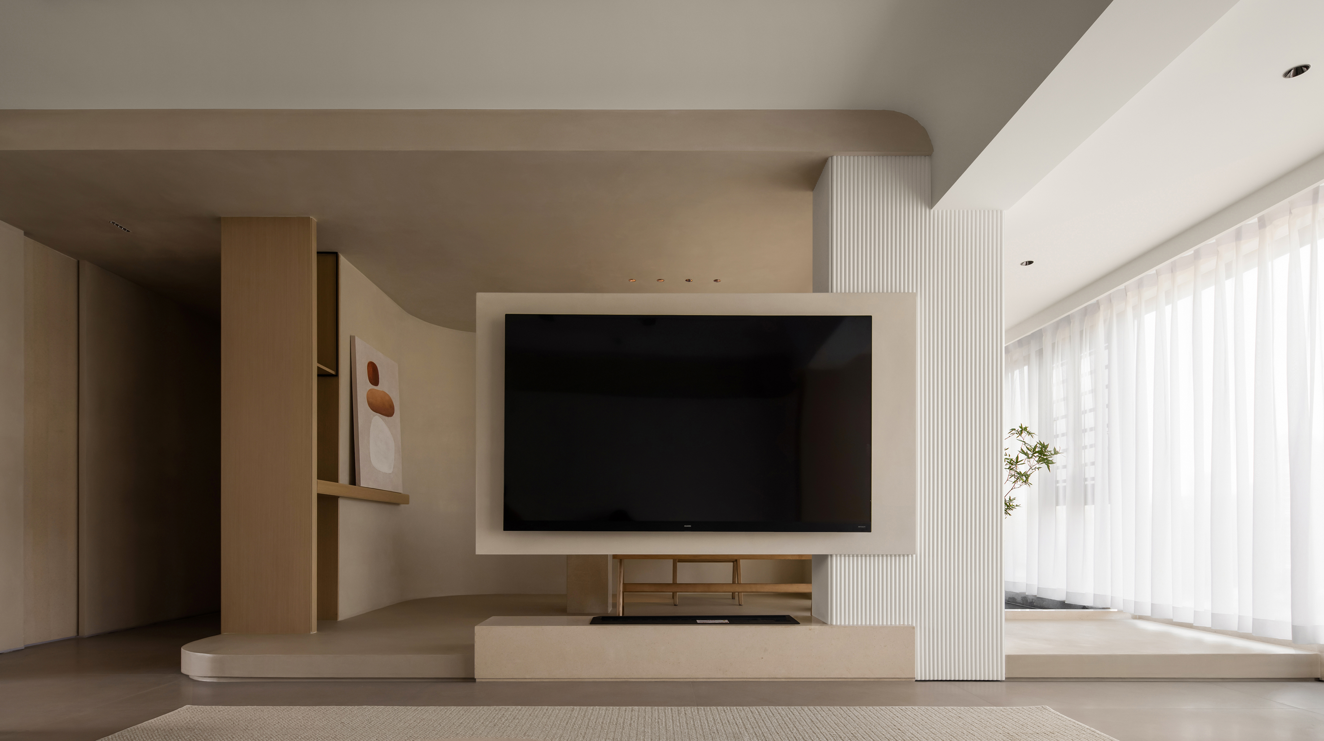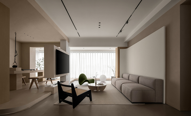 空间布局:空间布局主要以打破原有空间界限,让玄关区、品茶区、造景区以及买这个房子最大的自然机关相连,客厅跟茶室也有较好的视觉延伸,环形动态让不大的房子没什么隔档,体验更舒适。
