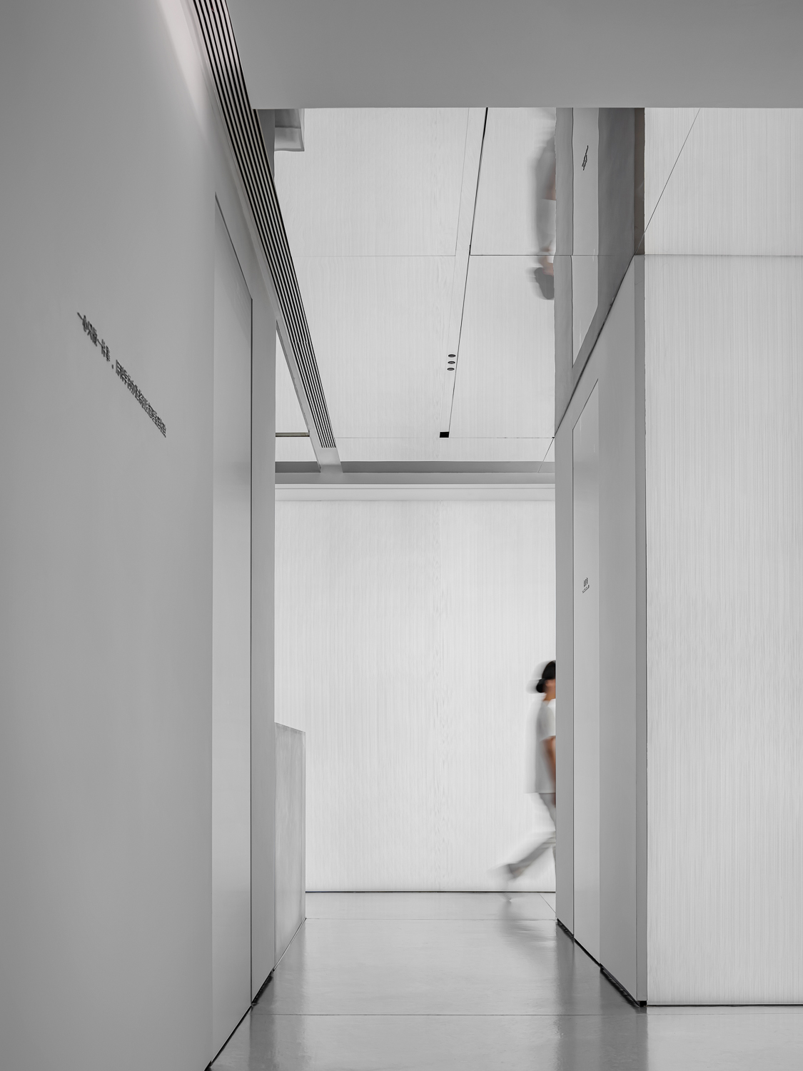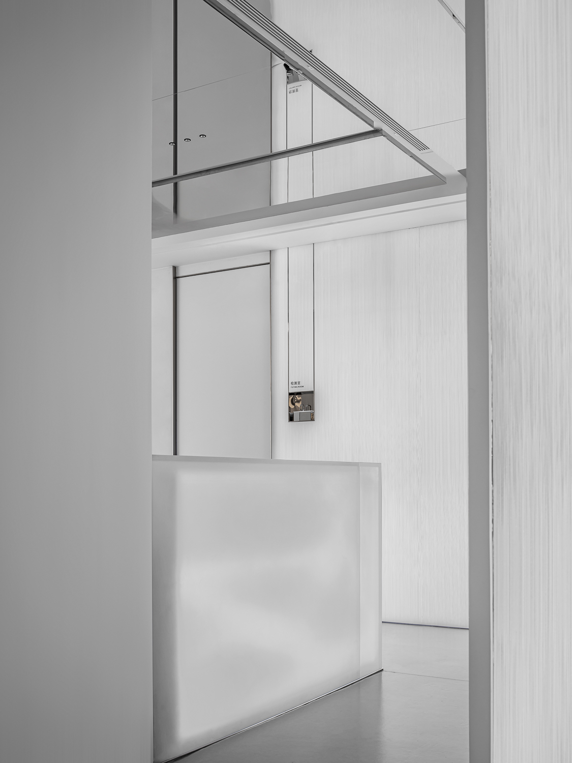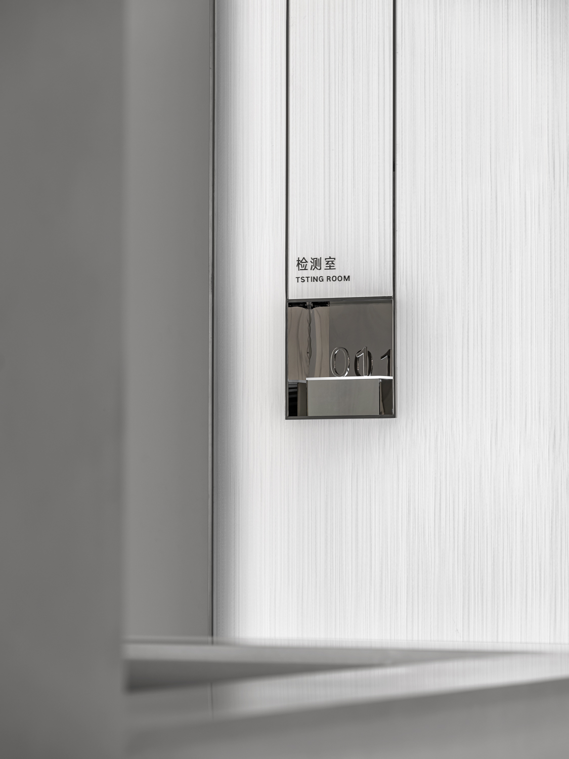 空间中所有房间均不设置门锁及拉手,通过闭门系统、门禁系统、智能系统共同协调完成控制,进入房间时工作人员通过门卡识别开门,门禁系统隐藏于门标导示中,功能与美学完美结合。