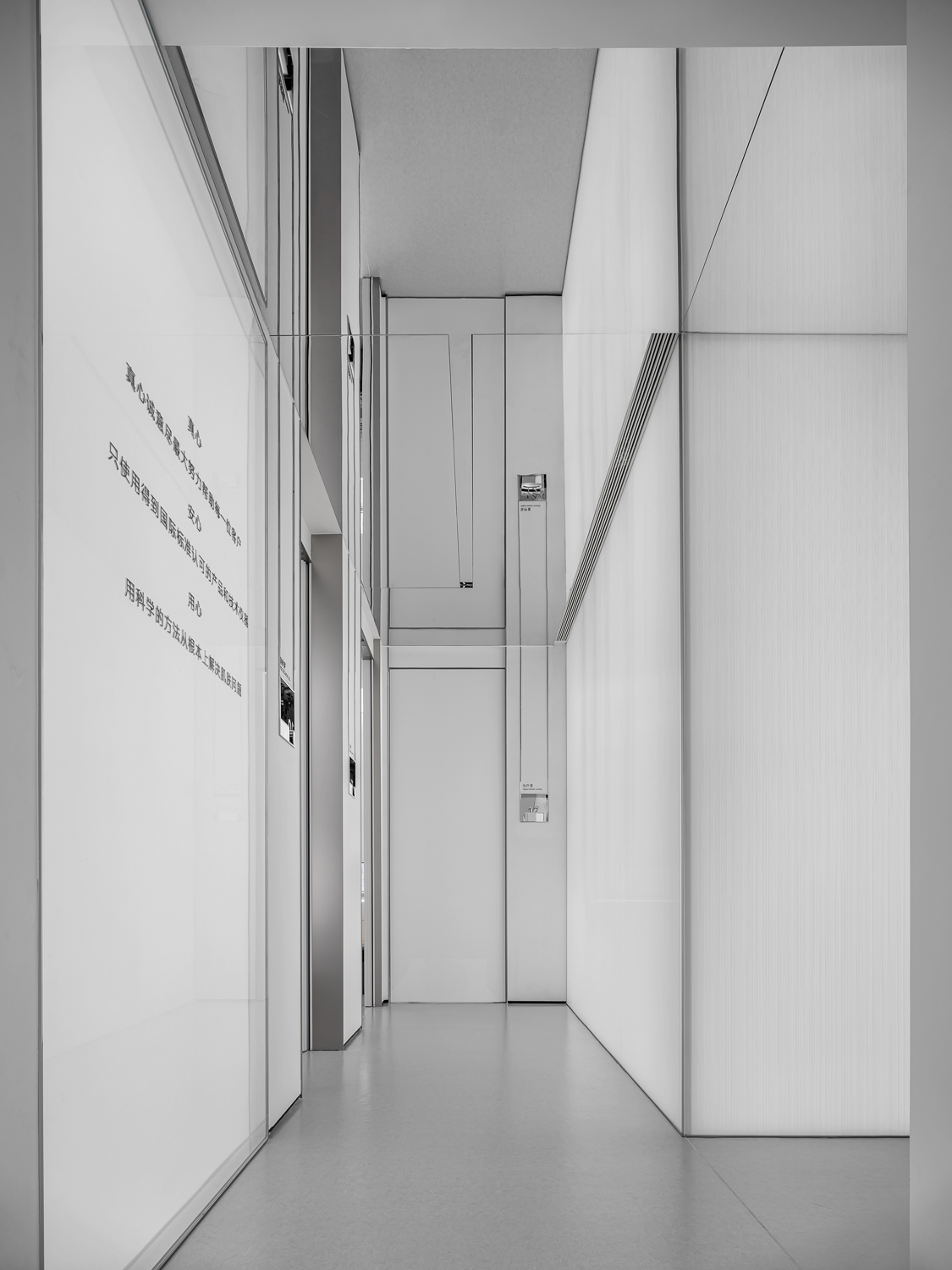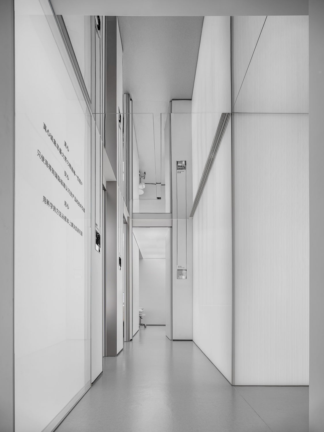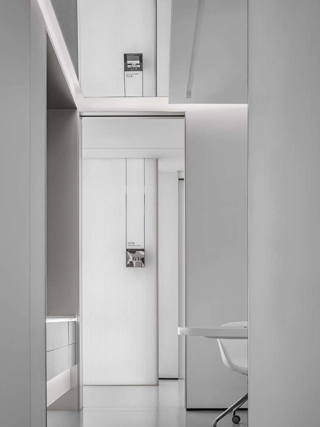 空间中所有房间均不设置门锁及拉手,通过闭门系统、门禁系统、智能系统共同协调完成控制,进入房间时工作人员通过门卡识别开门,门禁系统隐藏于门标导示中,功能与美学完美结合。