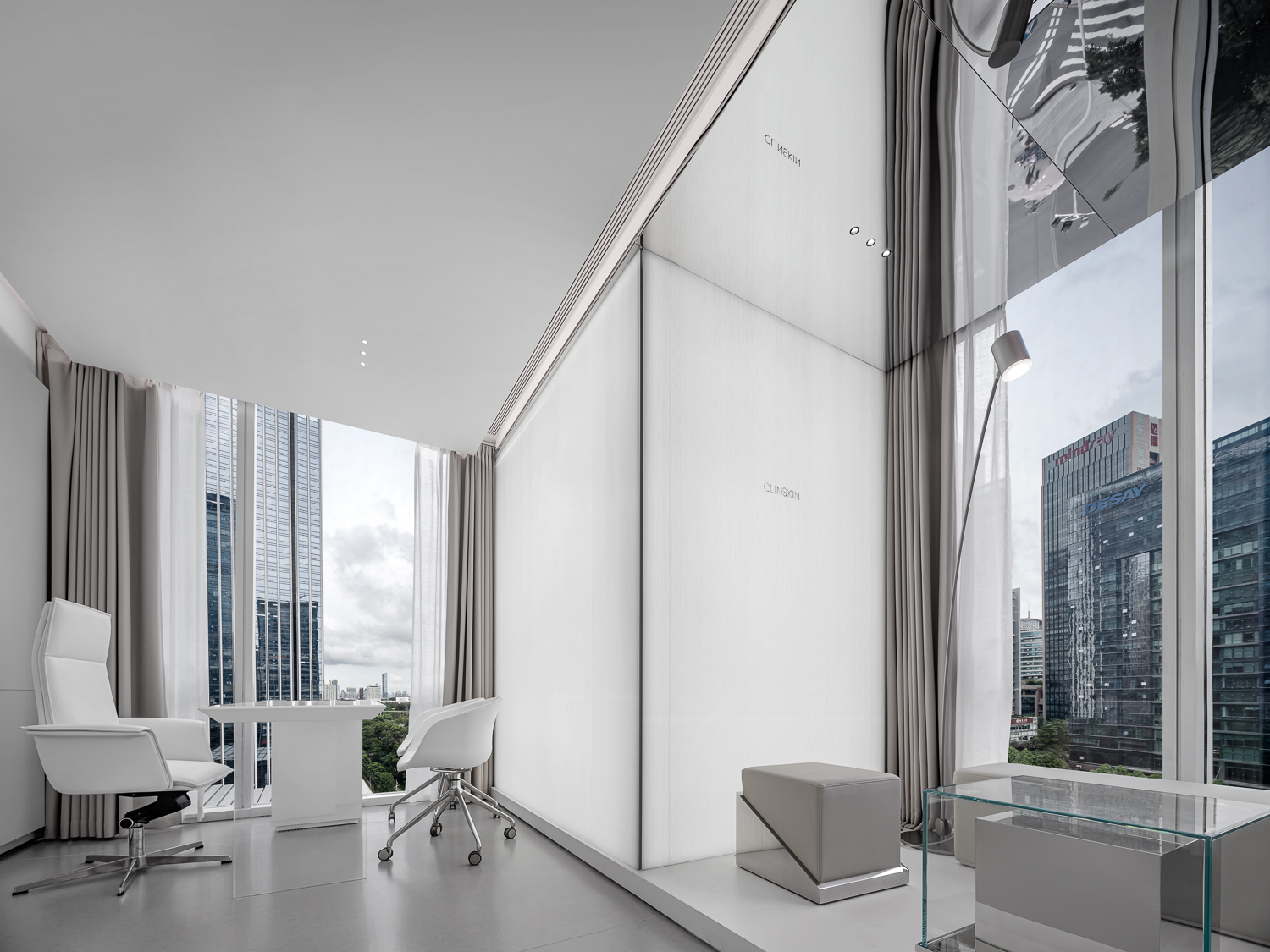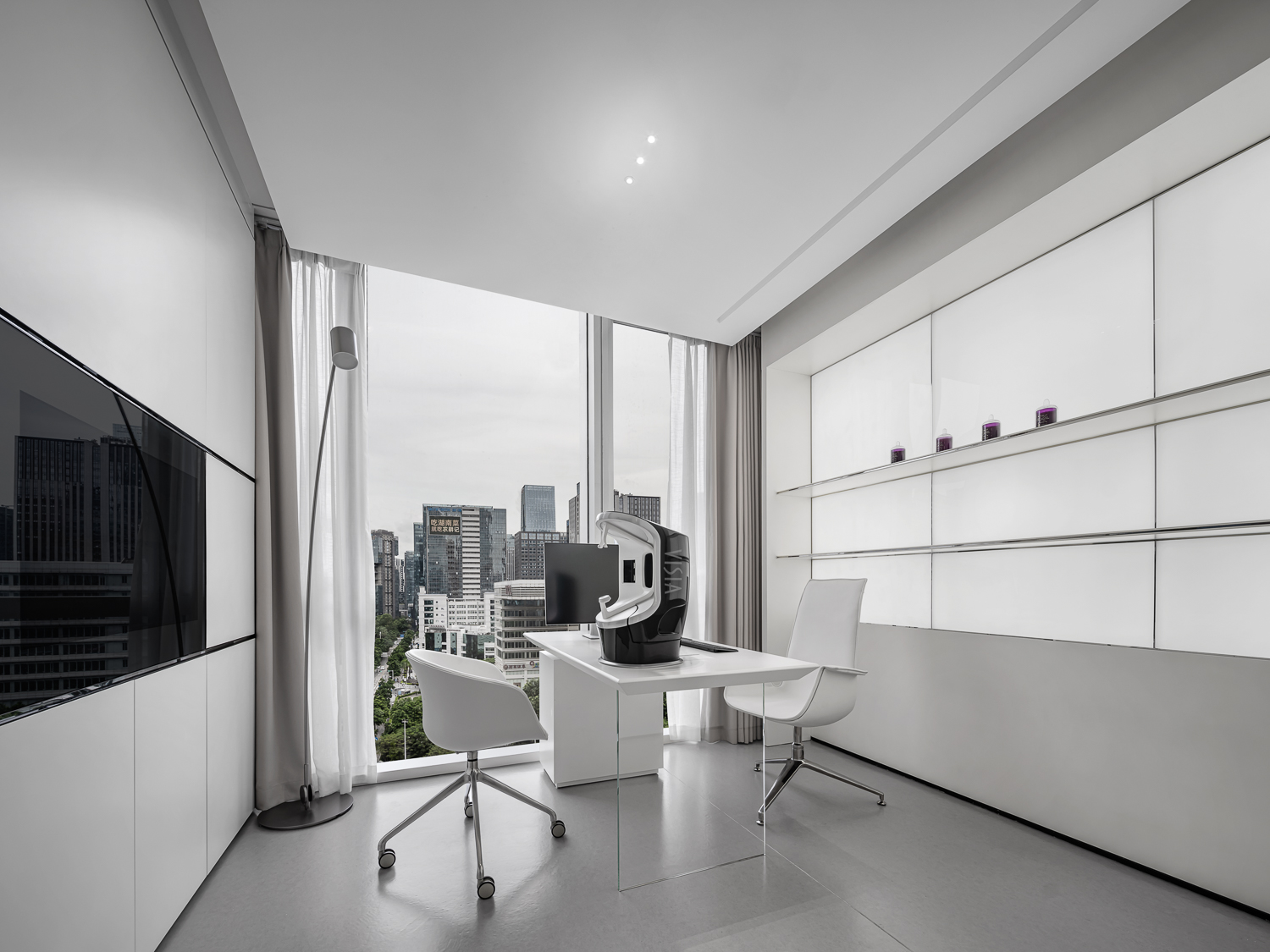 创新医美 科技--场景--体验 350平的空间中需要置入多个功能需求及合理的运营动线,共计大小空间27间通过多次推敲,进行合理布局。 空间设计中灯光及负荷非常具有挑战,白色系的空间考虑空间灯光层次且不能曝光成了最大难度,另整个空间灯光均置入智能控制系统,多场景控制且需考虑运营负荷压力。