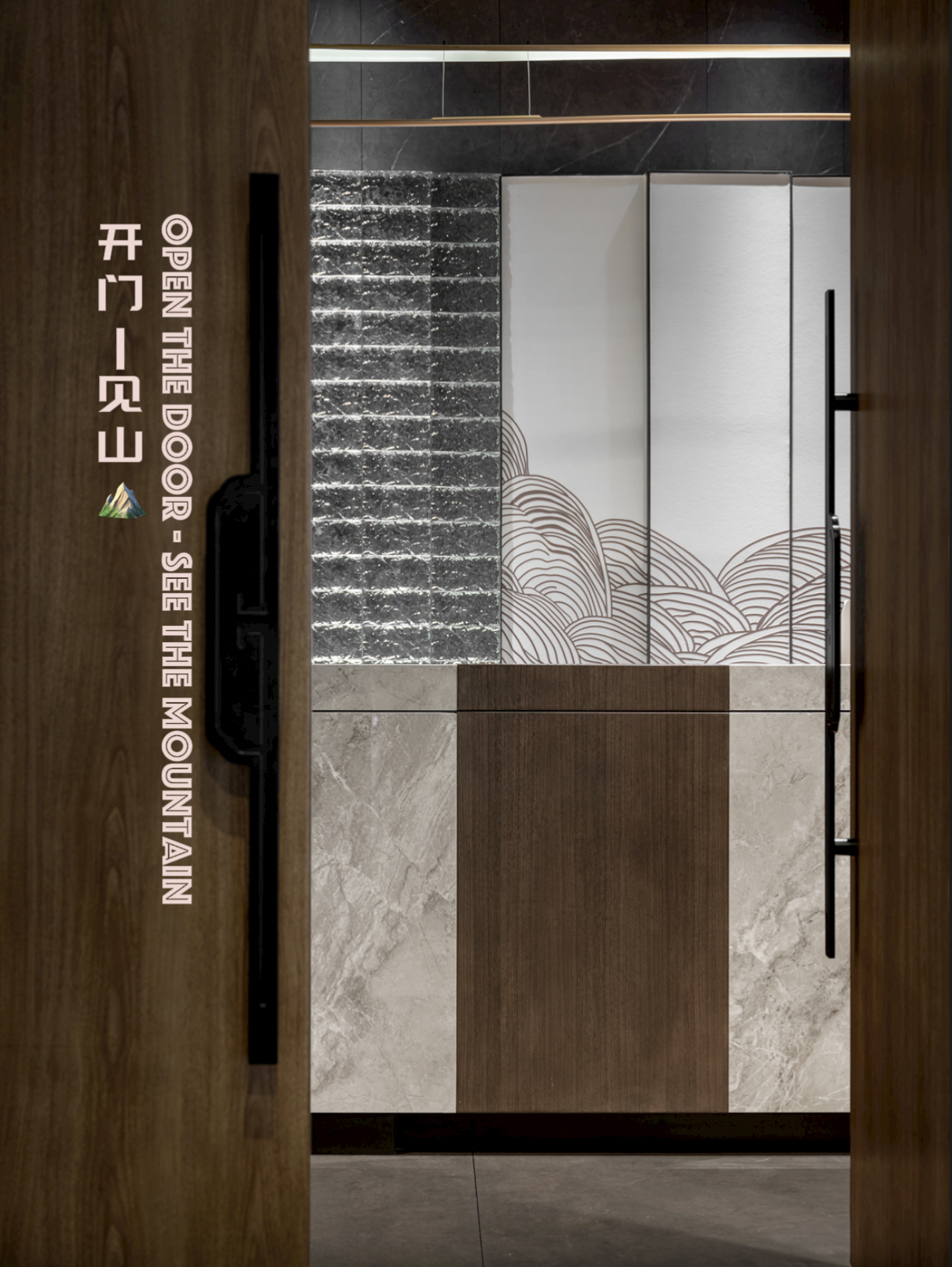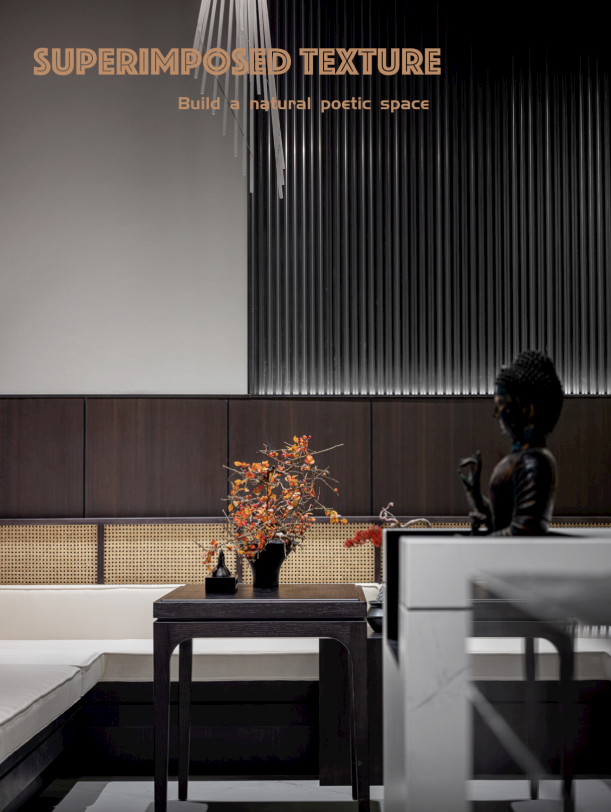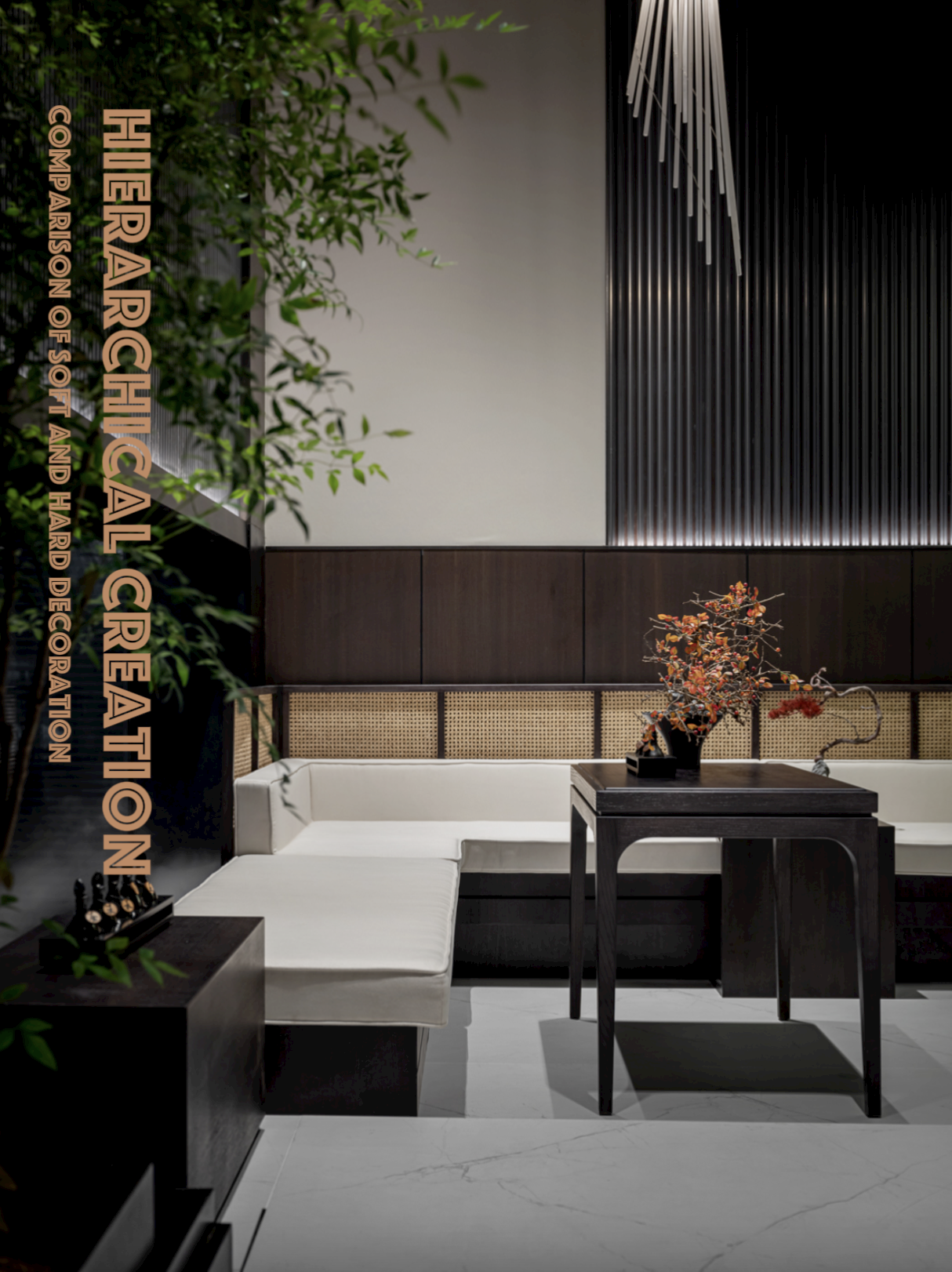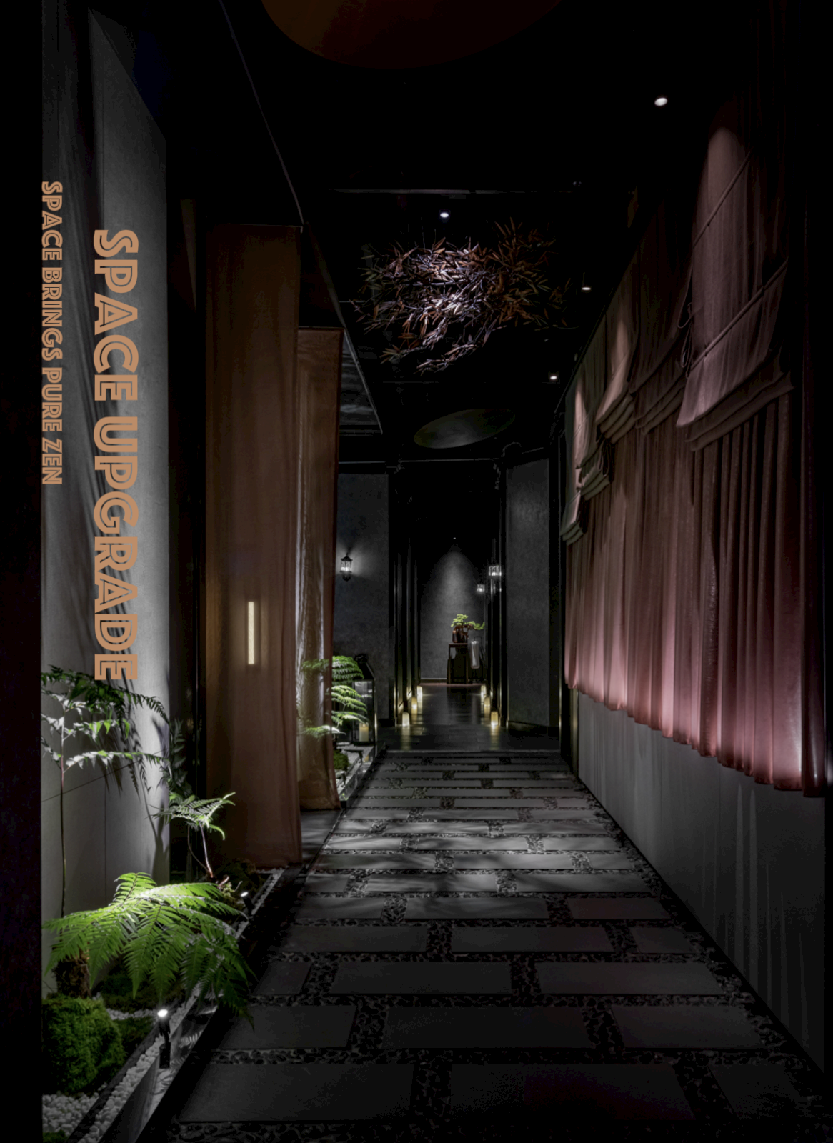 空间意境:空间景观设计中回归本源、回归水的怀抱,利用透明的波纹亚克力材质赋予了光影波光粼粼的质感点缀水与石的透景,单纯的中性色为空间带来纯粹的禅意。