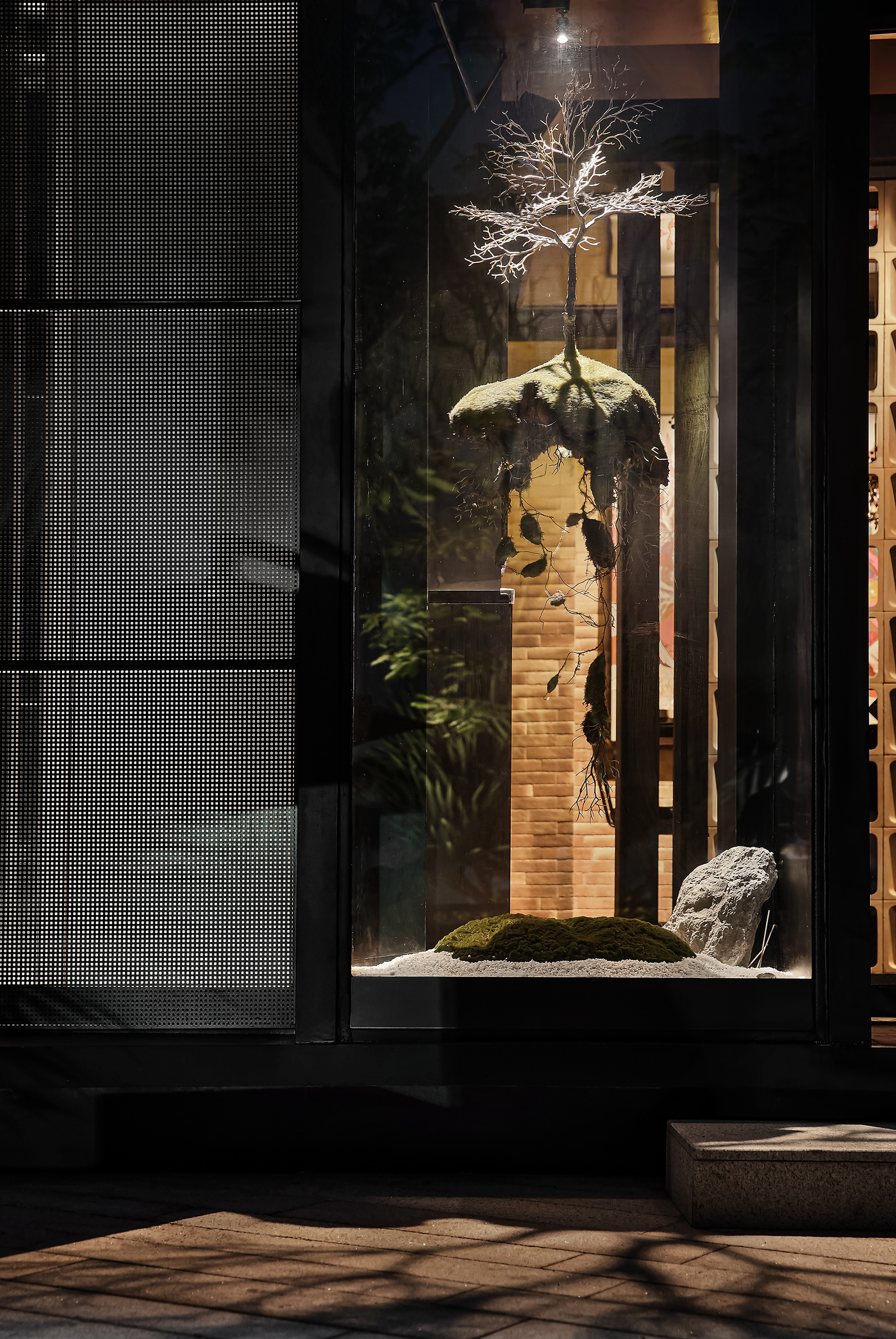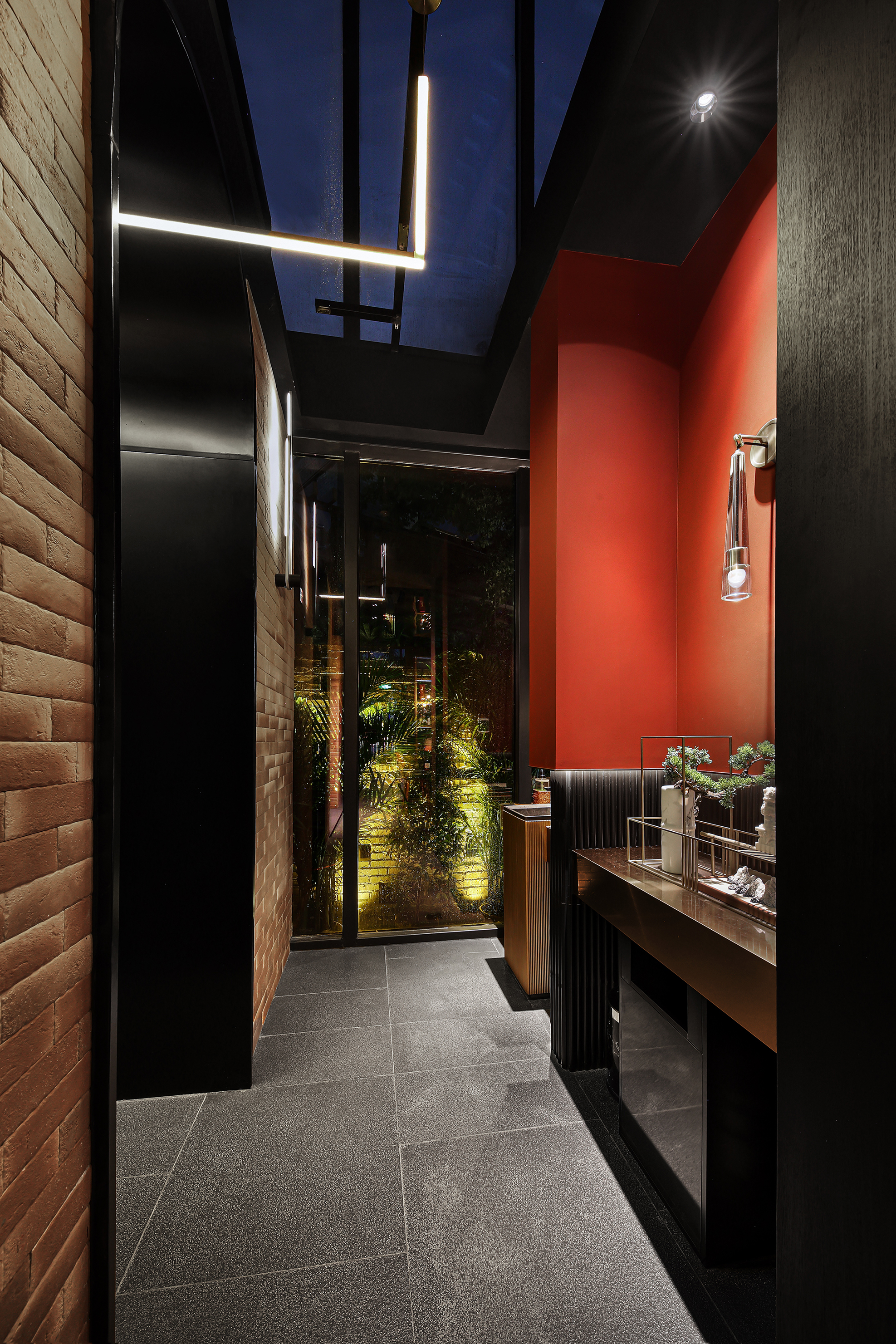 空间主要材质:仿古砖、定制手工陶砖、深色木饰面、金属氟碳漆等