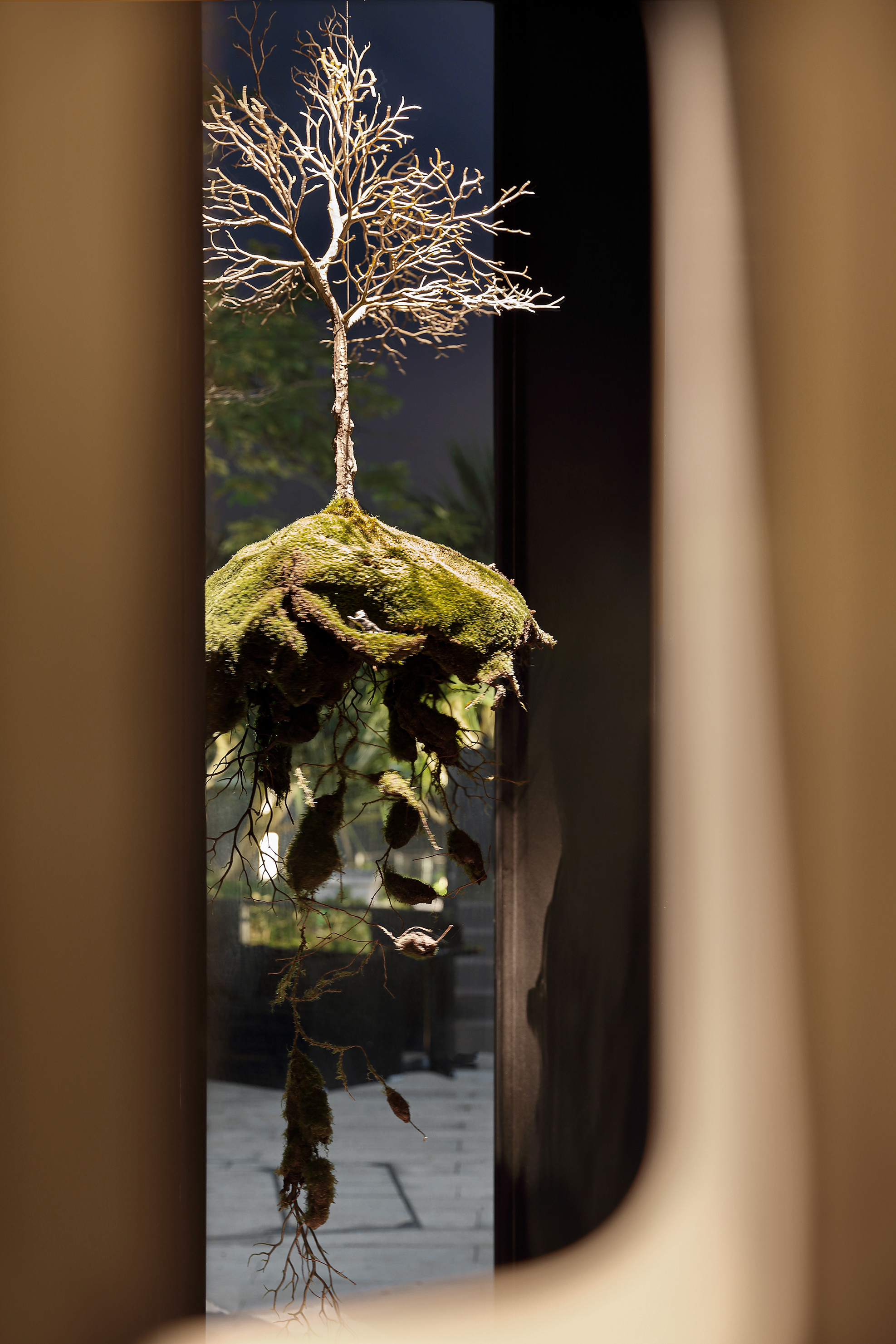 在进入洗手间之前的过渡空间中,落地玻璃窗透露着外面的造型景观,一览如余。红色墙面被一分为二成为洗手台和视觉点两个空间,圆柱落地式金属洗手台与蓝色精致雕塑结合灯光,互相配合,又使得空间融为一体,烘托着整体氛围。