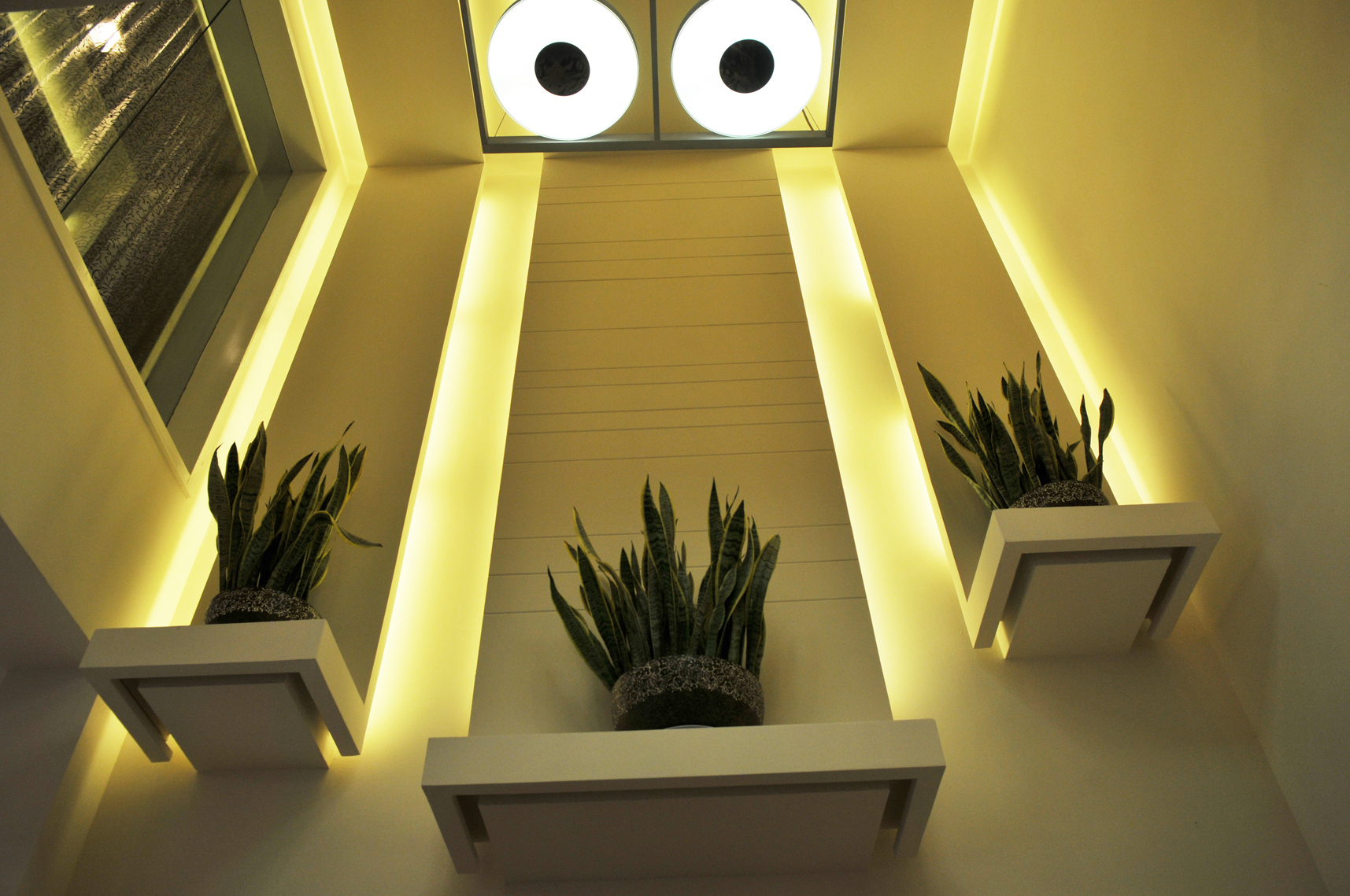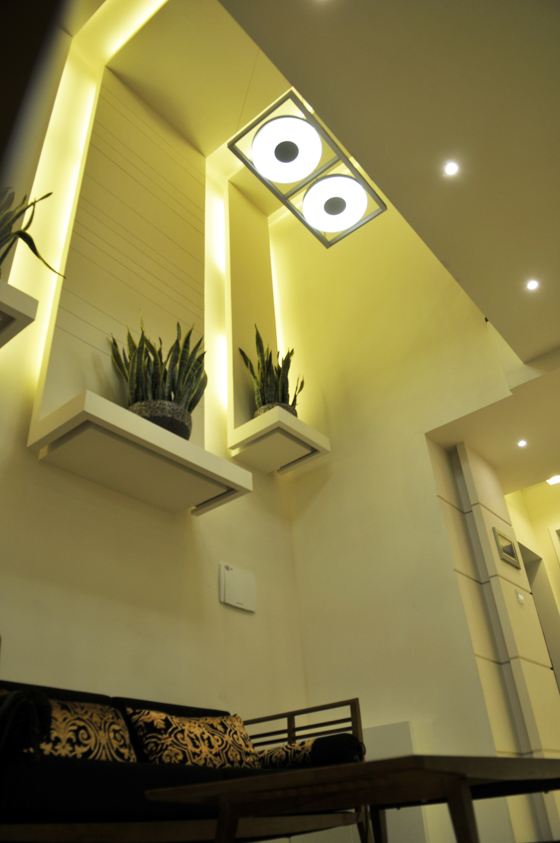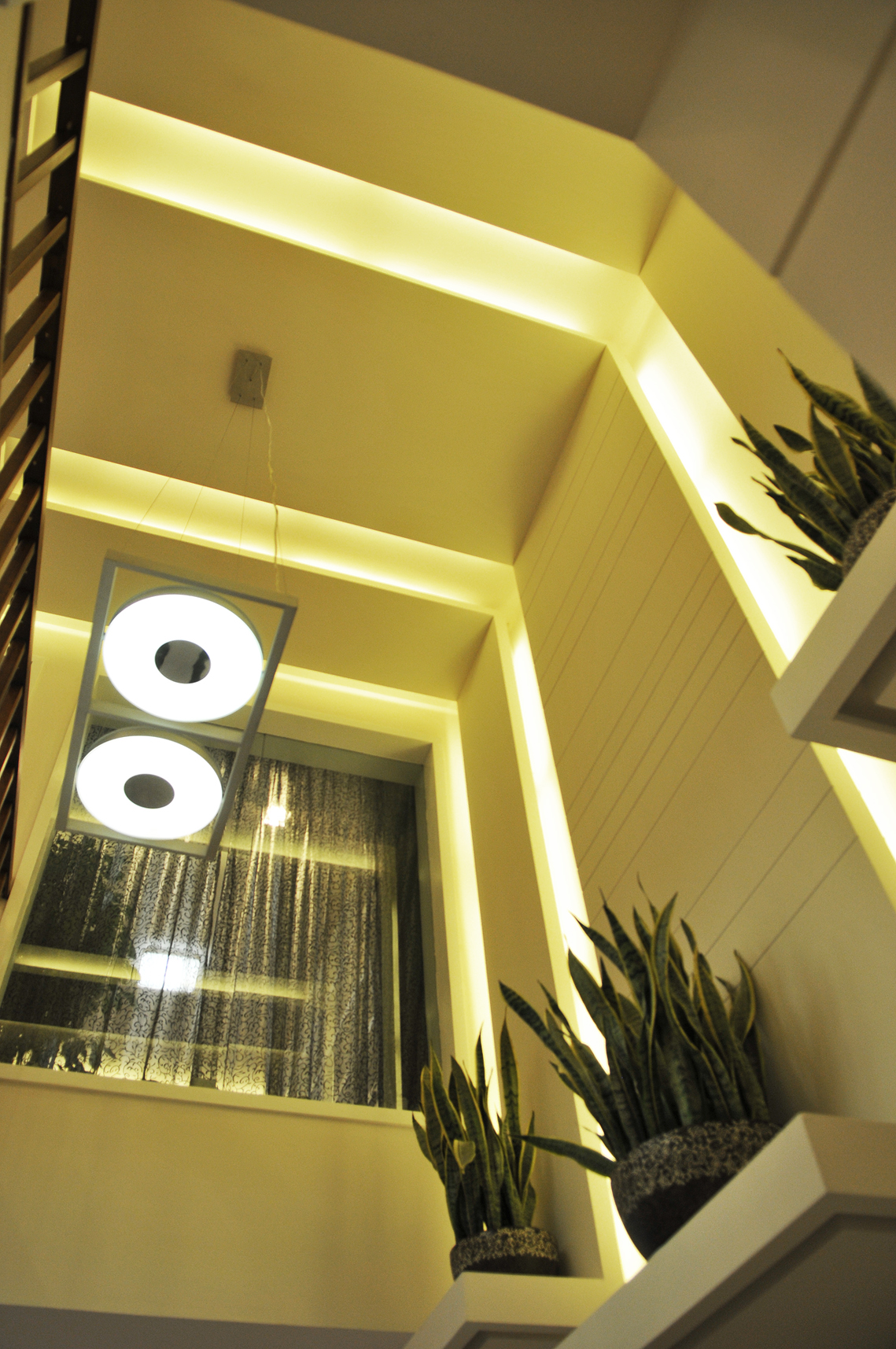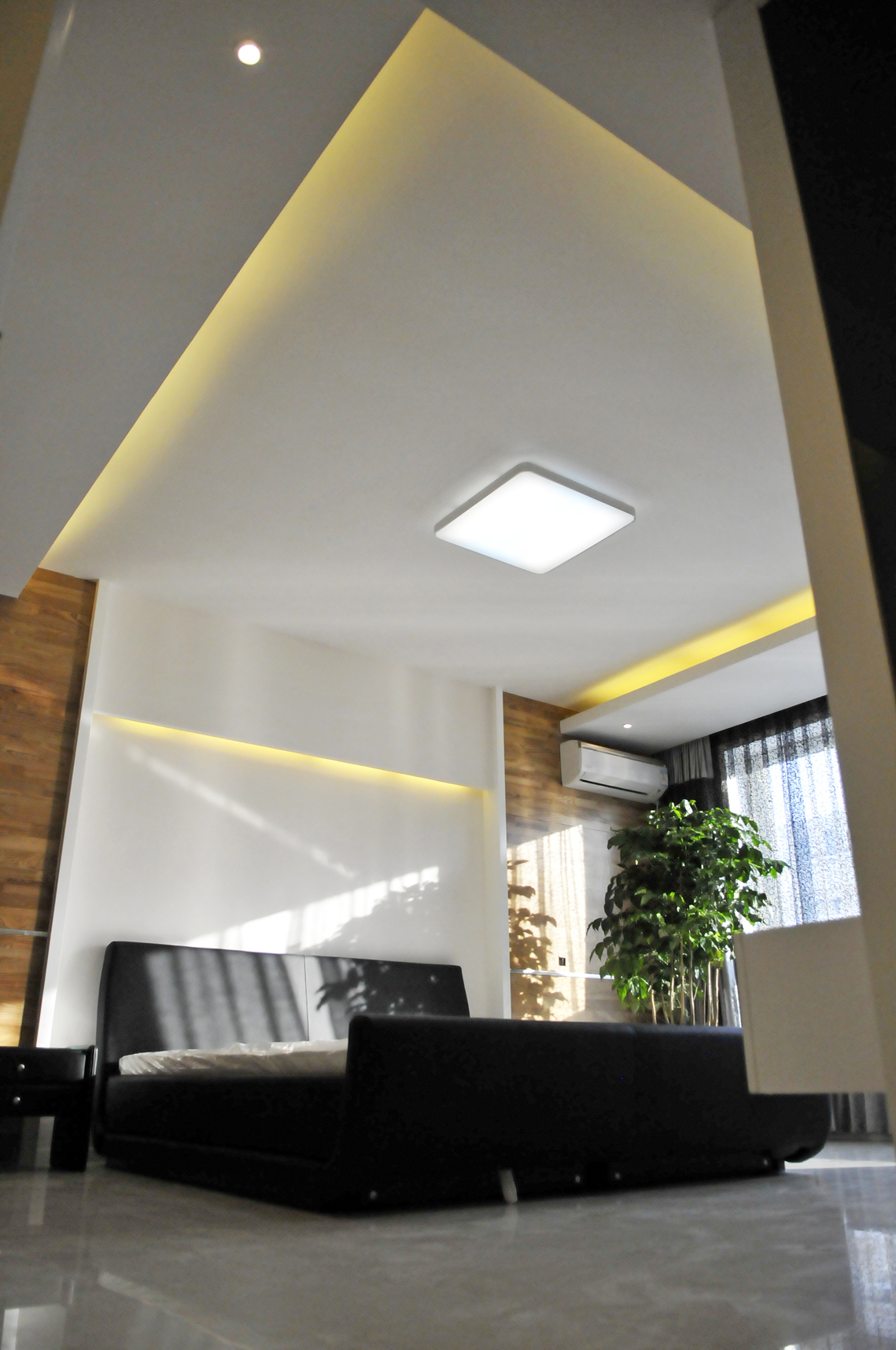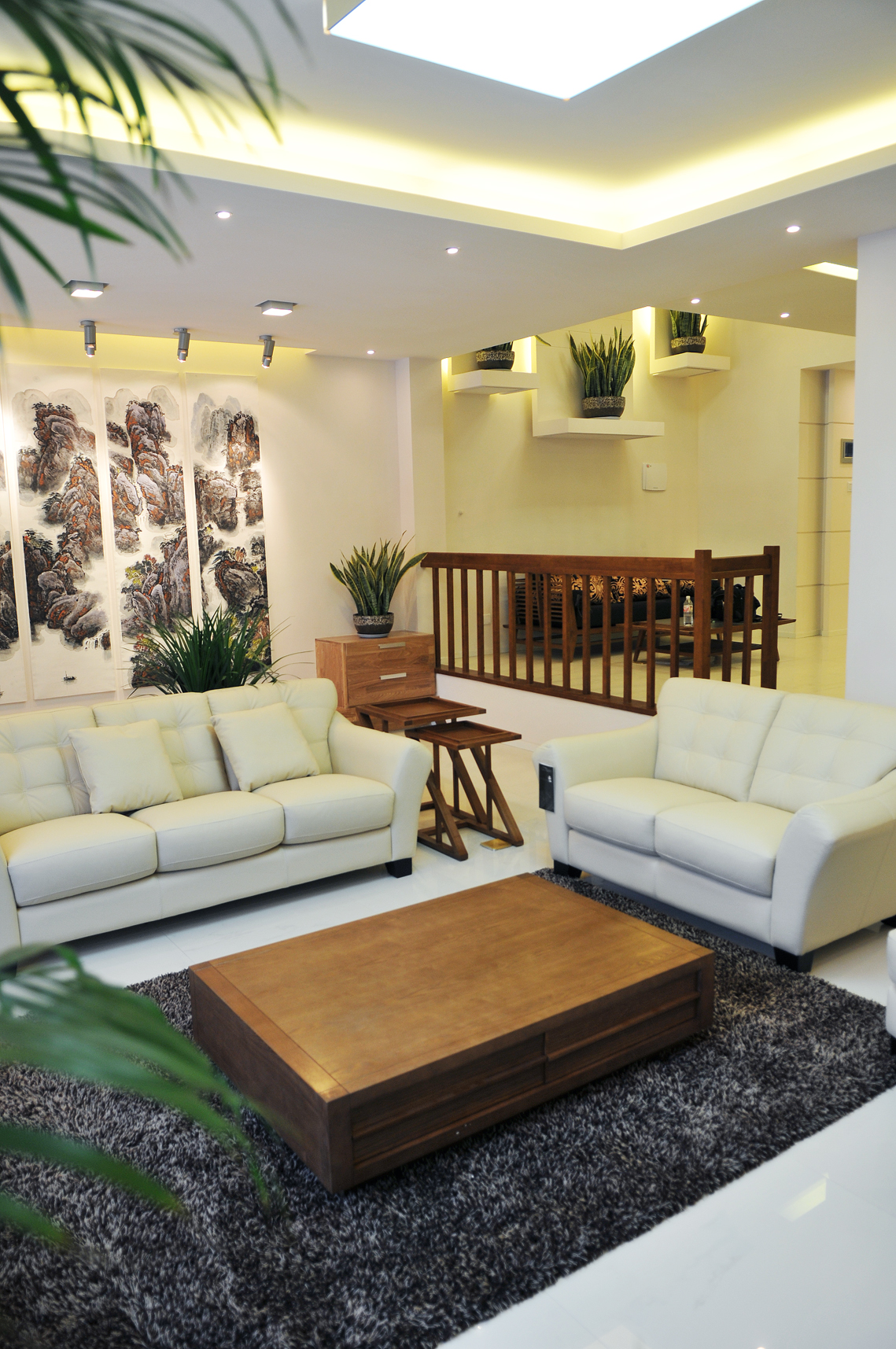 空间布局:两层居中空间,一层功能区域,居住空间使用挑空部分的线条贯通,一二层有机的融合再一次,没有传统意义上的空间划分,主卧室与书房套用叠加,将衣帽间隐形在其中,但满足较大的存储功能。