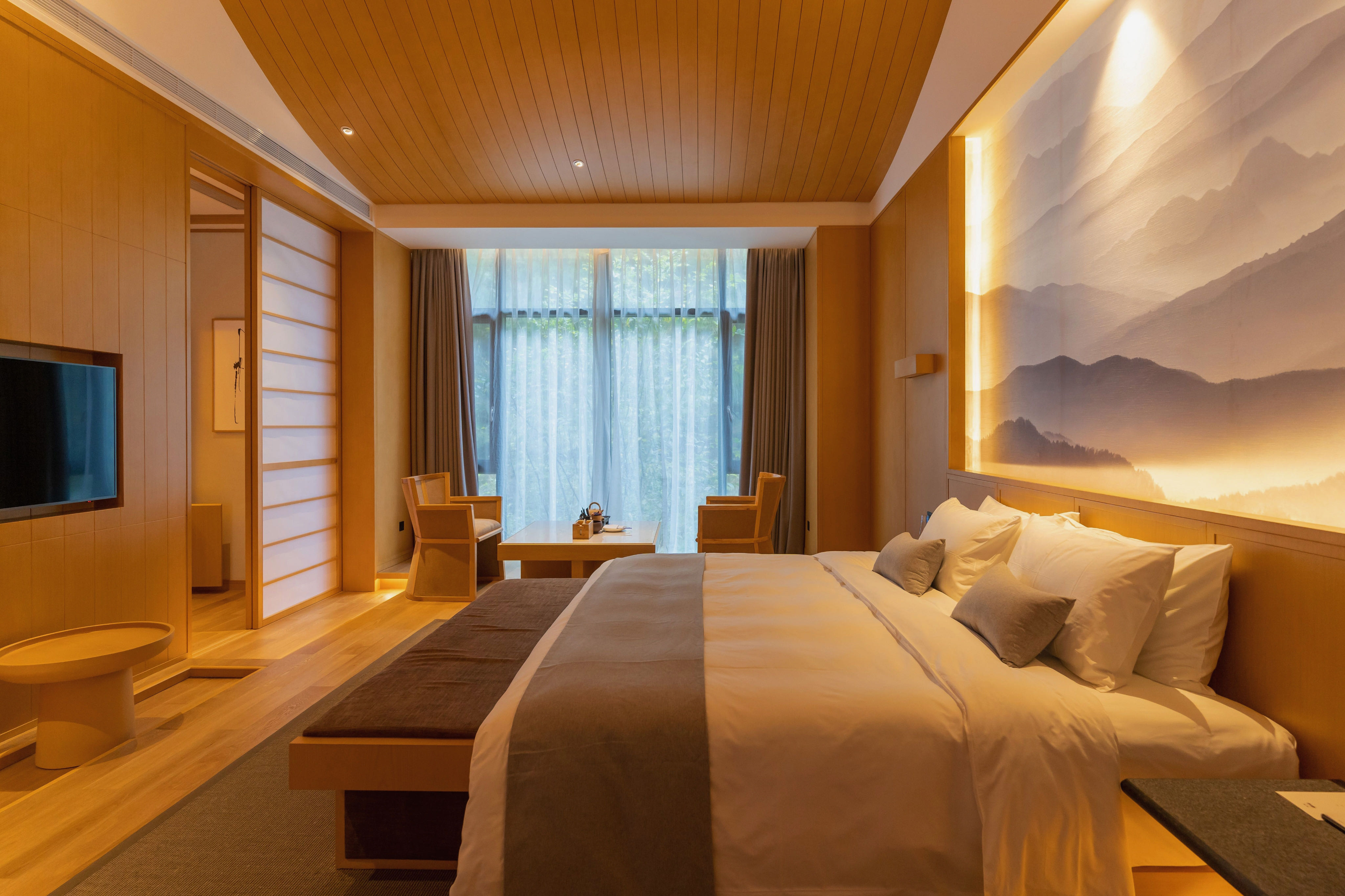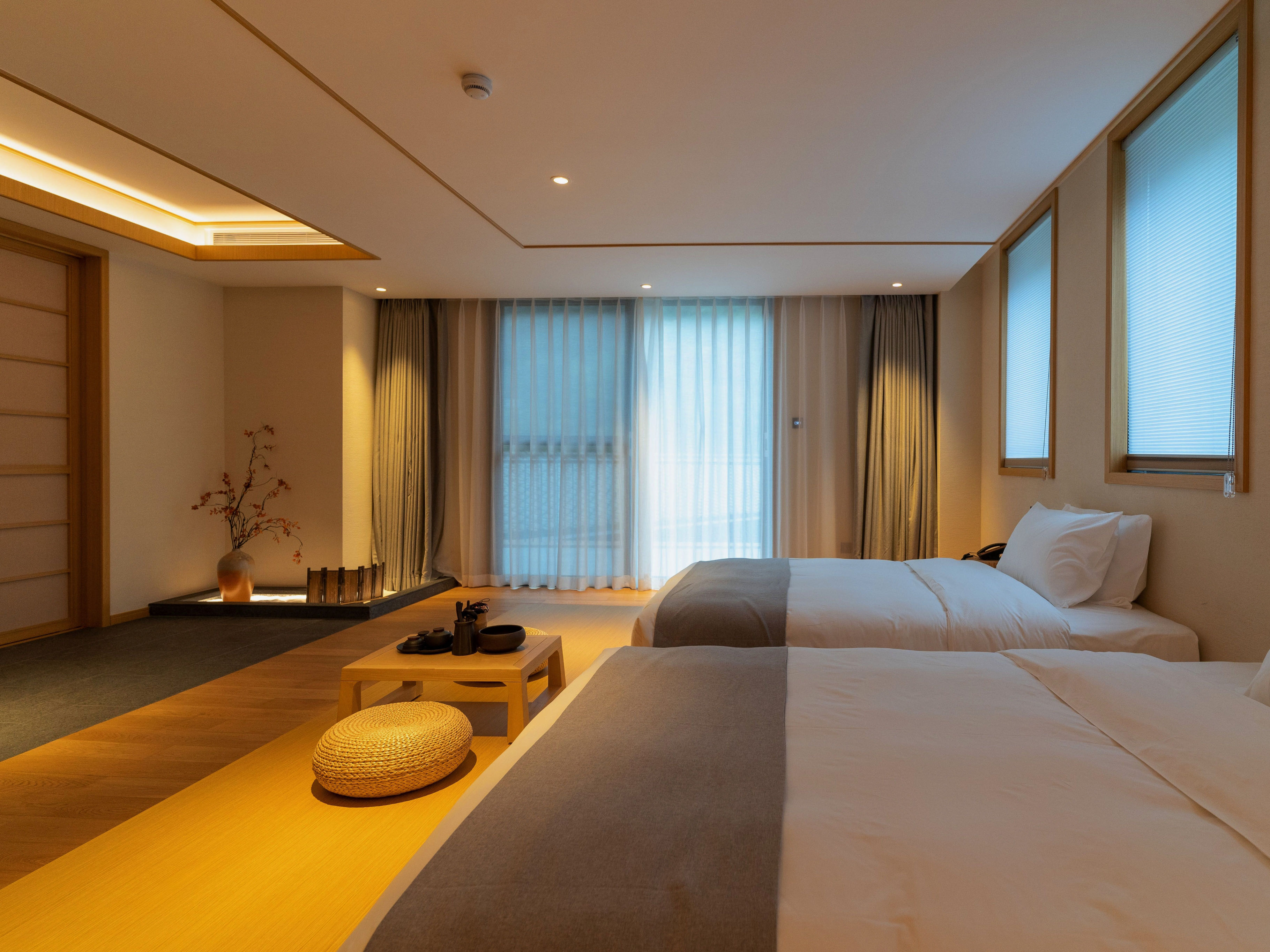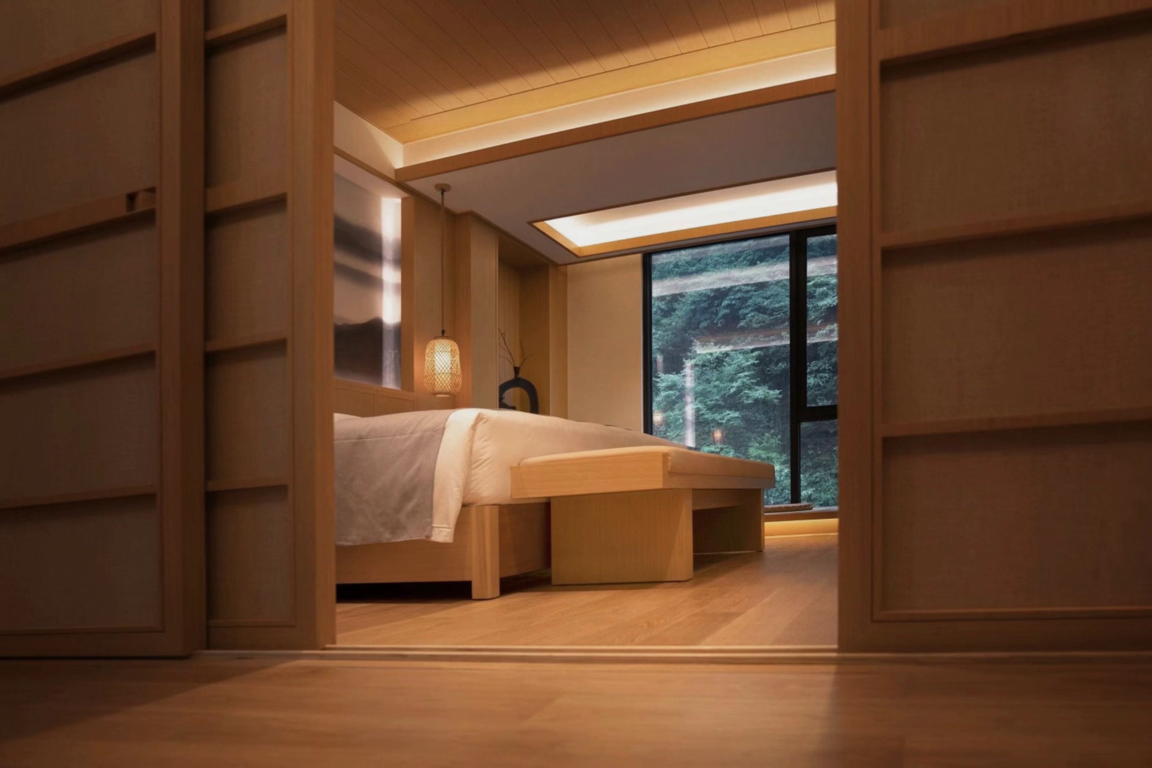 双人标准客房,大面积的采光保证了屋内的光线和通风 窗外的美景也可窥见一斑,日式风格注重的自然光和屋内的暖灯光交融在这里
