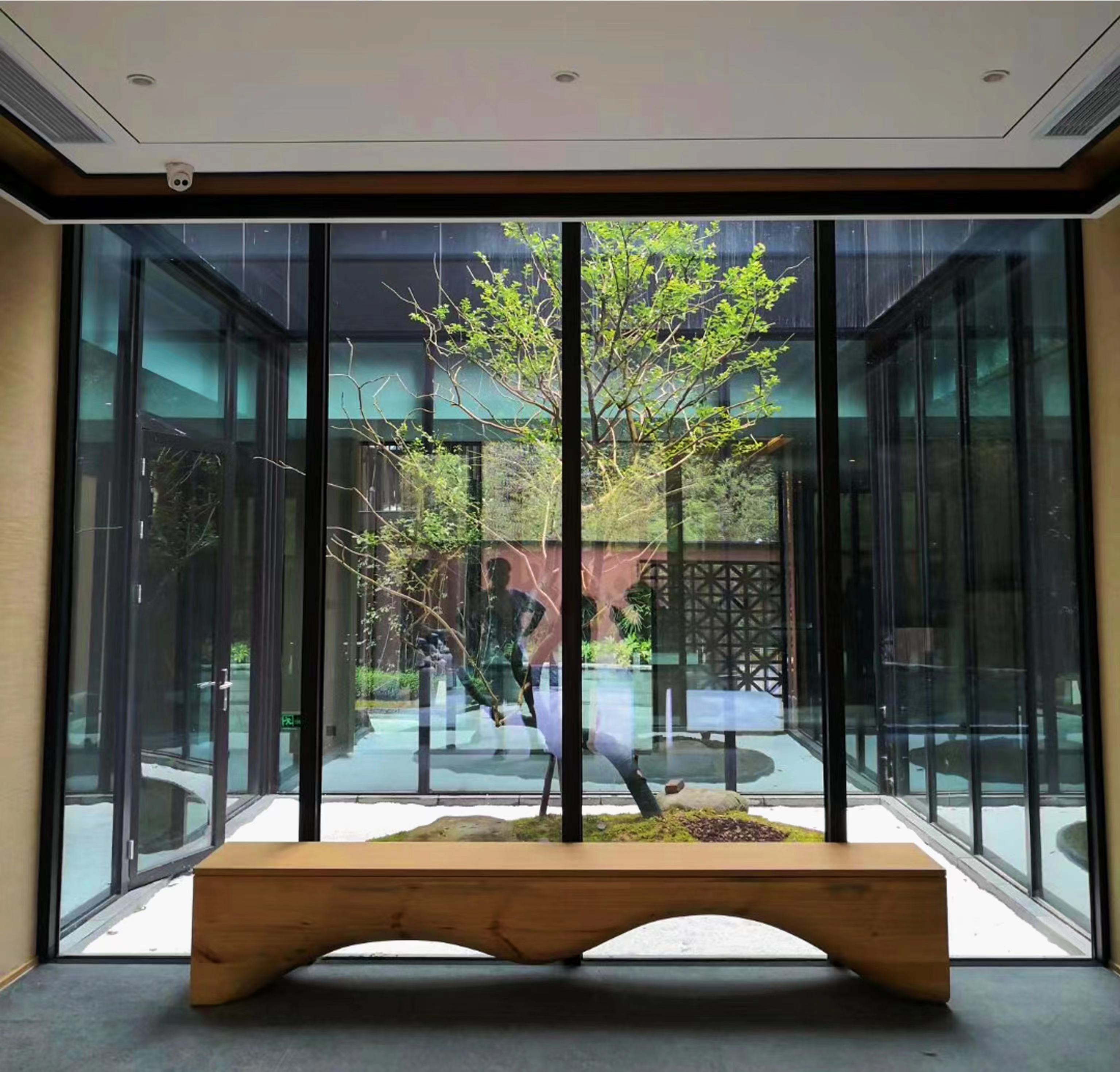 前台大厅以开阔的空间和暖色灯光与装饰墙面 搭配超高的拱形屋顶 给人开阔和温暖感,让客人一入门就享受到宾至如归的体验感 我们用玻璃幕墙代替普通墙面 将自然光引入空间 具有通透感的同时也更符合我们自然为主的设计理念