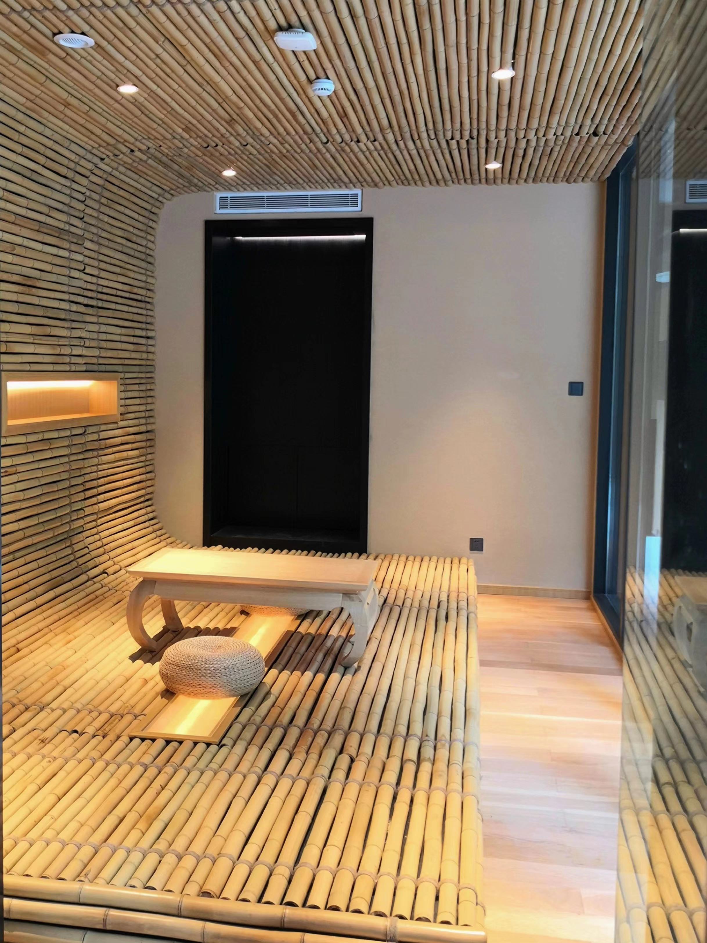 茶室利用竹的独特形态和天然气质,以富有变化的竹元素。在柔和自然的灯光映衬下,竹影下的一木一石均呈现出其天然本色,更带来富有韵律感的光影效果,让空间显得格外幽静安然。