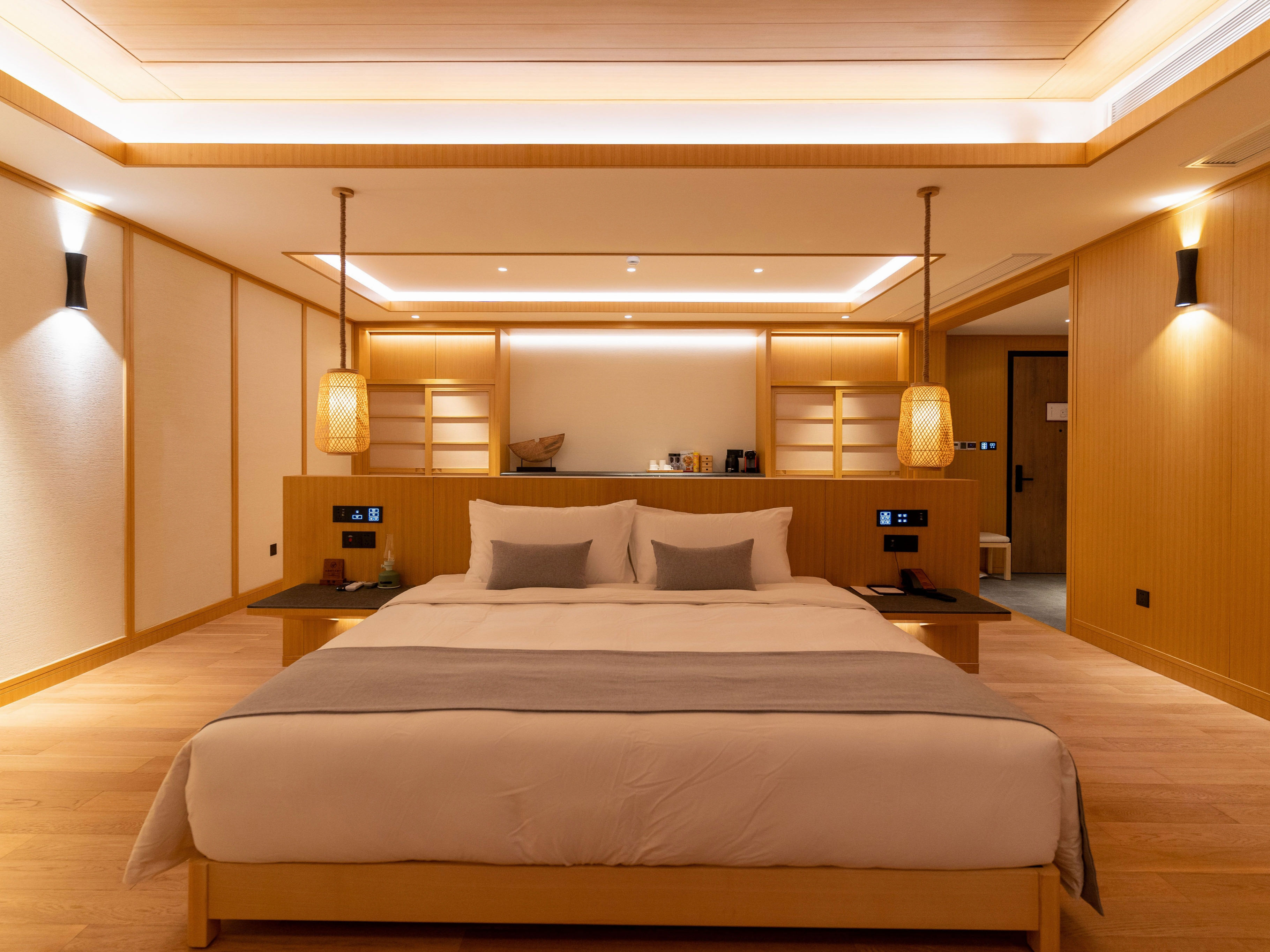 客房的全貌得以展现 墙面的麻布质感装饰面更添古朴自然的气息,木质弧面的中心挑高搭配着通透的氛围灯 人字造型上的意涵也是设计师以人为本的初衷