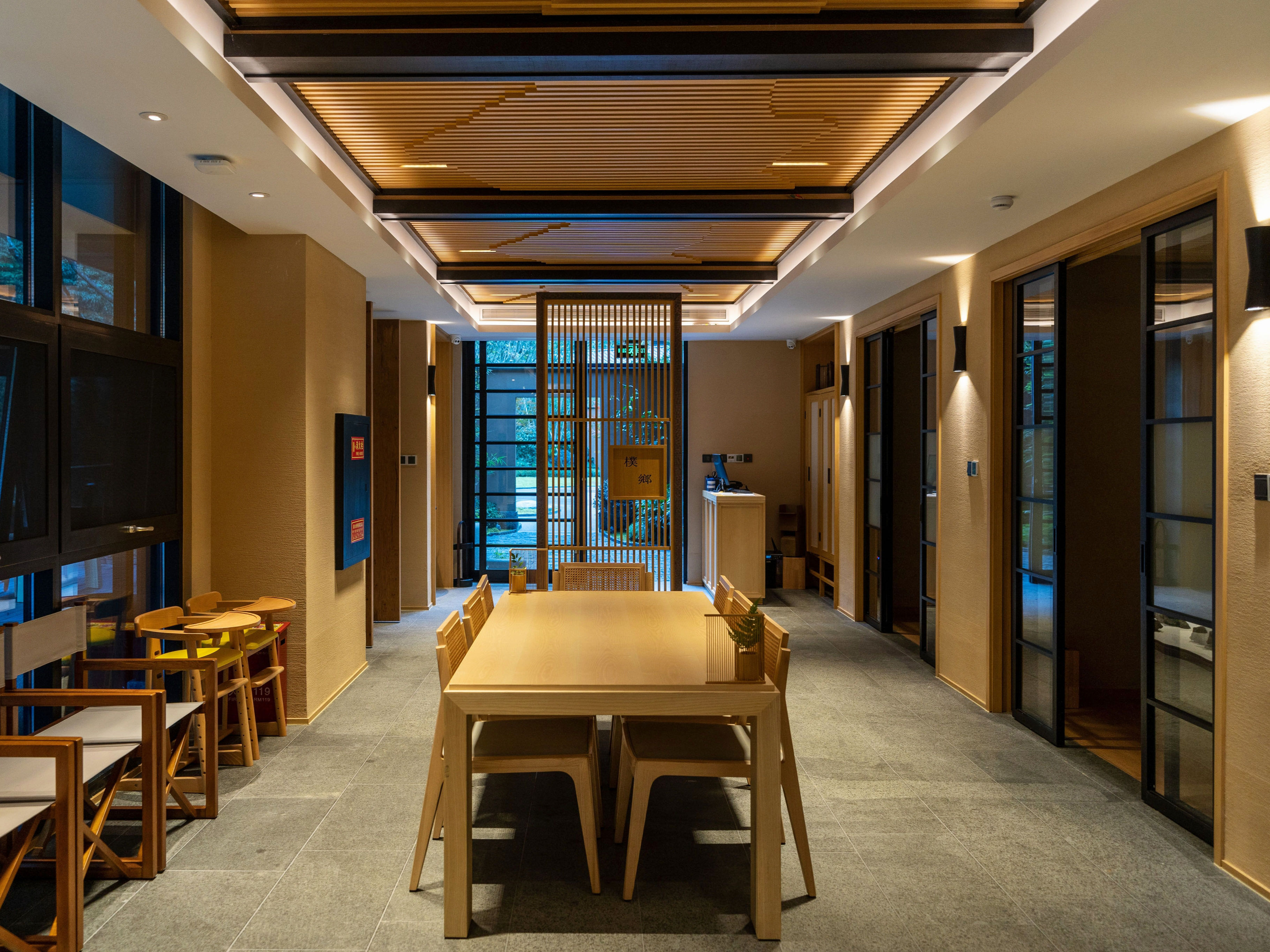 自然光是日式风格的灵魂,我们在大堂中庭处以挑空的天井将光引入室内,并充分调动阳光与空间内部的颜色互动,简洁的空间层次营造属于现代人的审美诉求