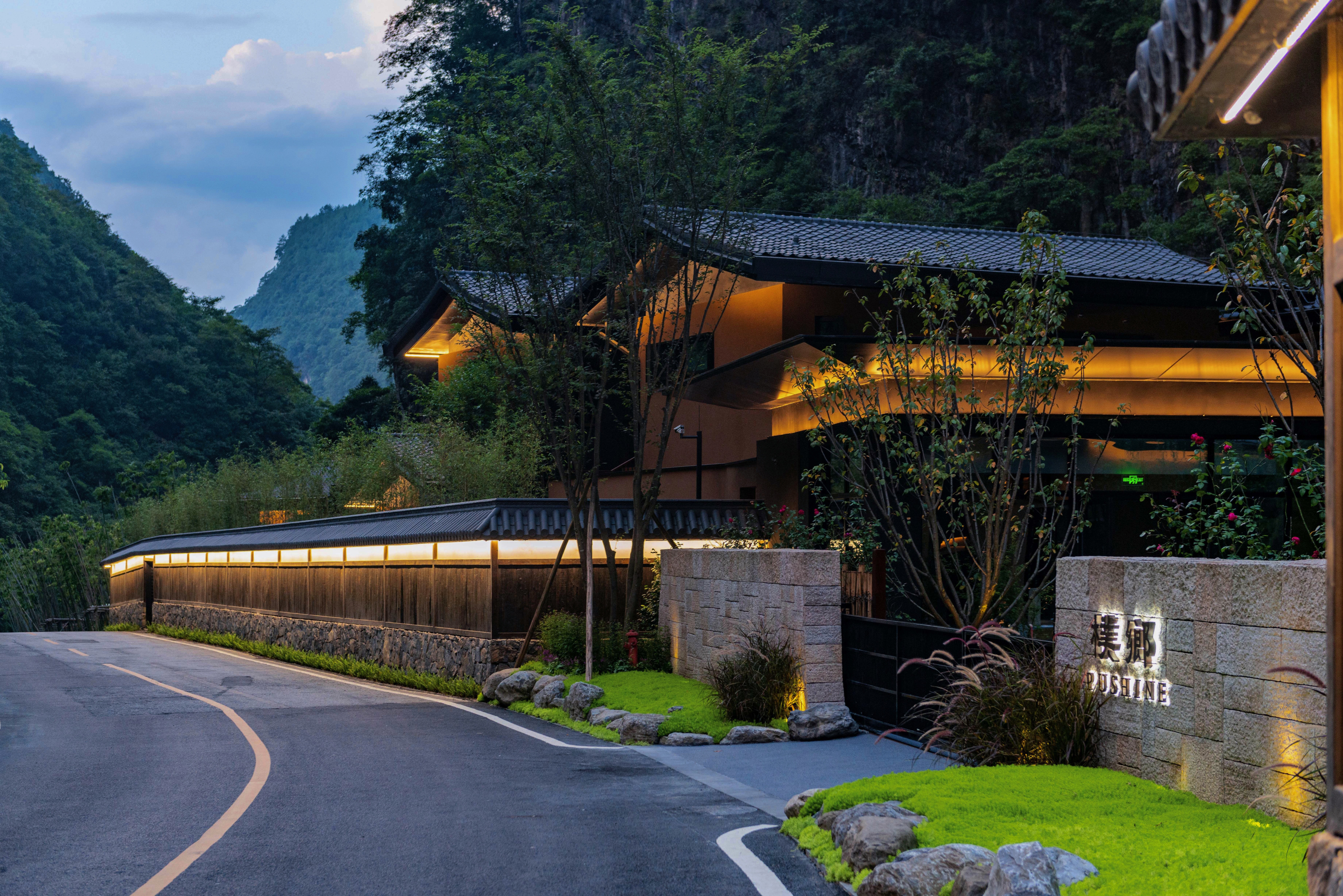 傍晚夜色下从酒店木屋中透出的盈盈暖光,将溪水也染上金箔似的质感,完美融入这如画般的自然风光,整座建筑仿佛天成在这远离喧嚣的大山深处安稳自得