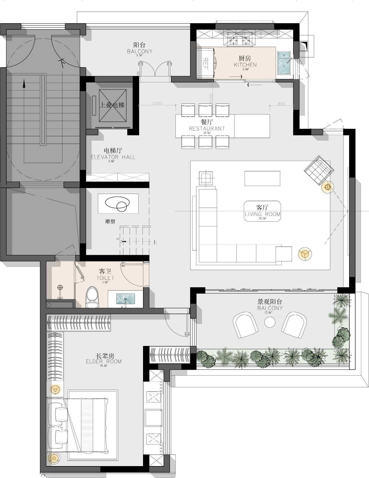 一层平面入户在地上三层,空间主要以客厅,餐厅,餐房,一层老人房为主。