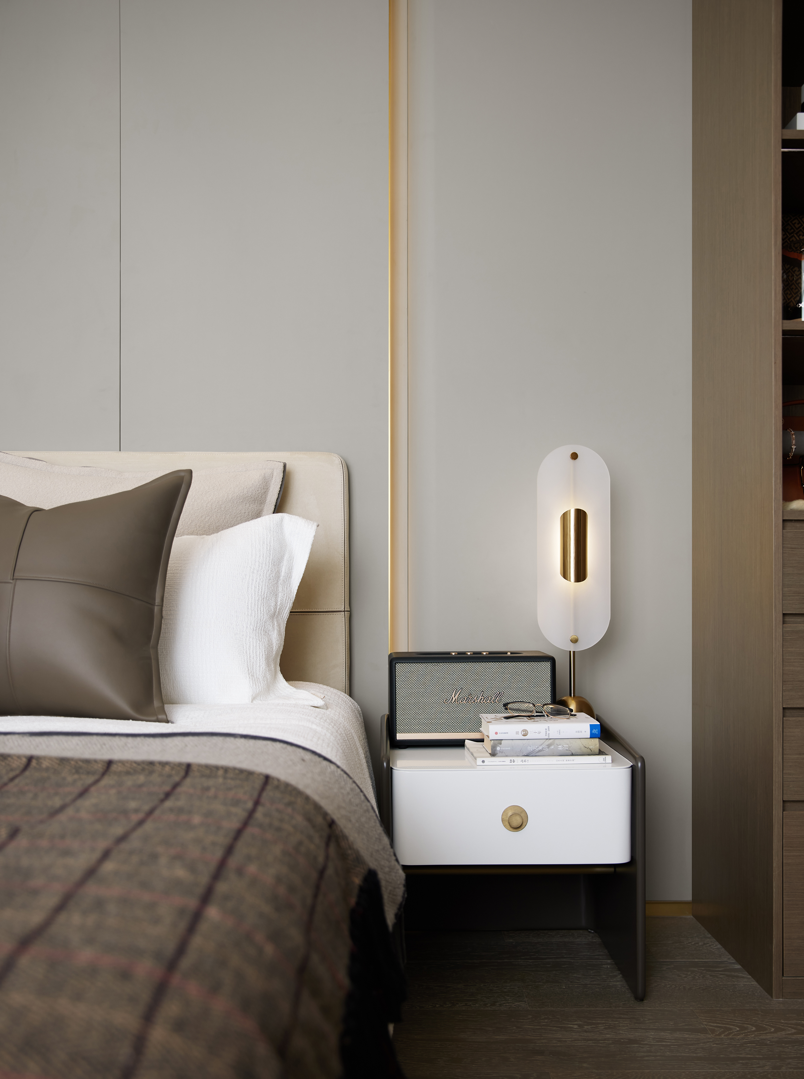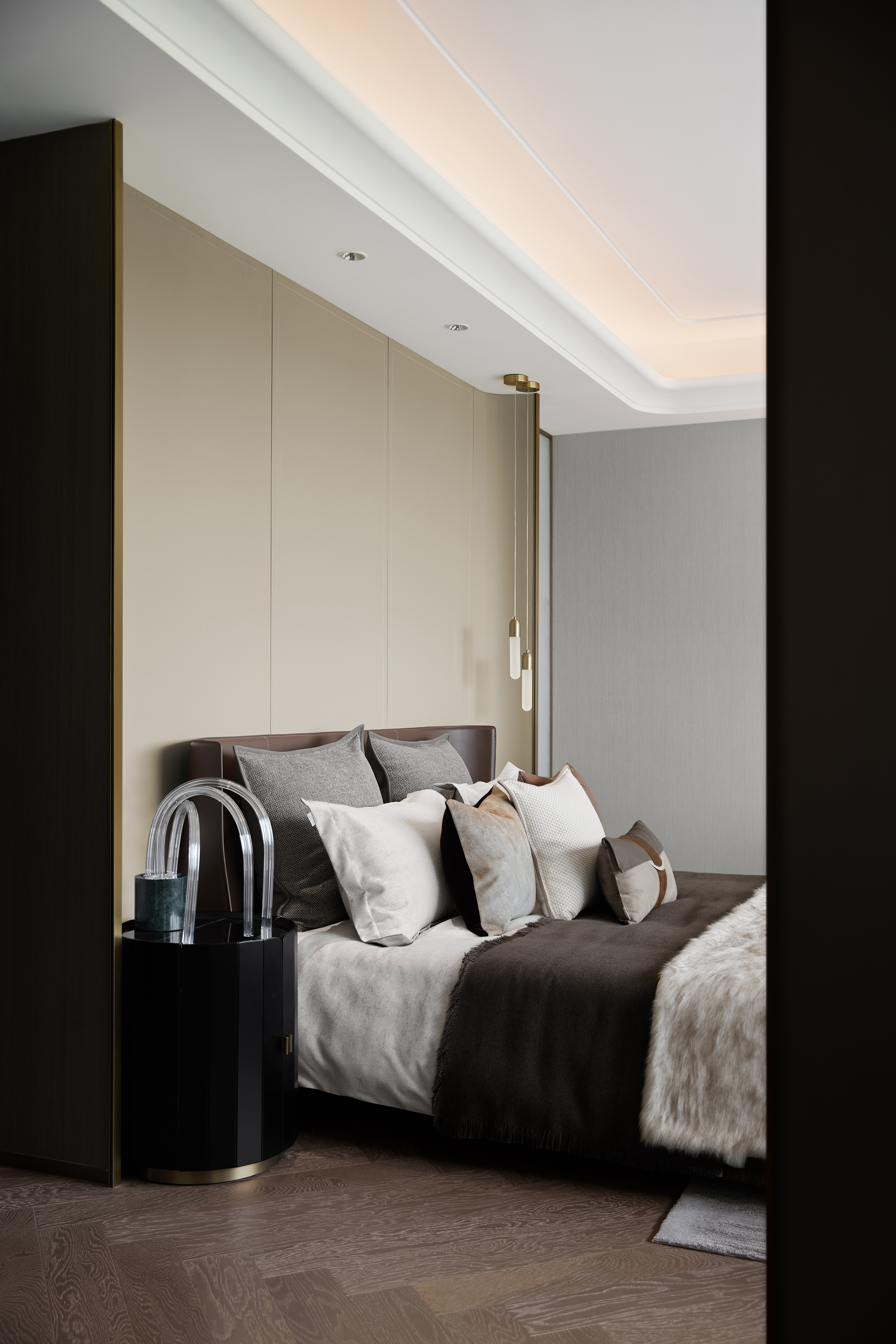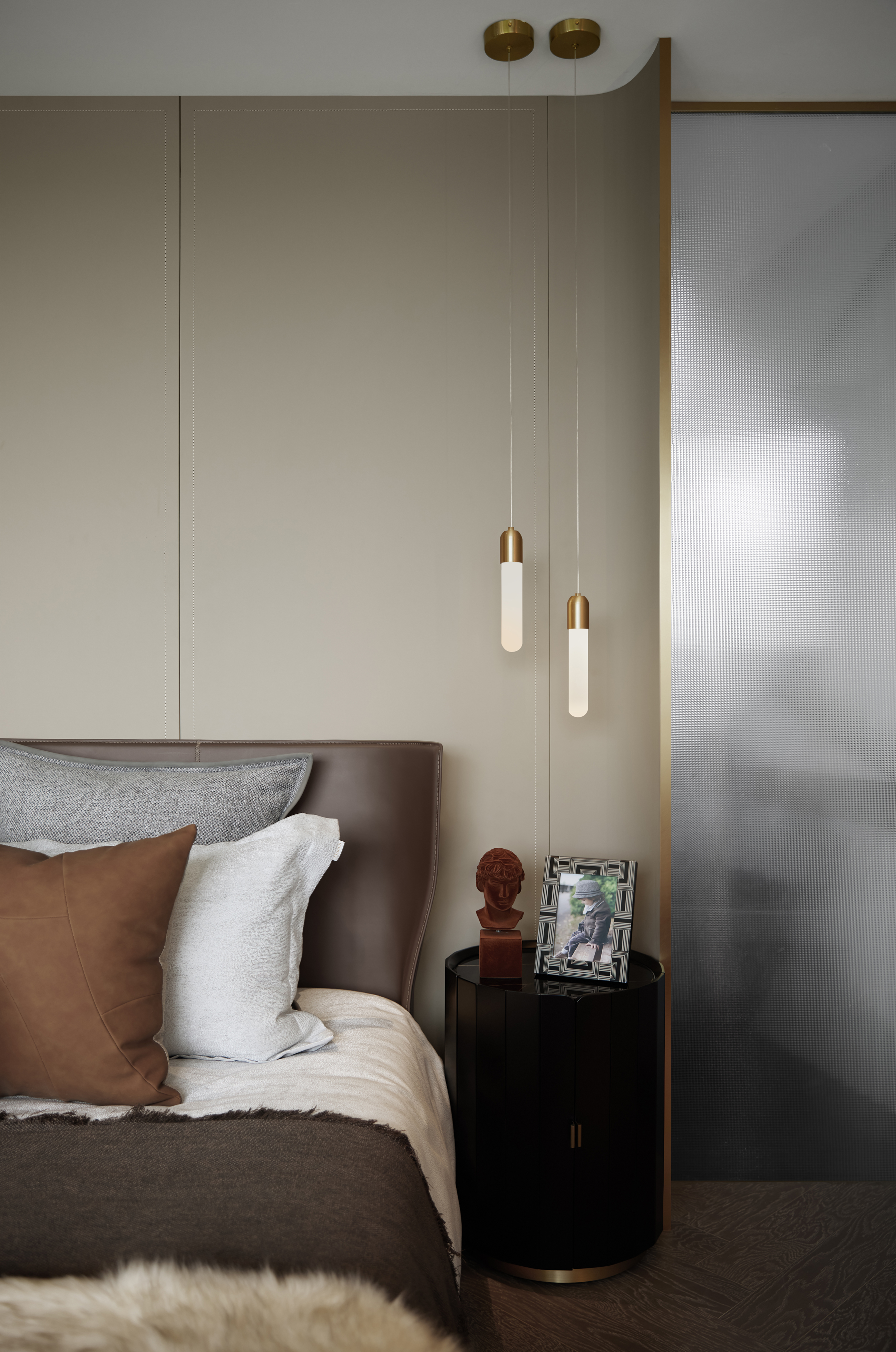 二楼的主卧室,保有了空间整体的空间气质与设计格调。皮革车缝拼接的硬质床背景,与床的暧深棕,形成恰到好处的色彩明暗对比。空间里软硬材料的运用,深浅色彩的采纳,既有节奏高低起伏的律动感,也不杂乱无章。