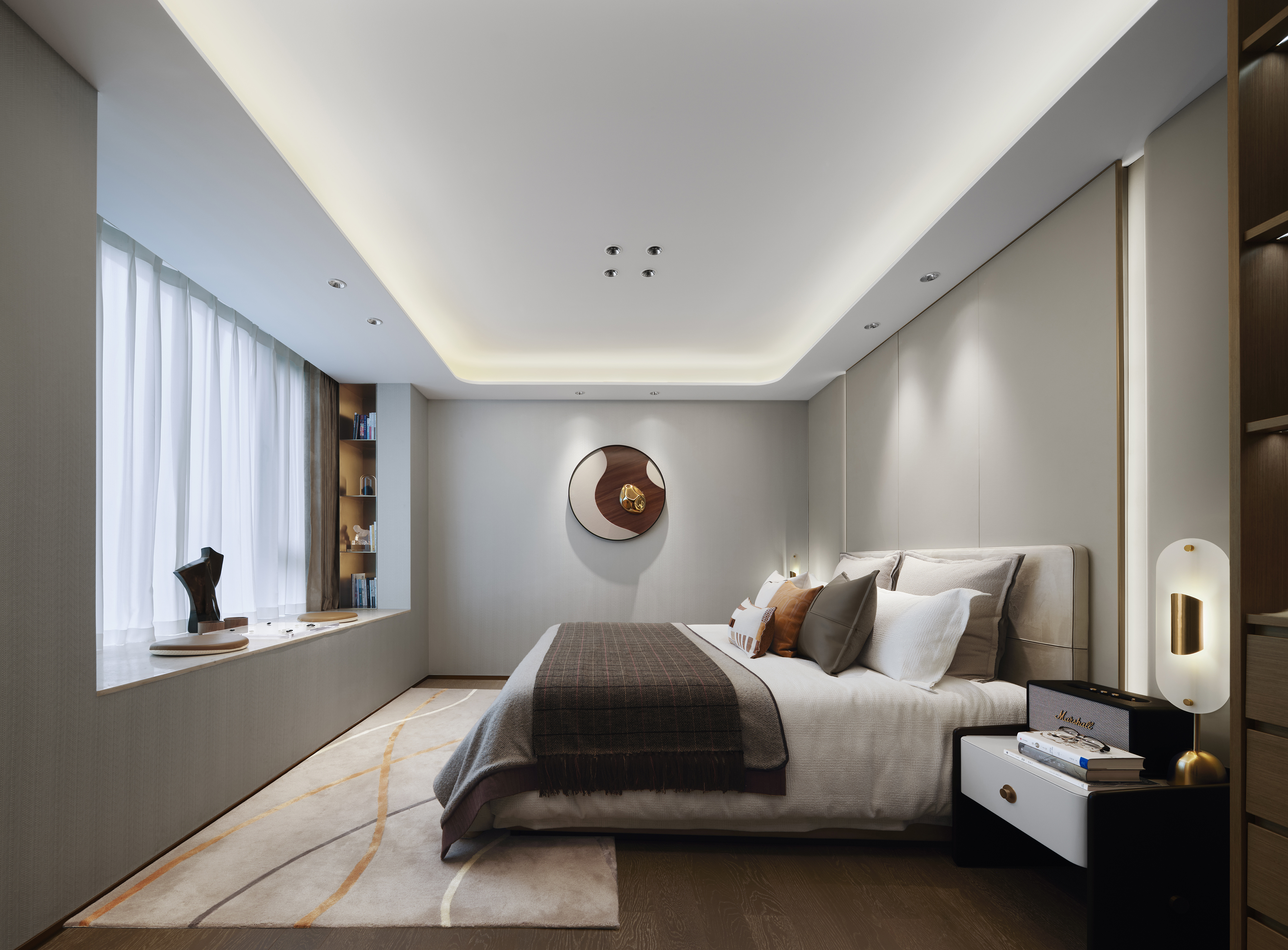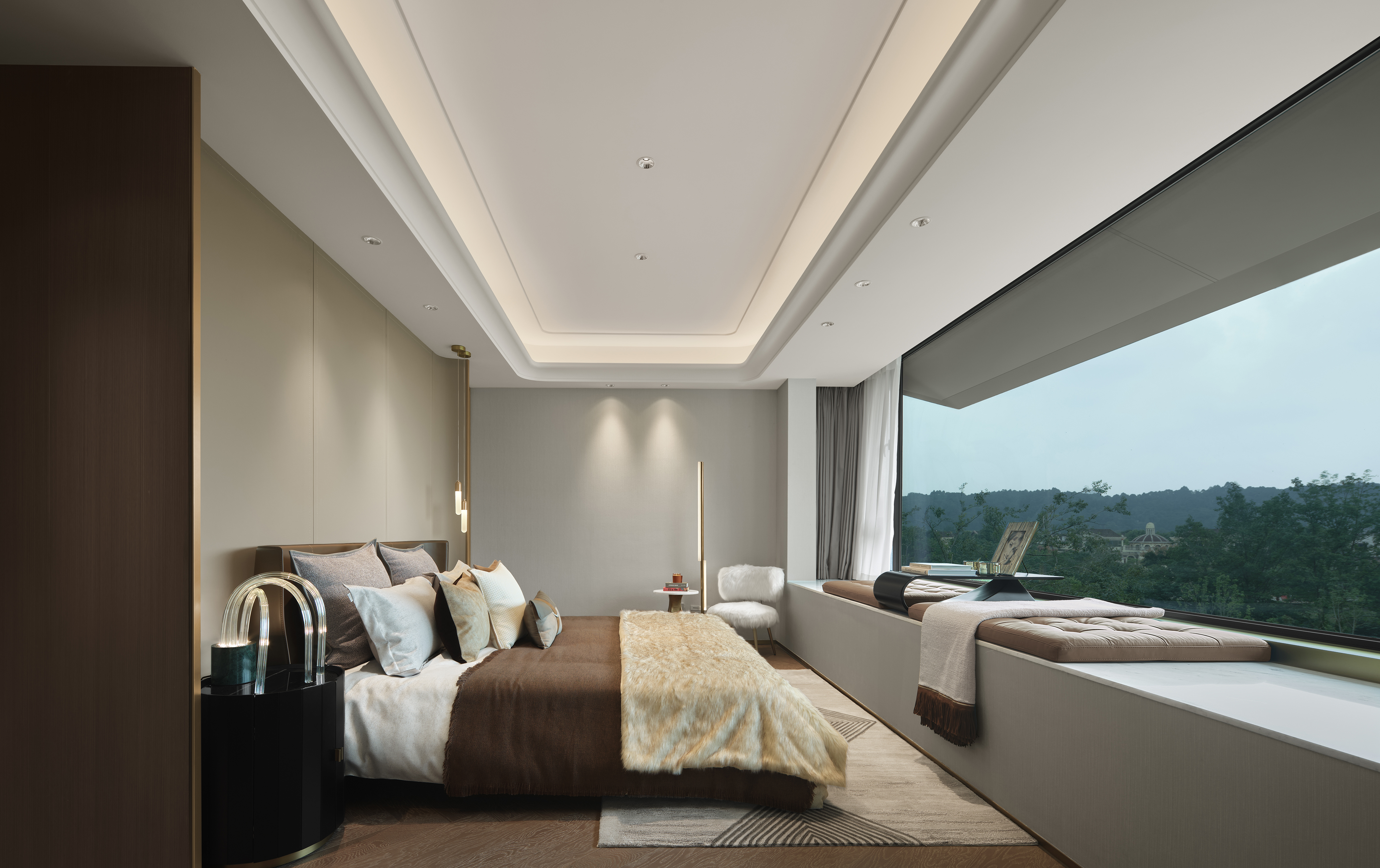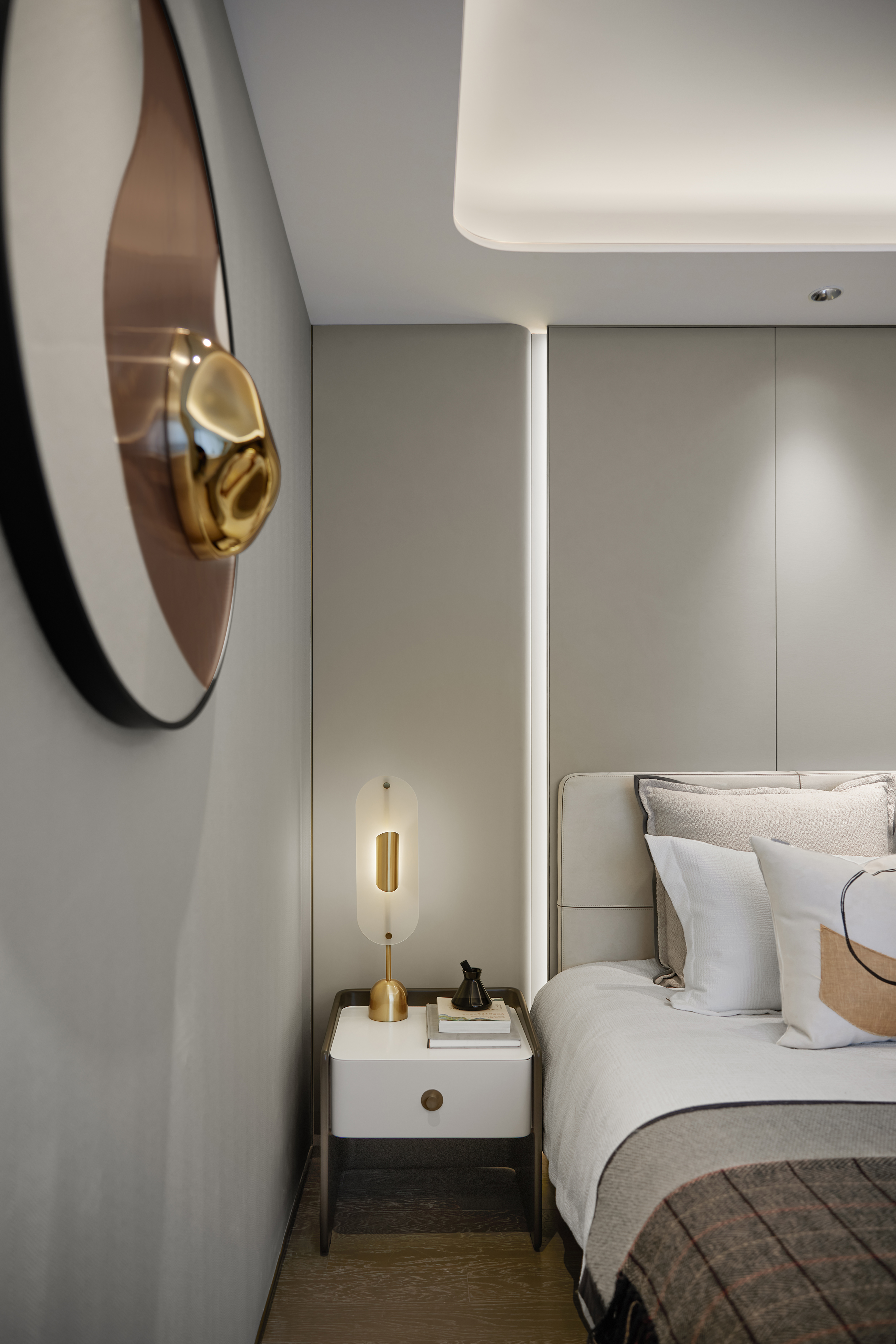 二楼的主卧室,保有了空间整体的空间气质与设计格调。皮革车缝拼接的硬质床背景,与床的暧深棕,形成恰到好处的色彩明暗对比。空间里软硬材料的运用,深浅色彩的采纳,既有节奏高低起伏的律动感,也不杂乱无章。