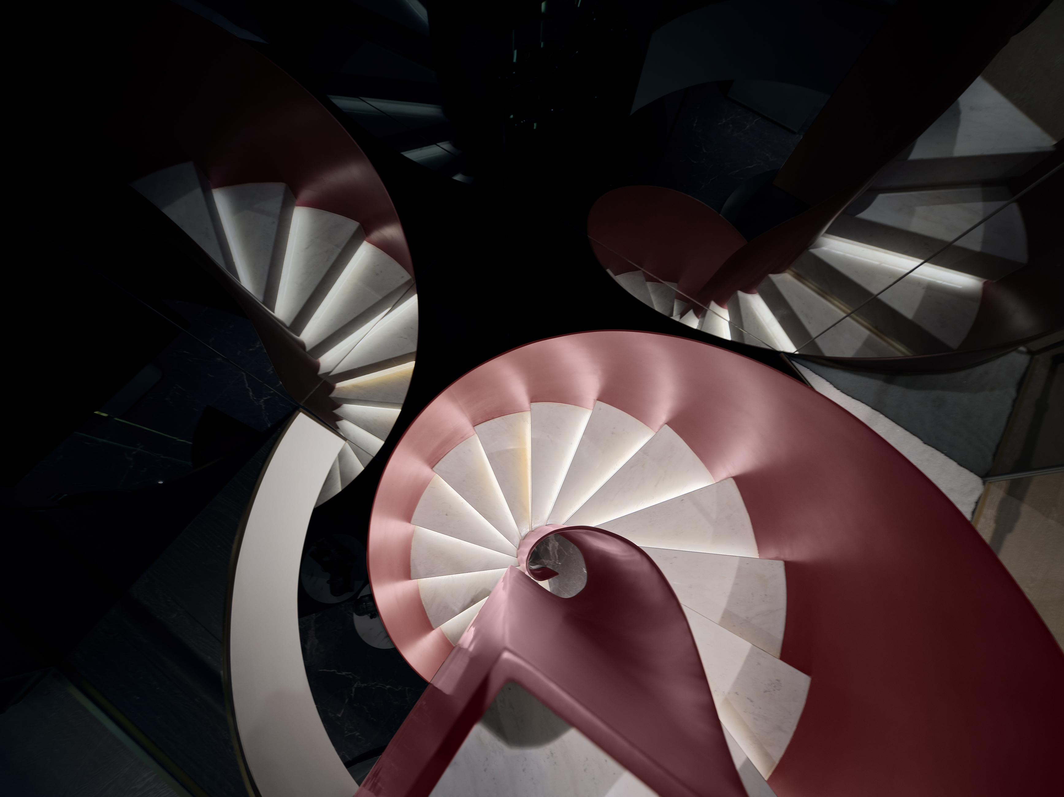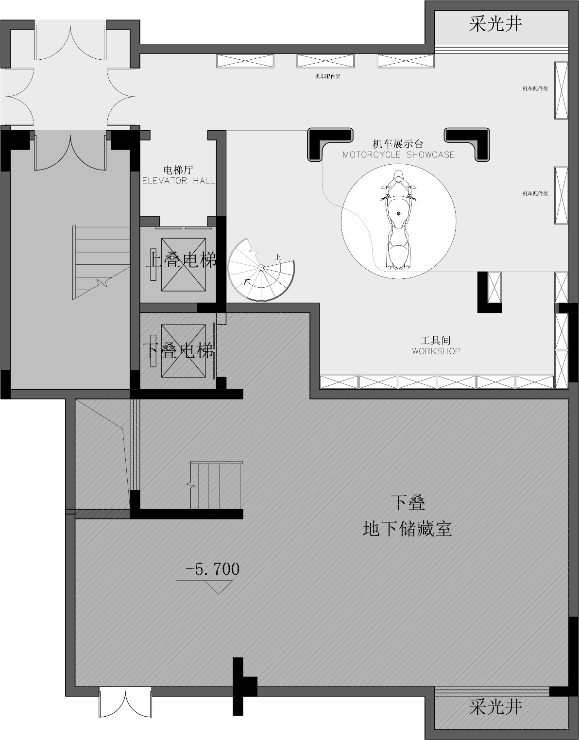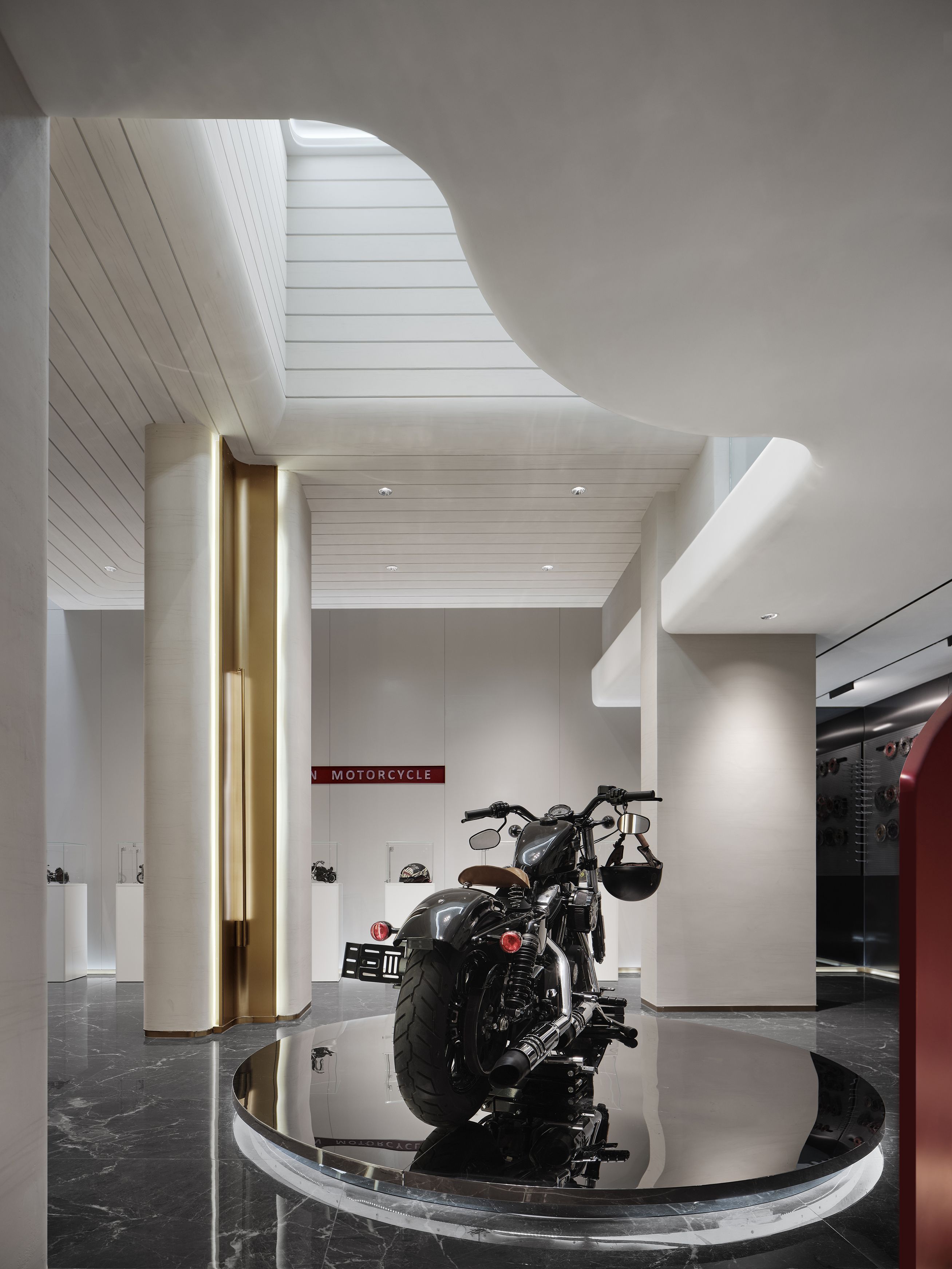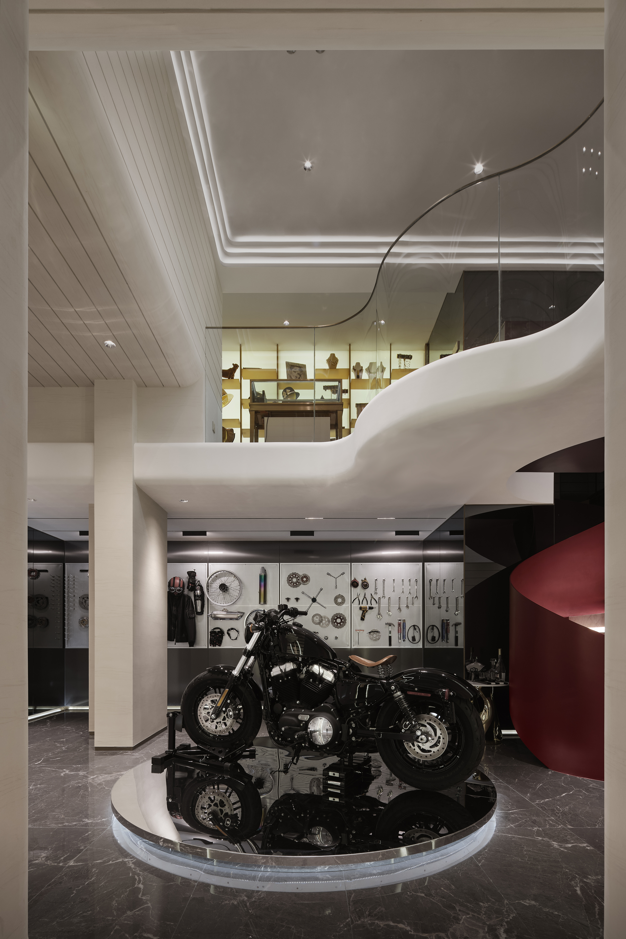 从一楼旋转而下,就是男主人的专属独立机车空间了,红黑的配色对撞,正是男主人在机车运动时那阳刚,冷酷,而又激情洋溢的映射。