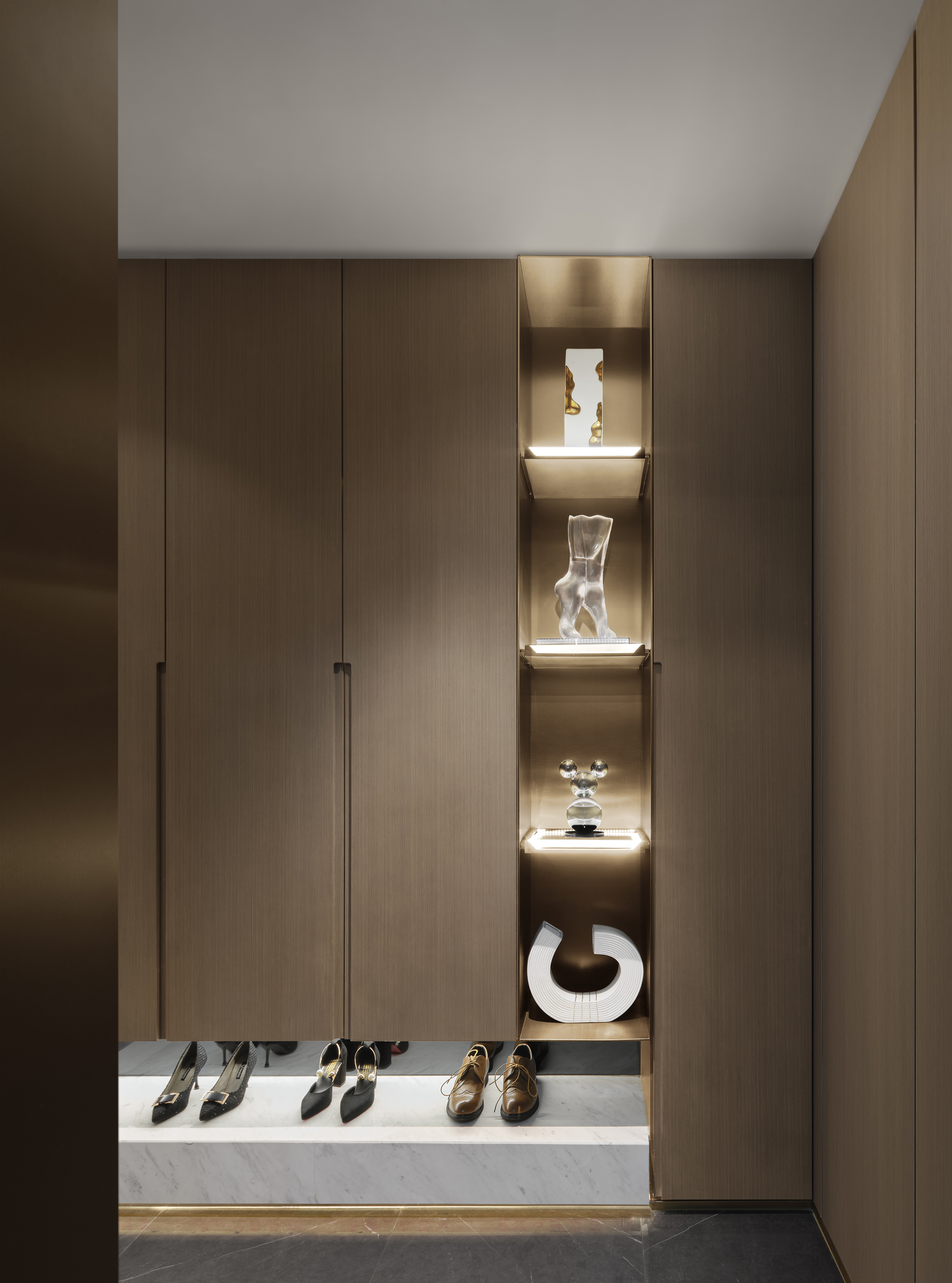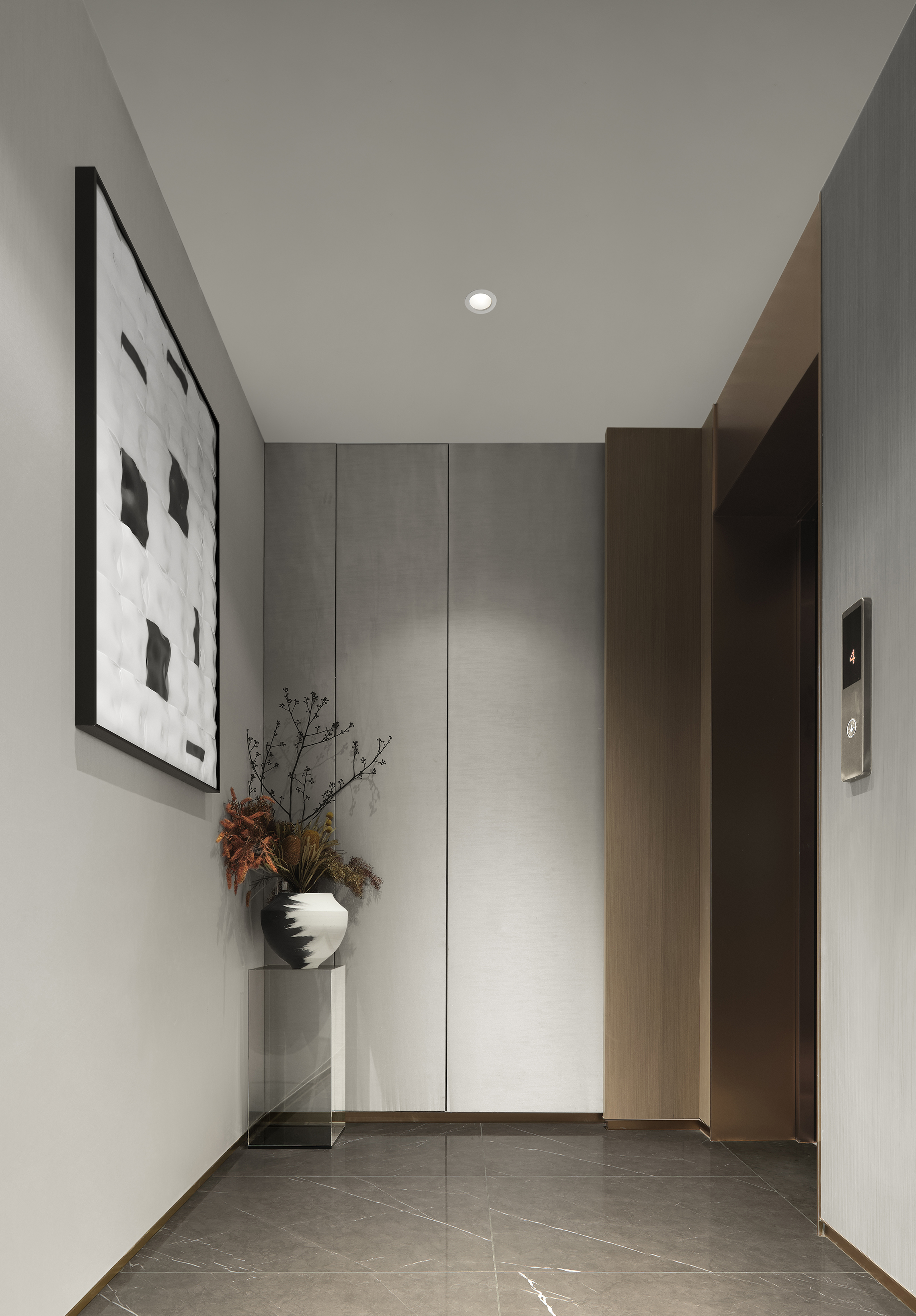 本户型为上叠户型,从一楼独家电梯到三楼入户,既为业主的独家入户衣帽鞋柜门厅。在这里我们生动的还原客户入户的生活情景与仪式感。