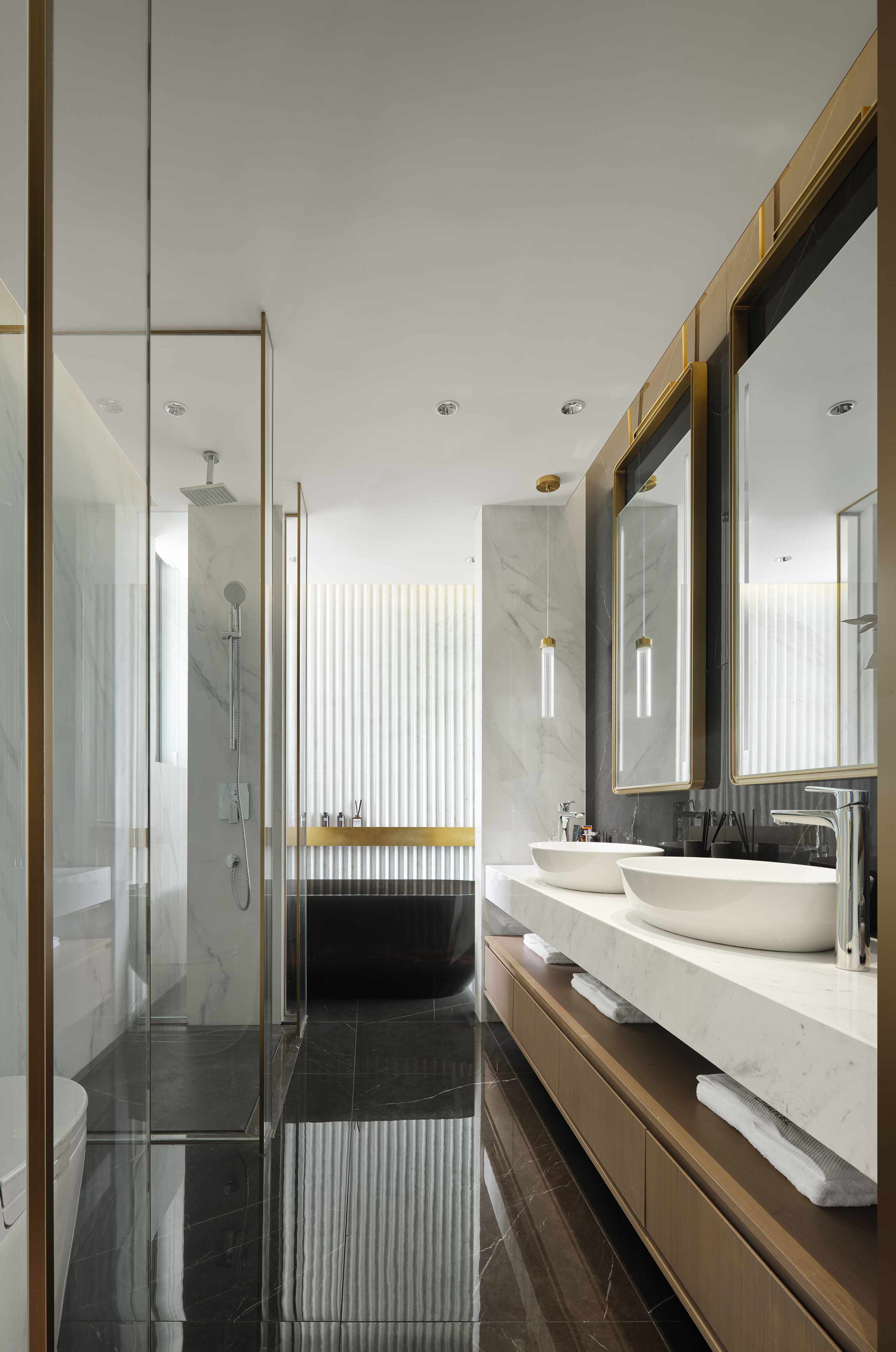 设计选材:主人房皮革车缝拼接的硬质床背景,与床的暧深棕,形成恰到好处的色彩明暗对比。空间里软硬材料的运用,深浅色彩的采纳,既有节奏高低起伏的律动感,也不杂乱无章。卫生间里深浅软硬的材料构成,宁静温暧的空间配色,让人有洗去每天劳累疲惫的安适感,身心轻松。
