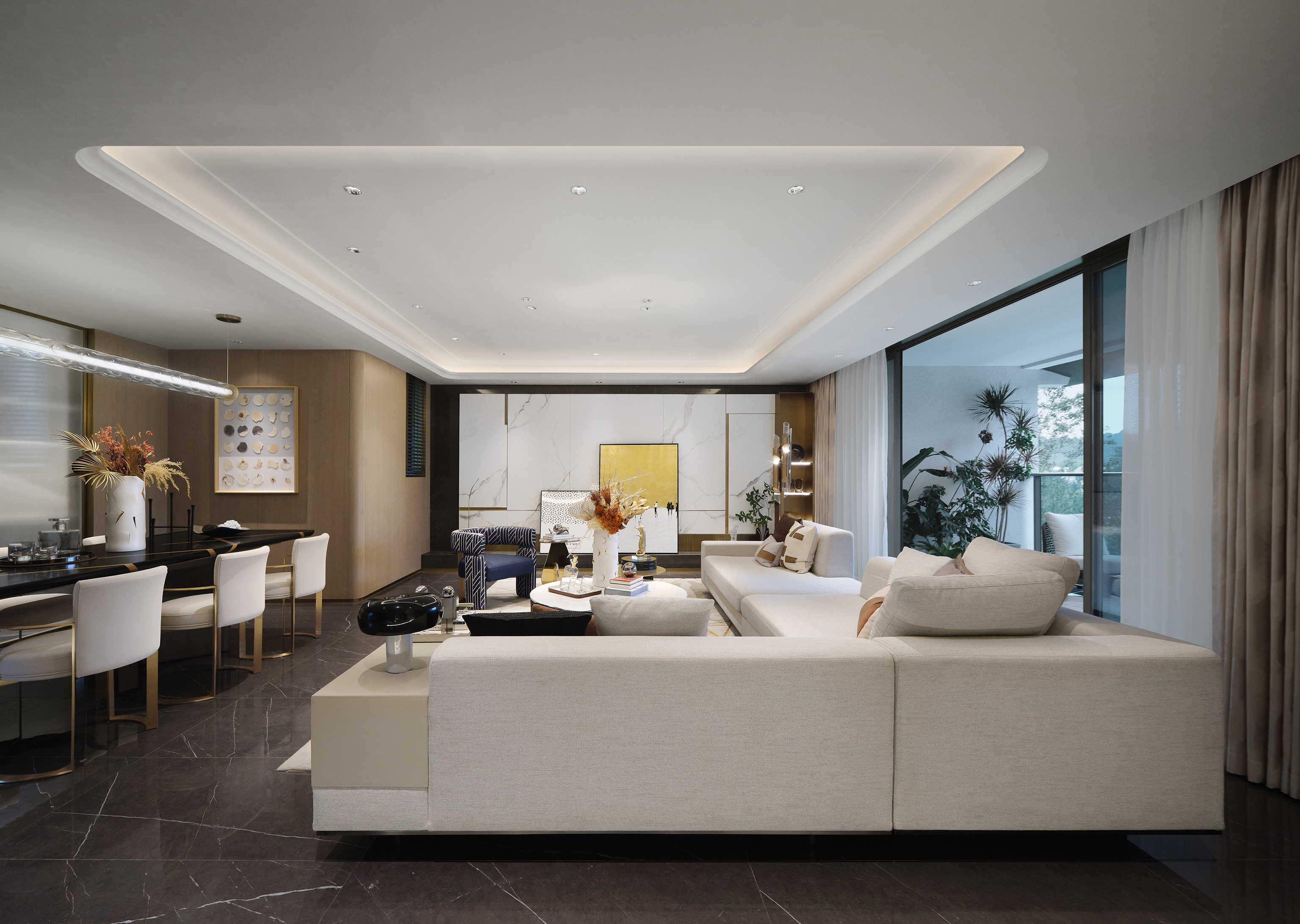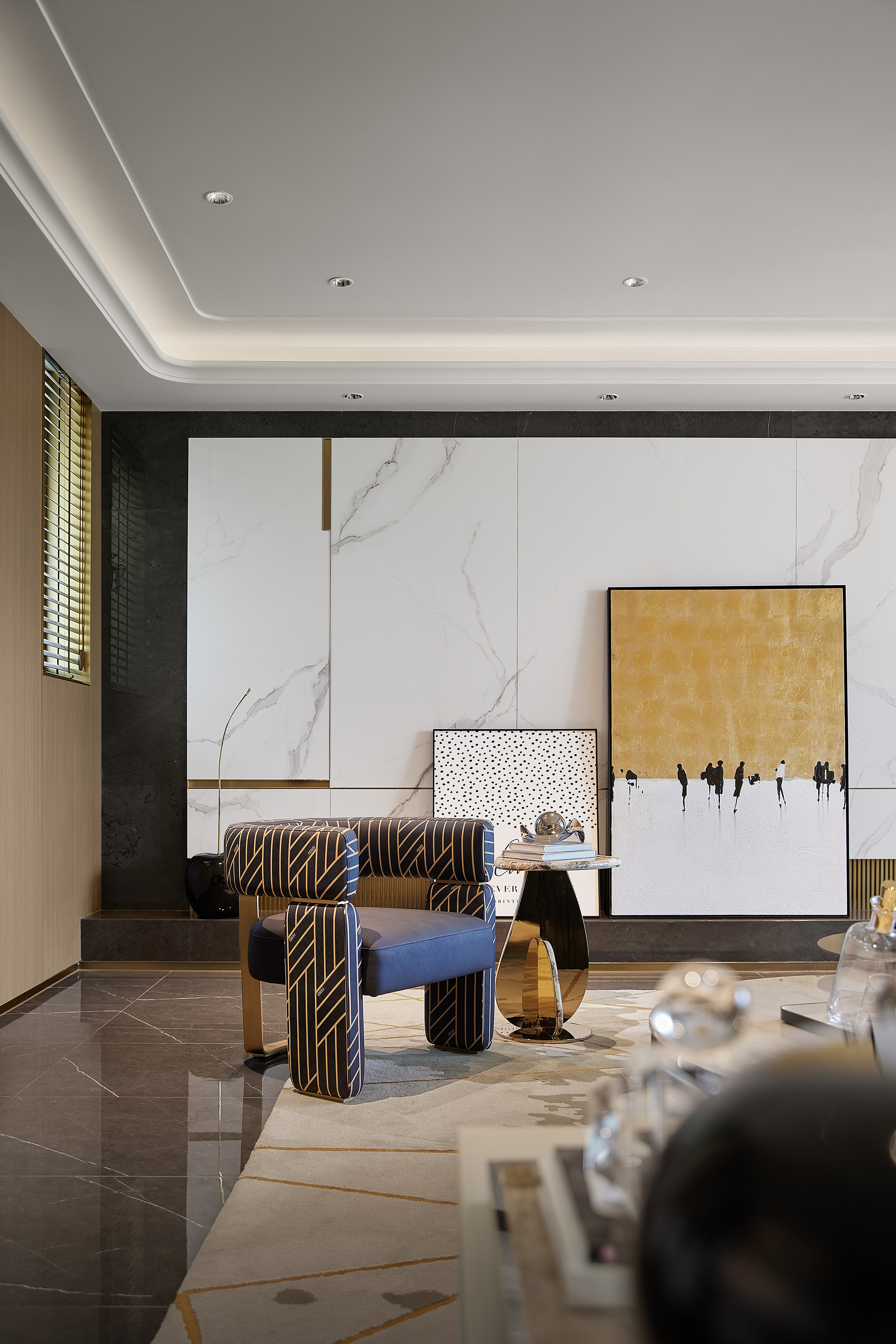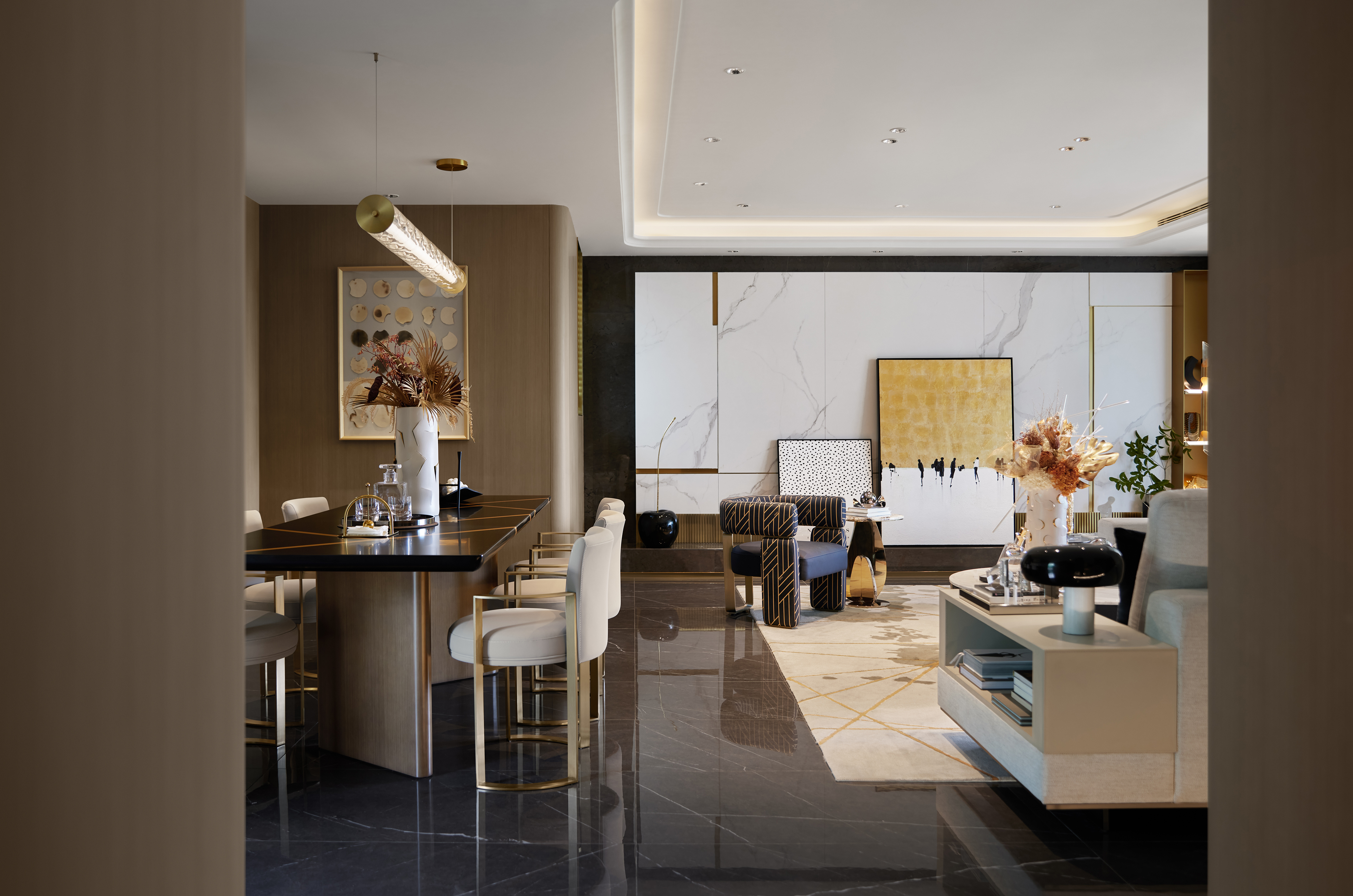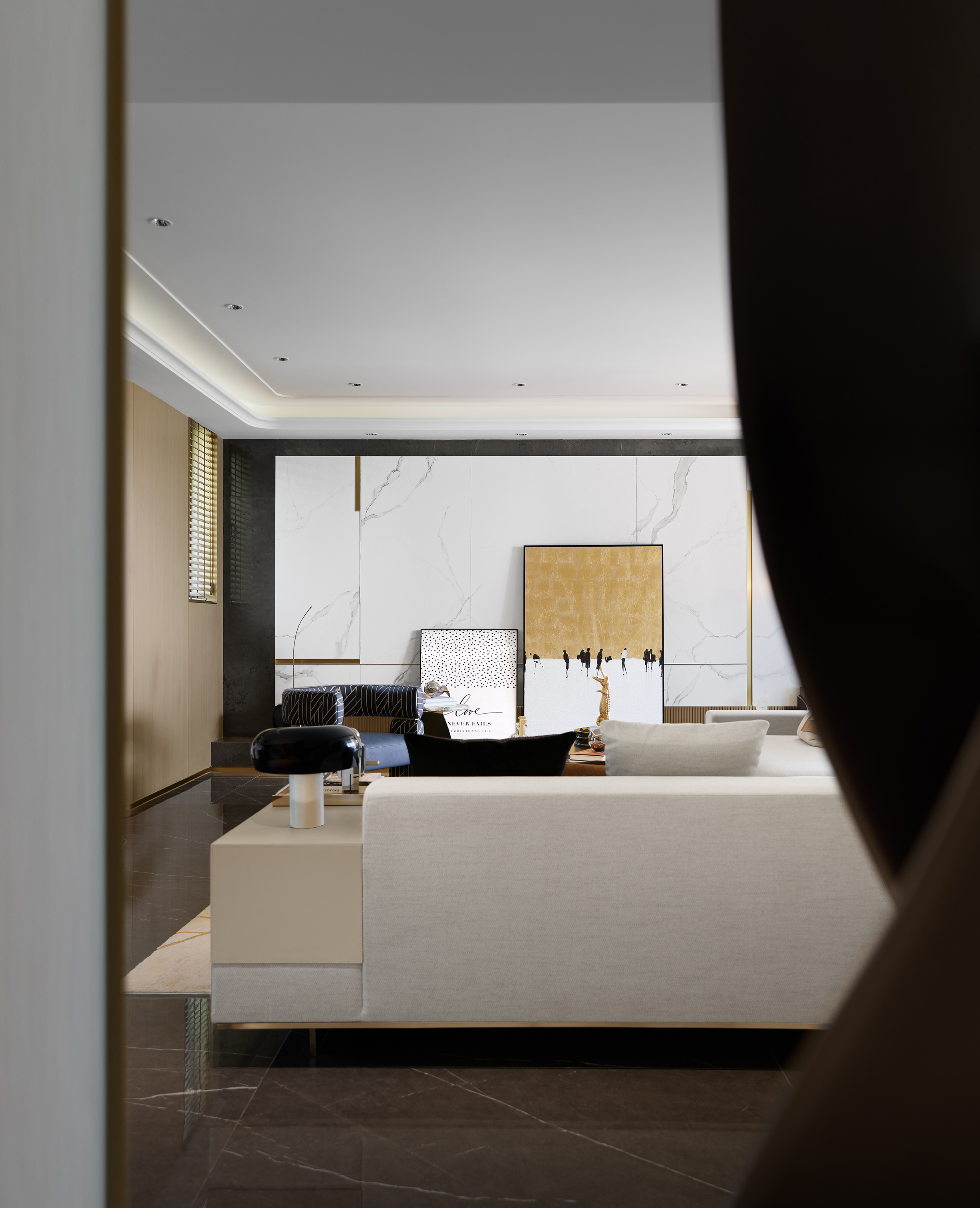 一层客厅,空间现代,时尚的气质之中,又有着一种都市中青年精英喜欢的精致奢华。每一件家具器物,都精致考究,极具品质感。暧橙配上格调棕的色彩搭配,让家在高级格调冰冷的距离感下,又有了生活与家的温暧。