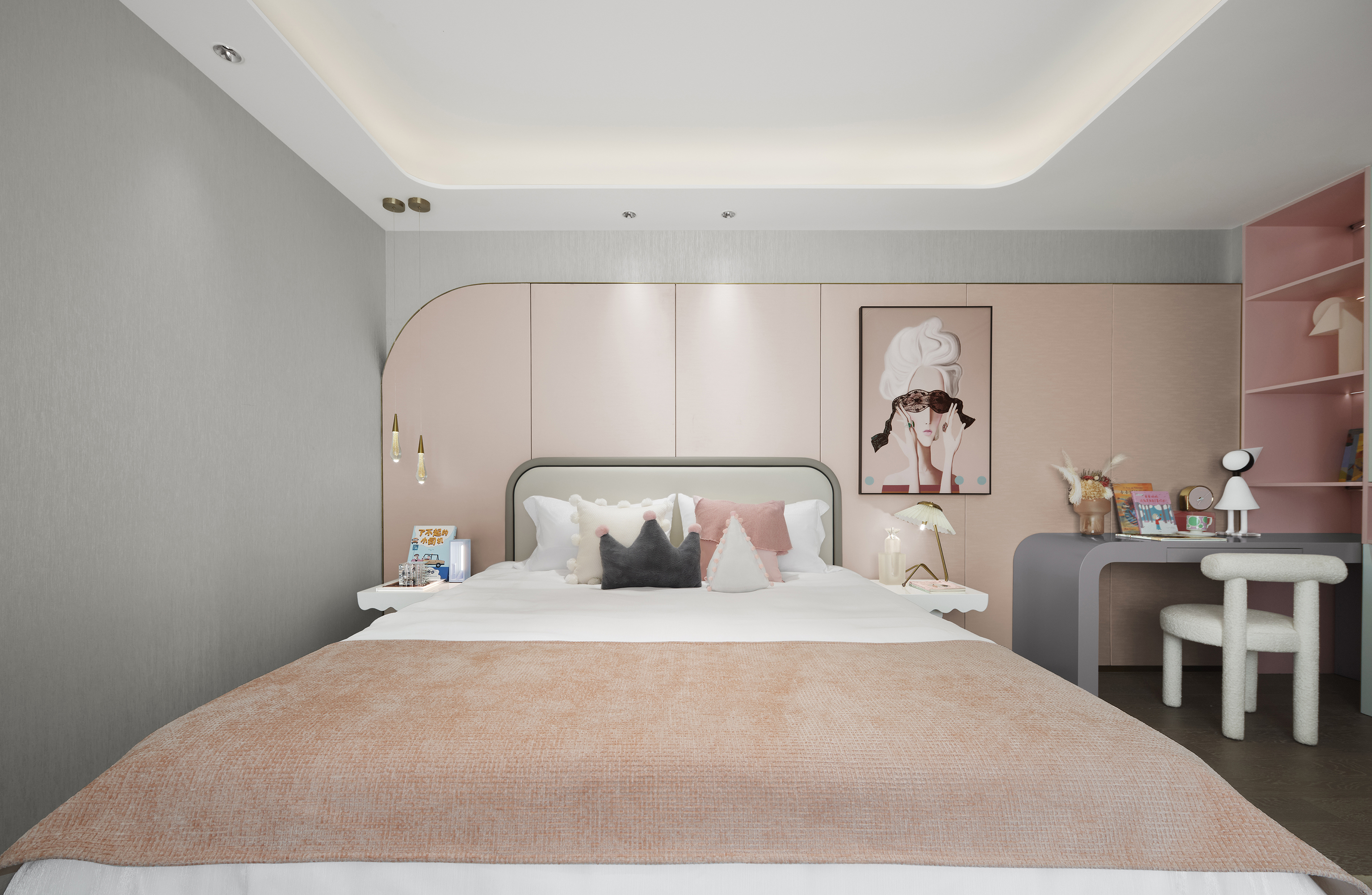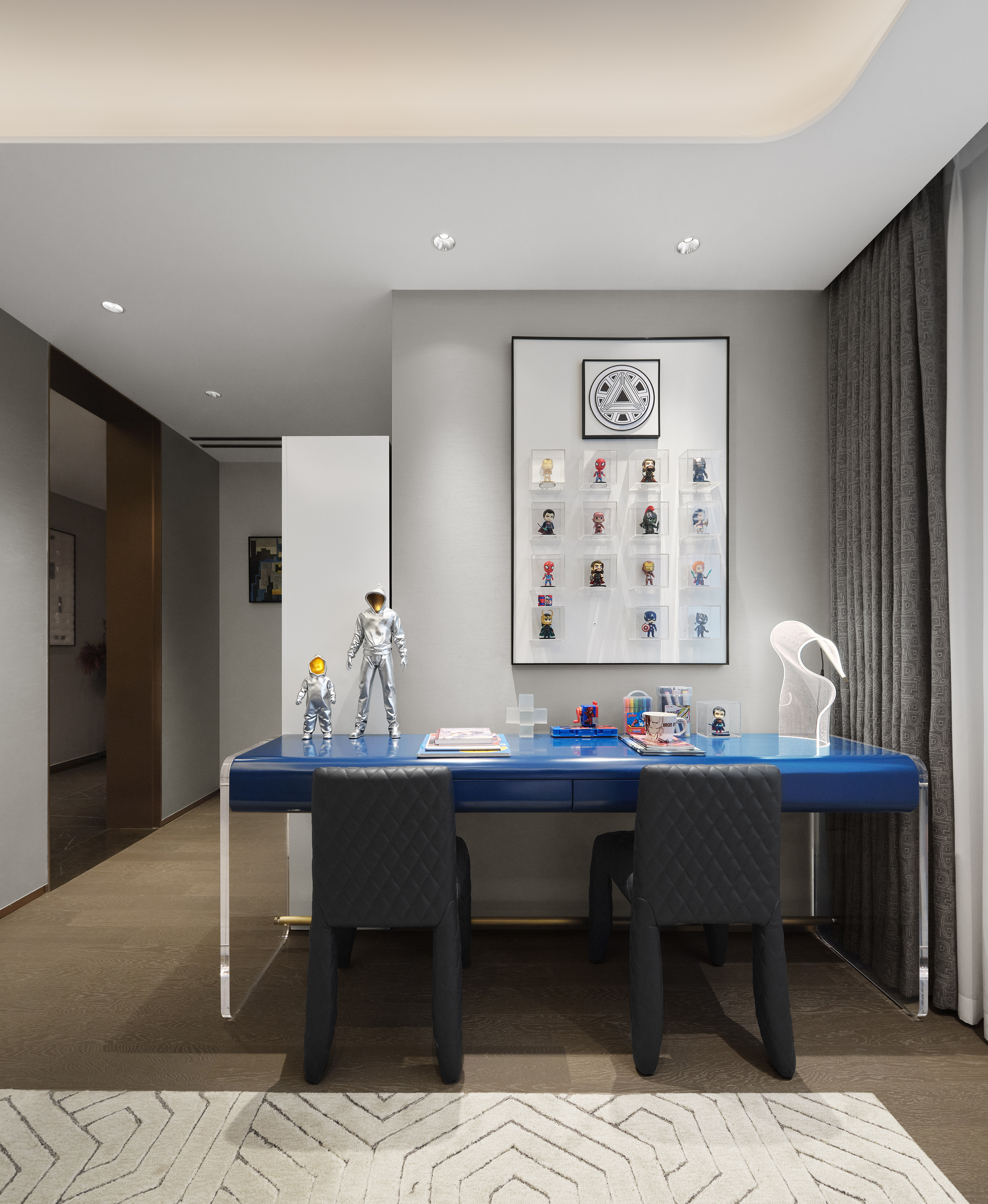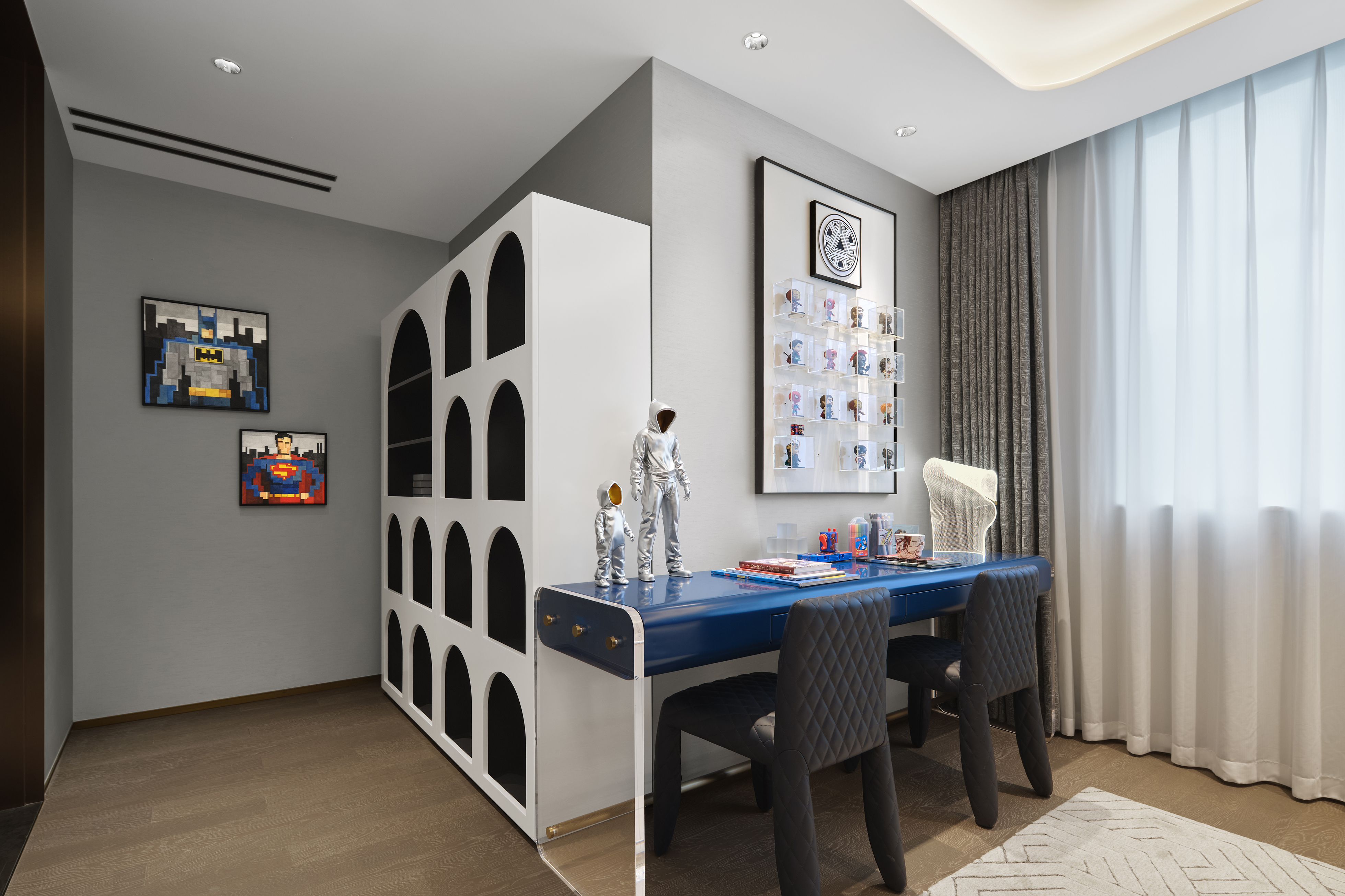 空间意境:一层老人房的专属空间,同样精致考究的陈列,延伸了客厅的格调棕的色糸,但是降低了色彩的饱和度与明度,更适合老年人沉着安静的审美习惯。一品一物,也展示着父母对生活的欢喜,听听老音乐,或是戴上老花镜,读几页喜爱的旧书。二楼的主卧室,保有了空间整体的空间气质与设计格调。皮革车缝拼接的硬质床背景,与床的暧深棕,形成恰到好处的色彩明暗对比。空间里软硬材料的运用,深浅色彩的采纳,既有节奏高低起伏的律动感,也不杂乱无章。小男孩活泼的个性,在空间展露无遗,红蓝对比的色彩,取自电影美国队长的造型。也刚刚好企合了小男孩的兴趣爱好,活泼好动,热烈勇敢。梦想着有一天长大,会成为拯救人类的大英雄。小女孩温婉柔美,柔和的线条感,在空间流动,淡淡的粉色,甜美而又梦幻,正是儿时逐梦的美好时光。