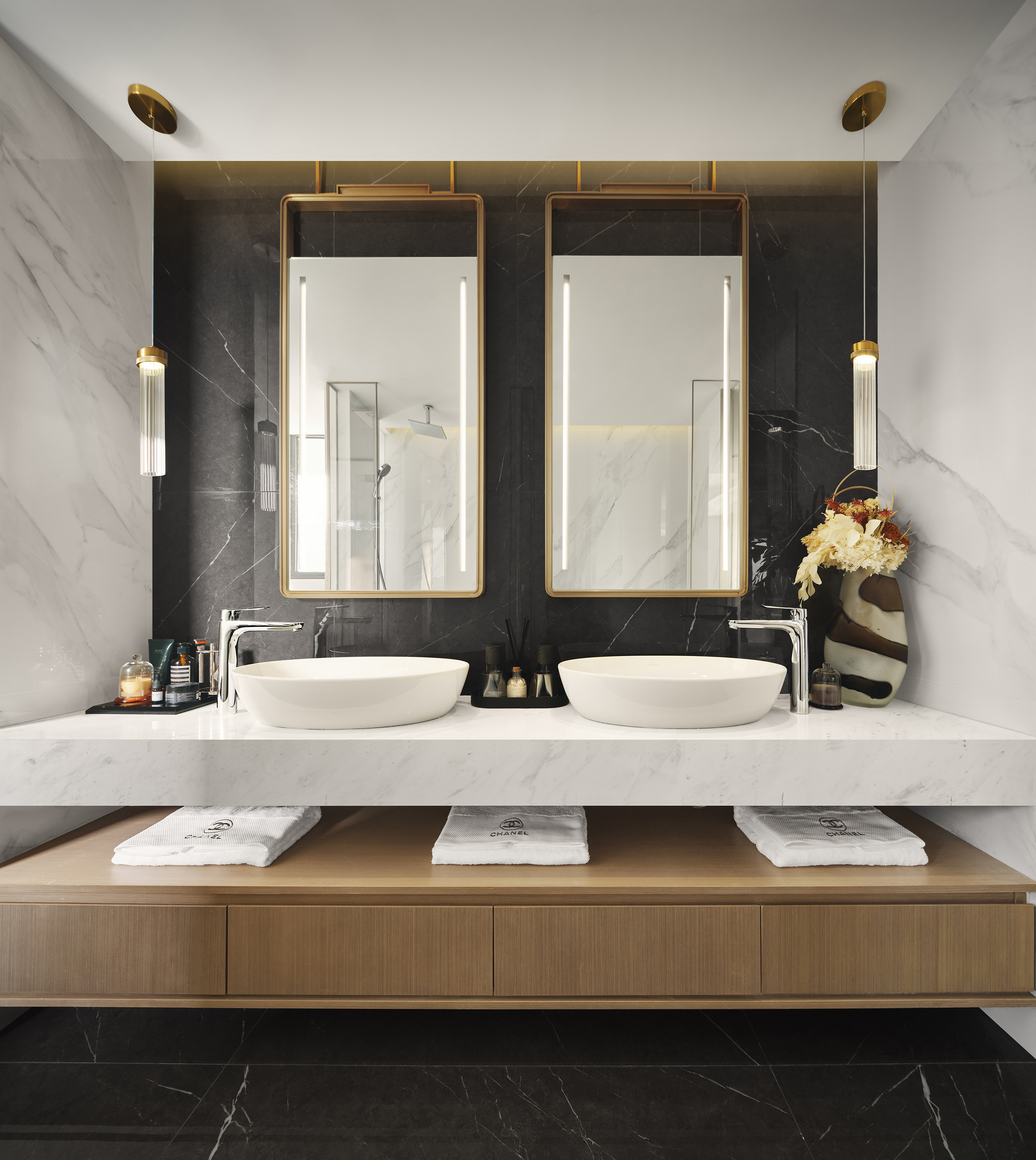 卫生间里深浅软硬的材料构成,宁静温暧的空间配色,让人有洗去每天劳累疲惫的安适感,身心轻松。