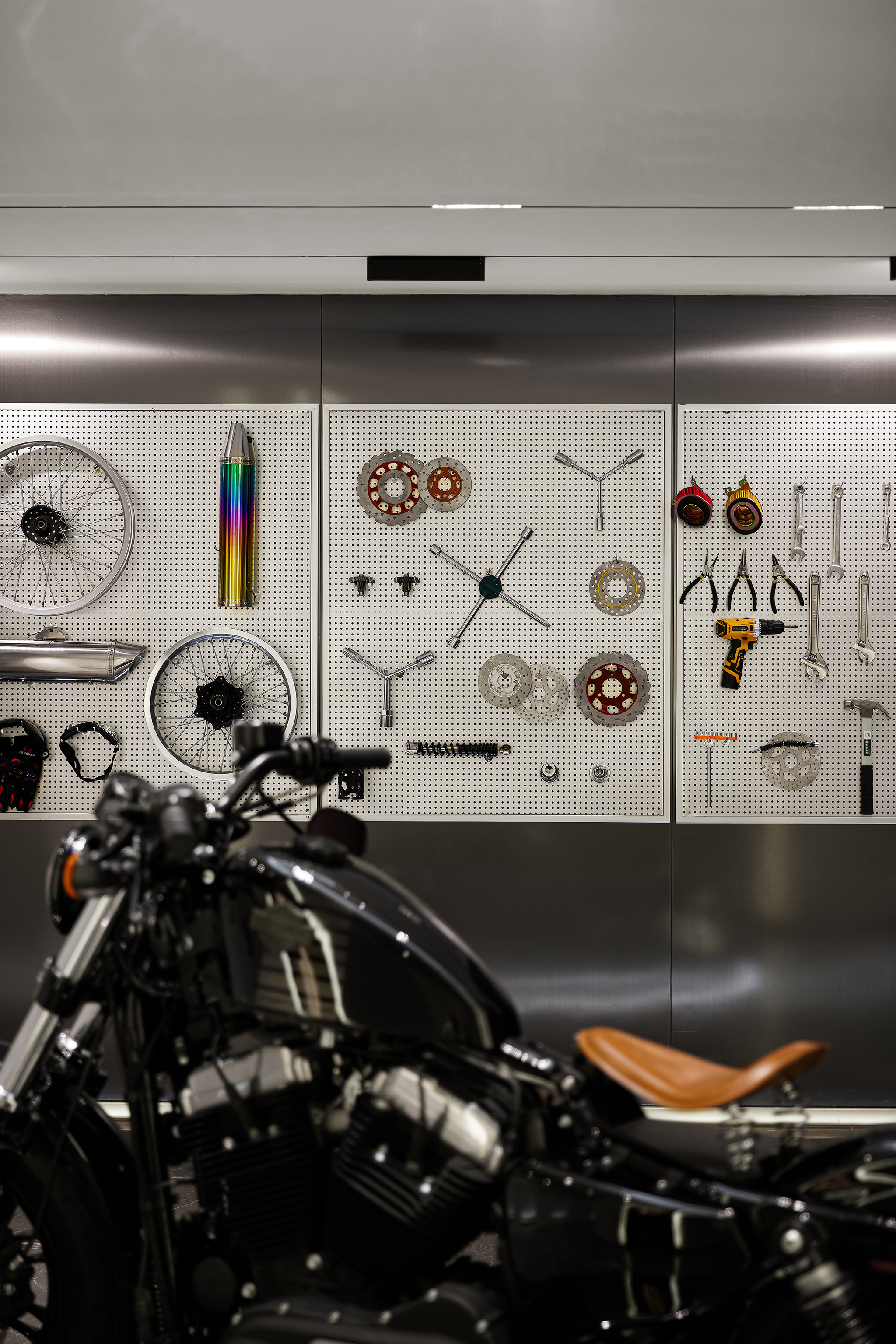 墙上挂满了丰富的机械工具与零配件,其实,每一个男人,内心都住着一个长不大的男孩。冲动,激情与冒险,是男人骨子里的天性吧。平日都市理性的工作与思考,压抑了男人想在大自然中拼命追逐奔跑的野性,也许机车就是男人完成理想最适合的玩具。