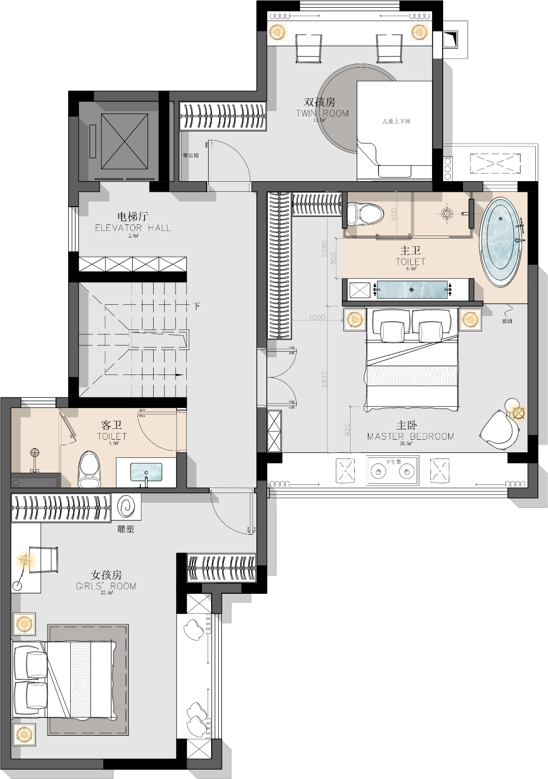 二层这家庭成员的主要居住区,主人房,男孩房,女孩房。