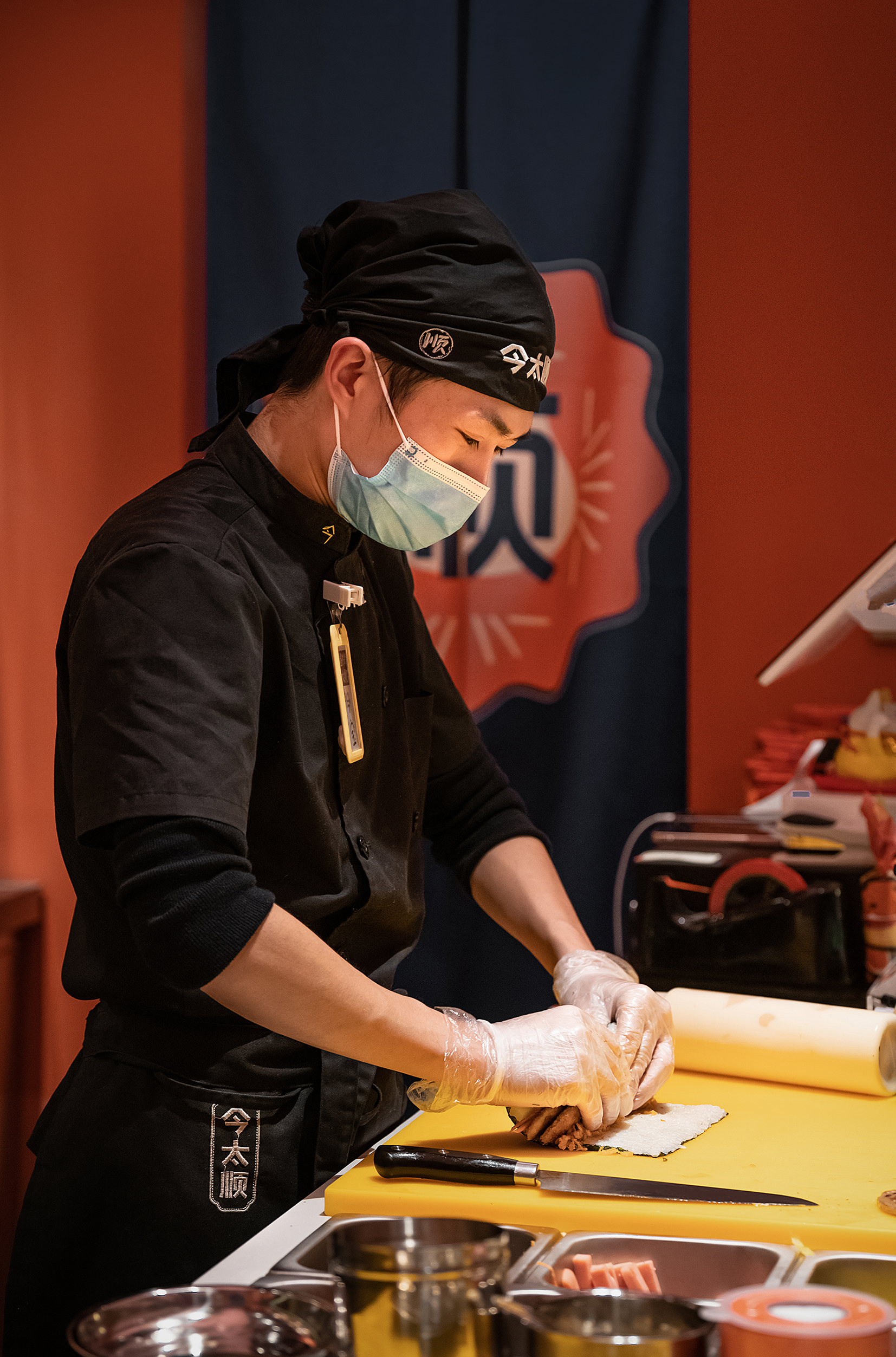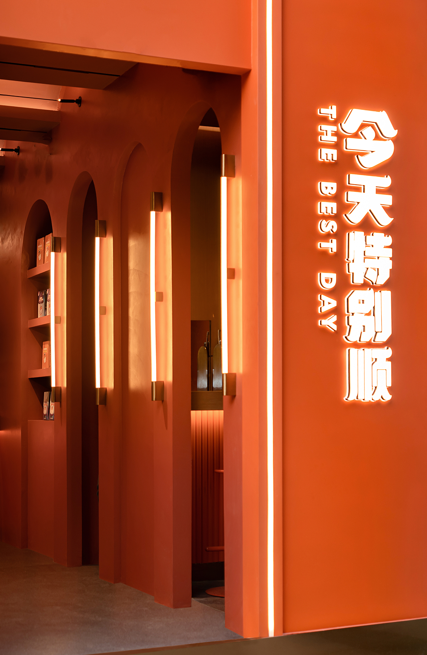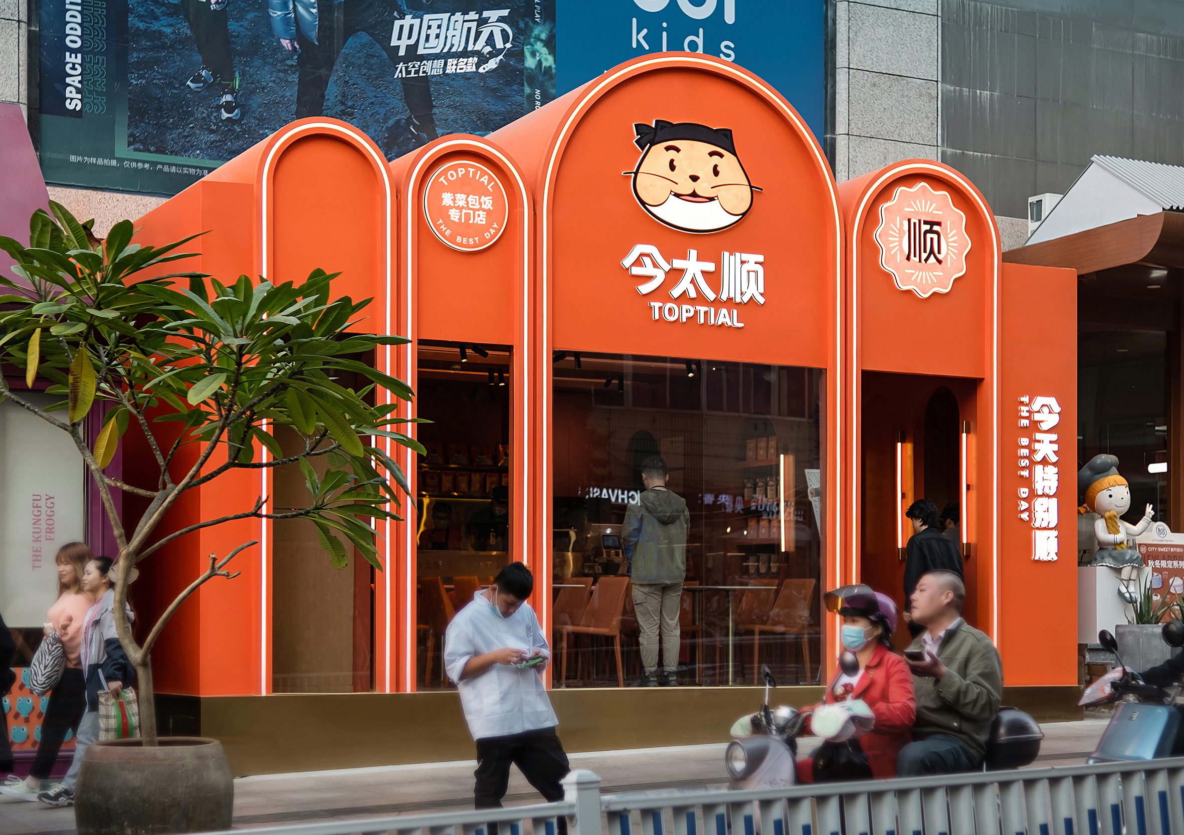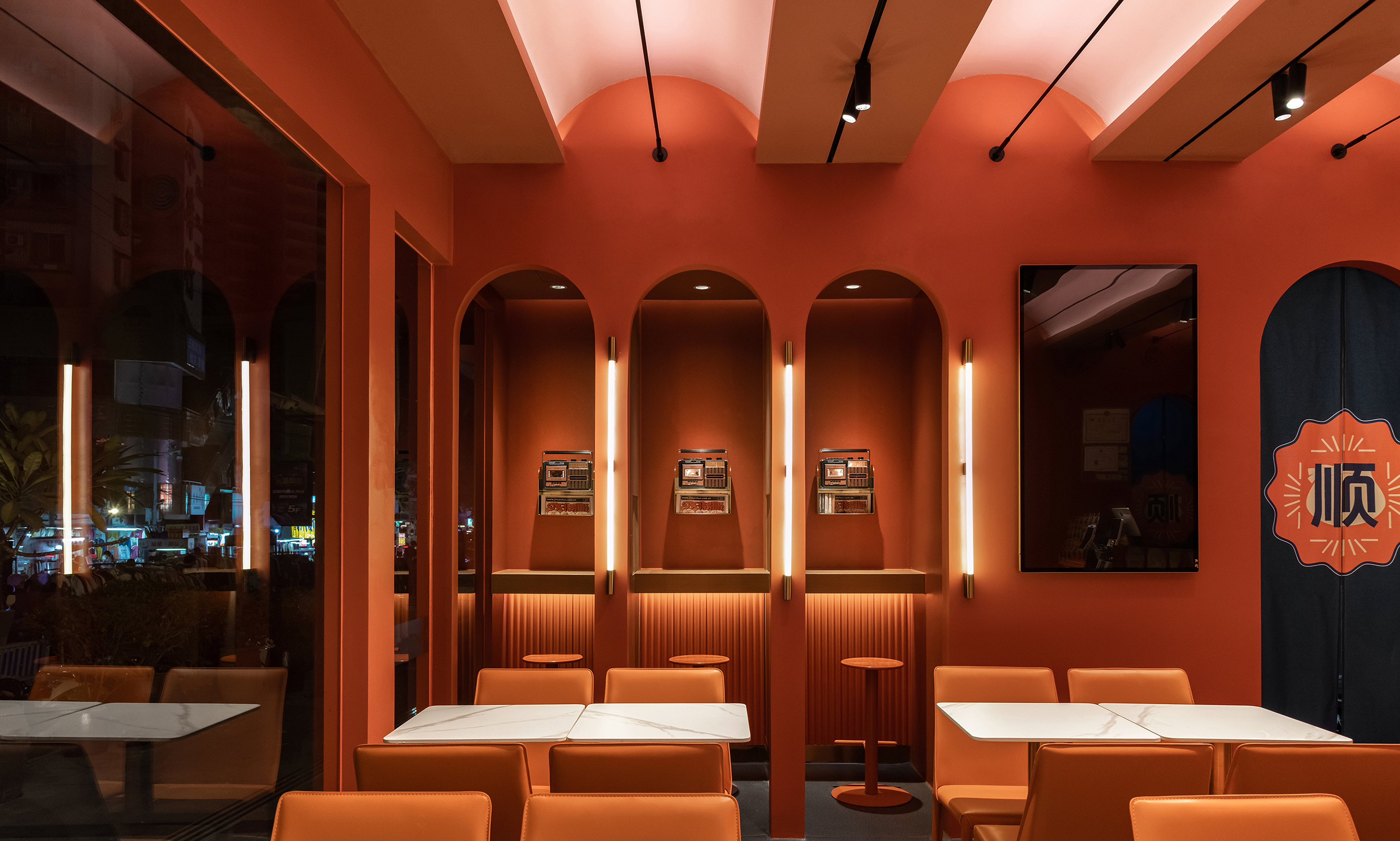 本项目位于南宁朝阳广场西关新天地,项目选址属于老南宁的市中心的朝阳西关临街店面,由于商业店面结构的特殊性,空间结构一半面积为室内空间,一半临街面积为露天需要外搭建筑,提供了良好的店面形象建筑设计的条件,造就了整体门面设计的可塑性,建筑与室内更加完美的结合,通过结合品牌文化,食材菜品特色,精准提炼设计元素,将出品食材造型特有的圆形形态,取其半圆形式与直线条结合,作为建筑与室内空间的设计元素,贯穿于建筑与室内,给予建筑空间特有识别度,打造出本建筑应该有的IP。