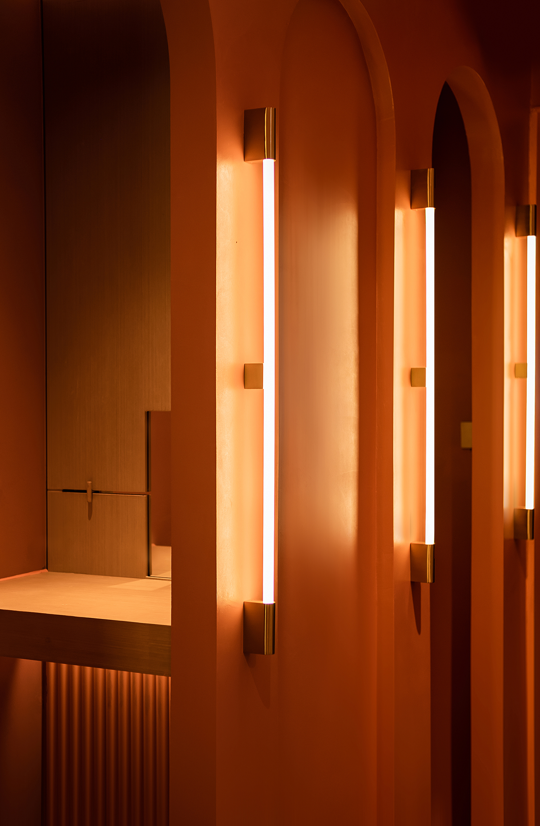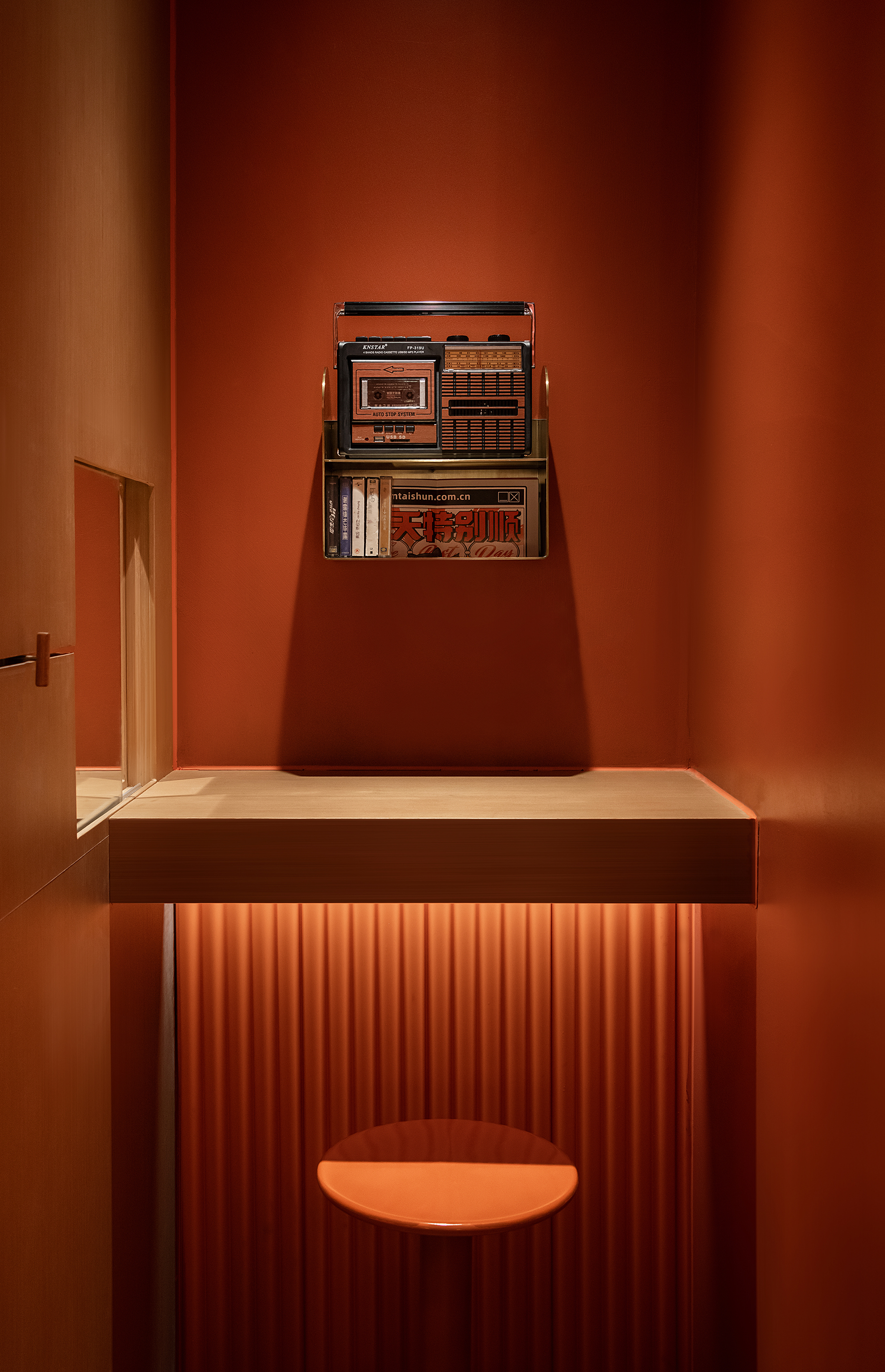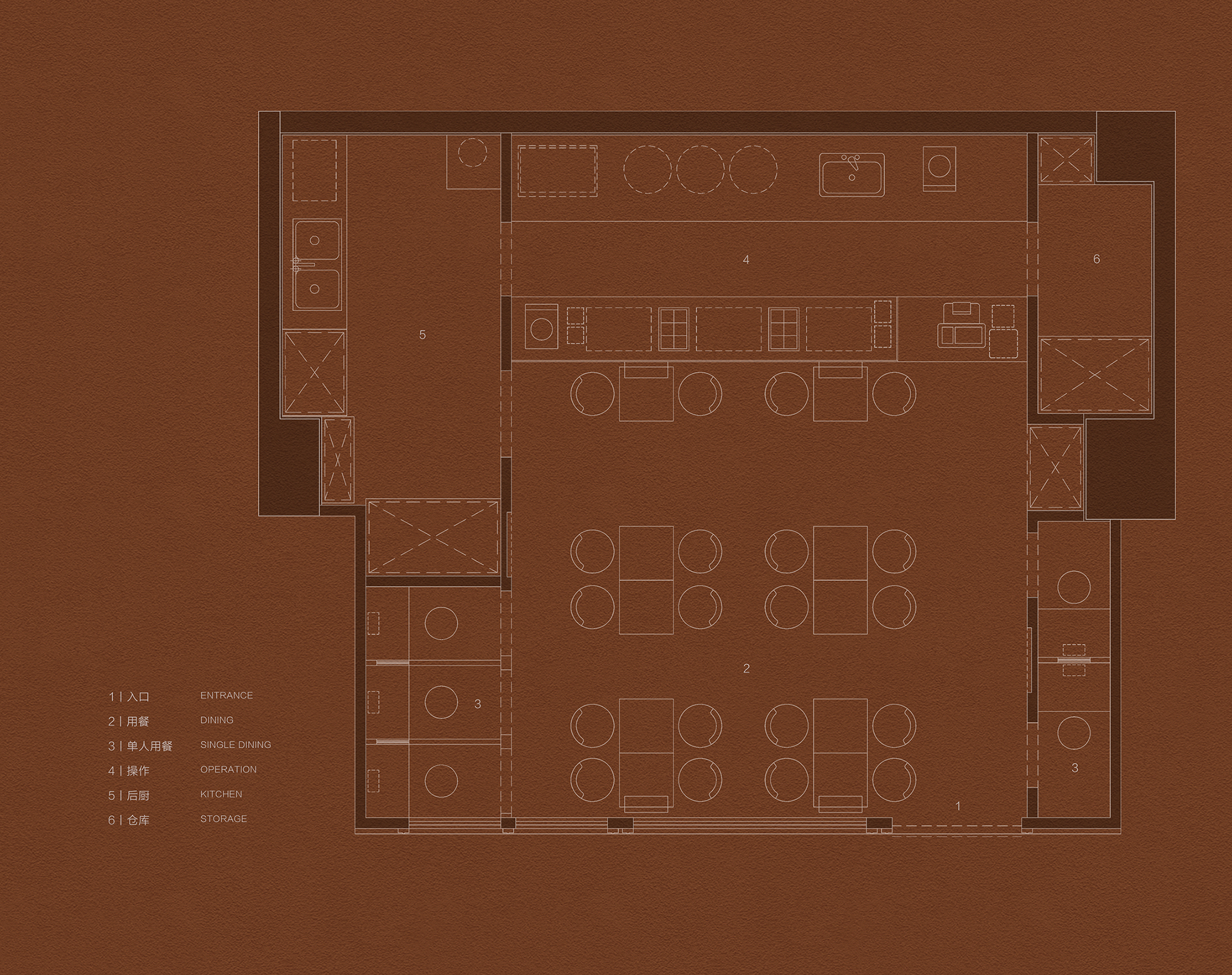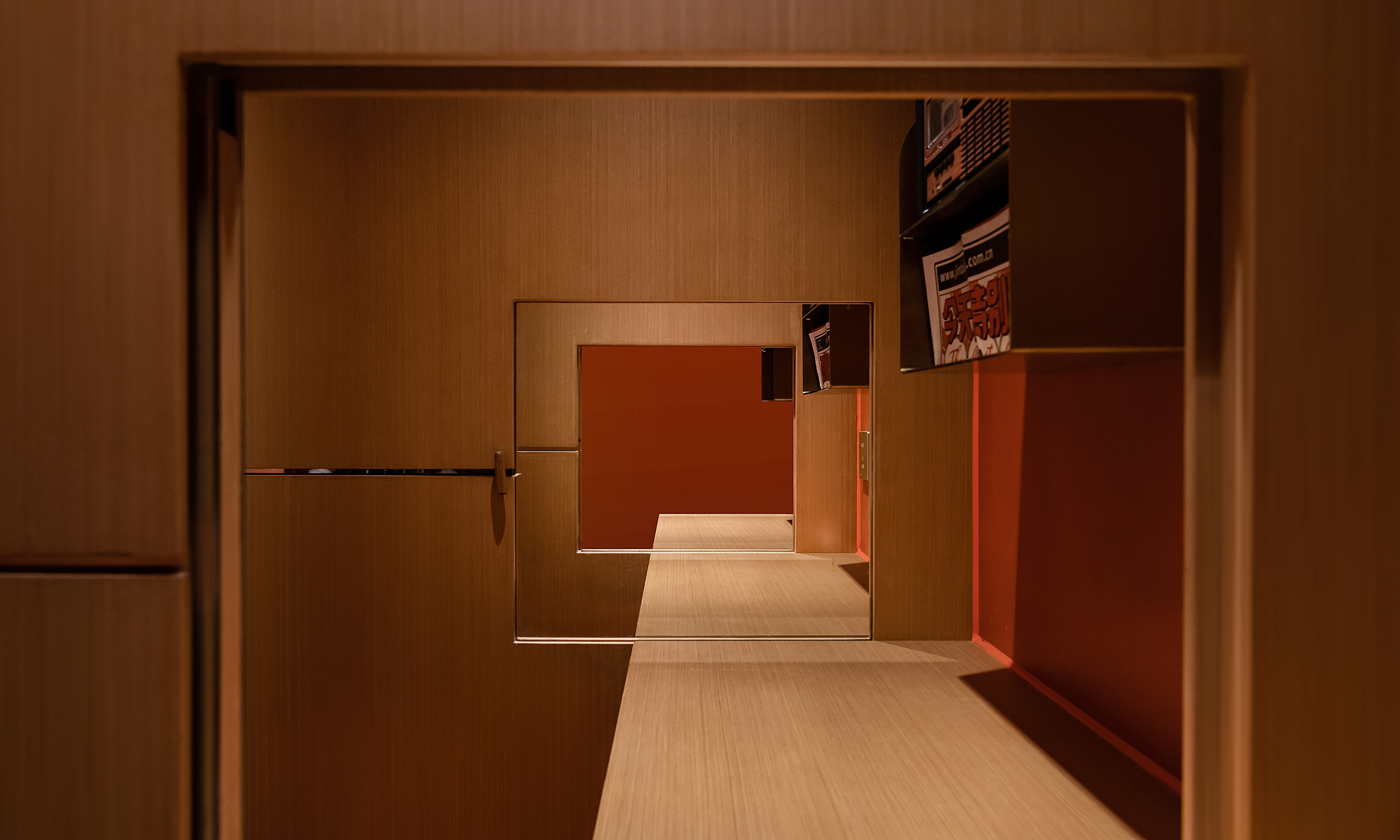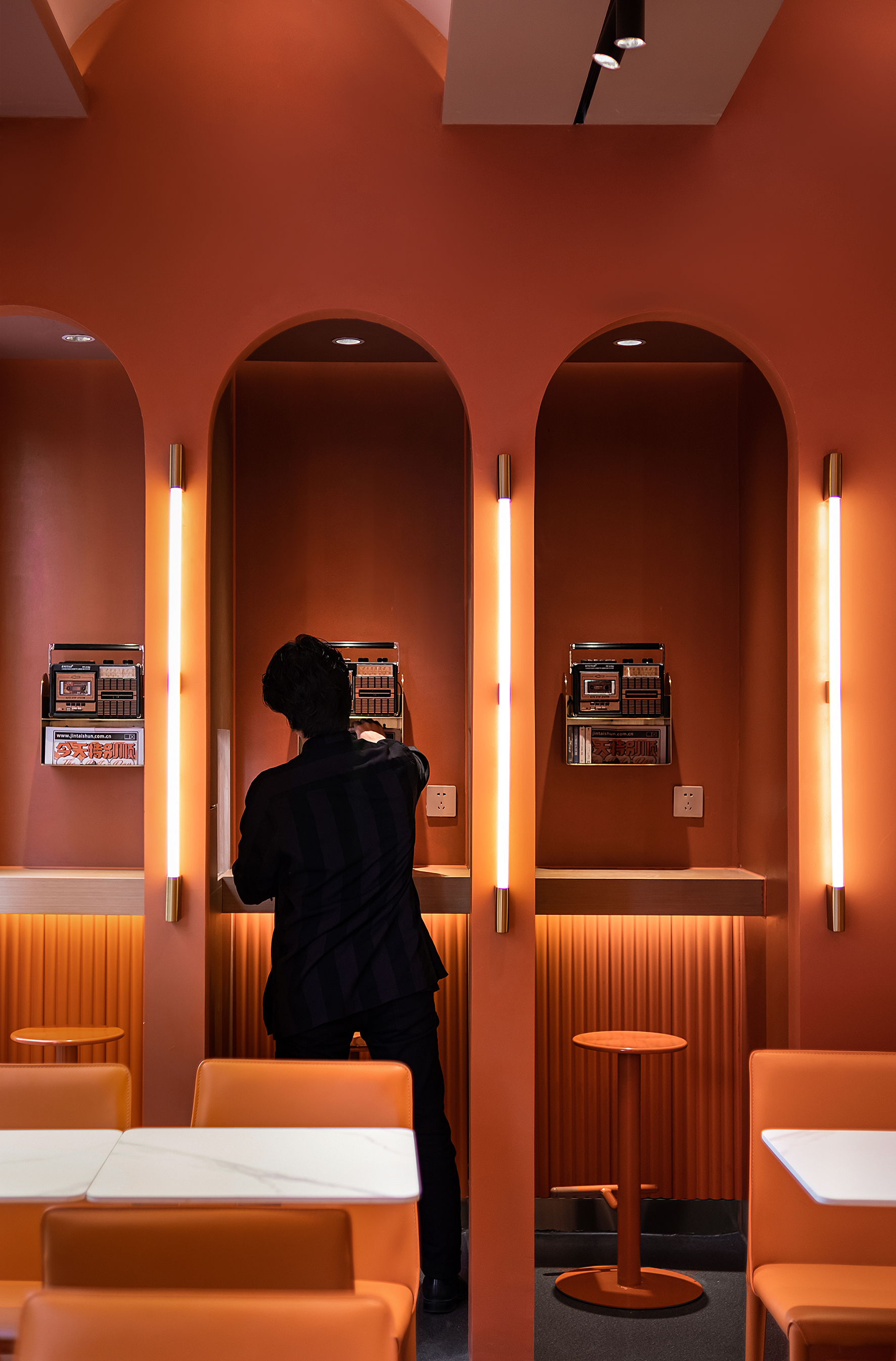 从平面布局可以看出,设计师将就餐区分为两部分,中间部分为散座就餐区,左右两侧设置了单人就餐间,给予部分就餐客人一个独立空间,在空间与空间之间设置拉板式台面小拉门,增加空间与空间之间的趣味性与交互感,让单人间的就餐客人可以相互互动,也可以拉紧小拉门,照照镜子化化妆,吃完后收拾一下妆容迎接下一站。