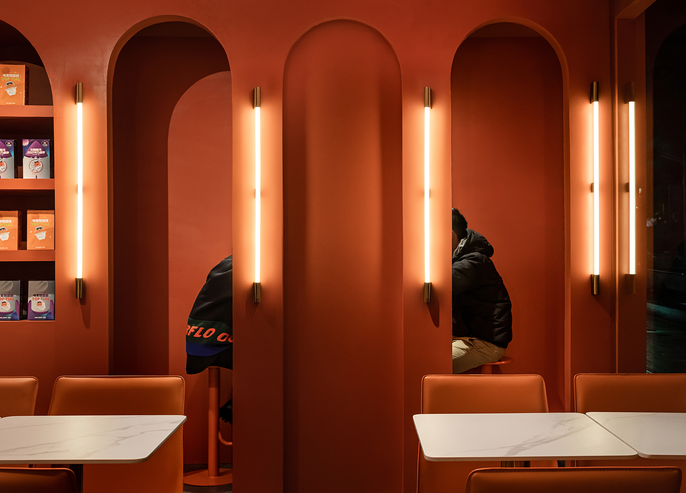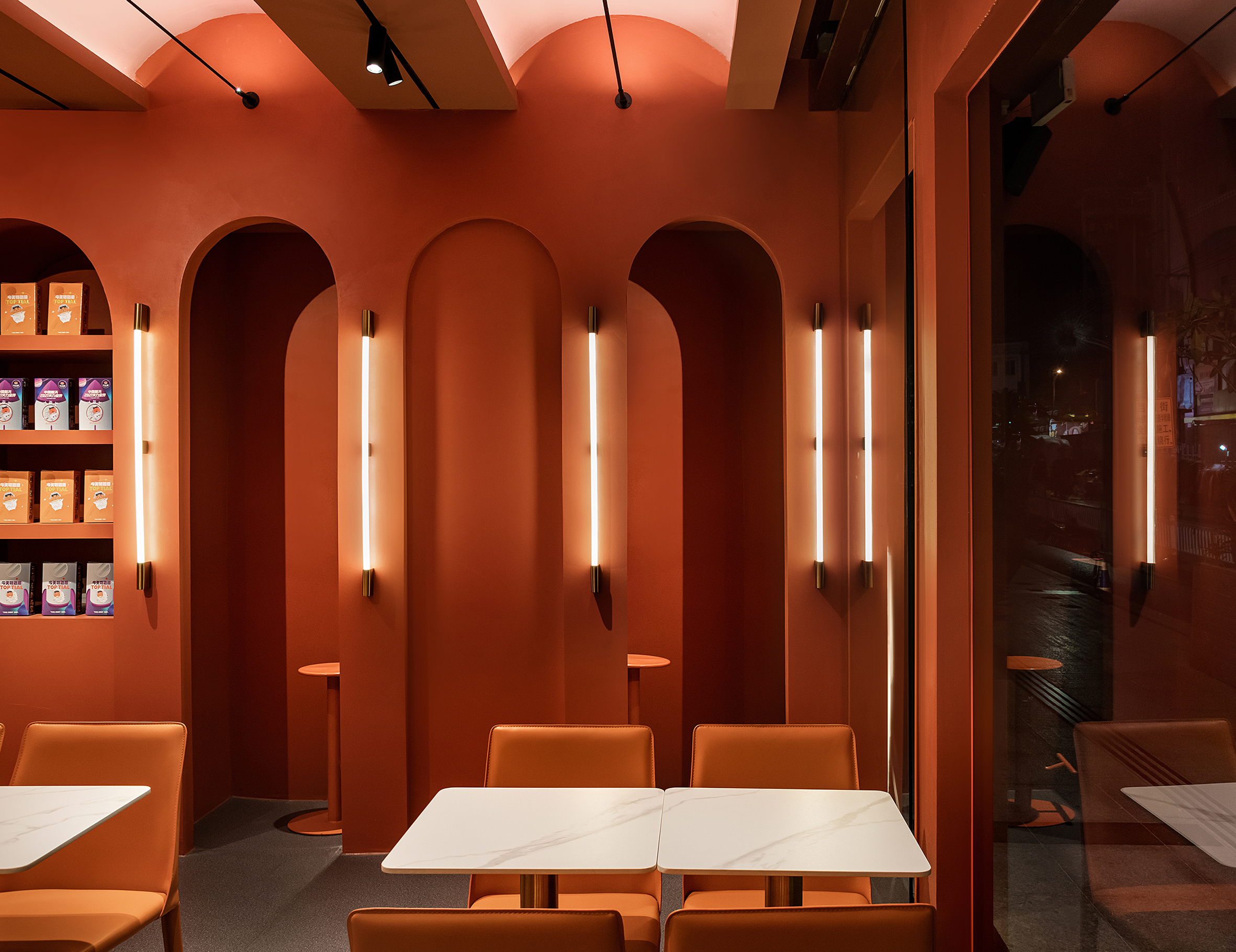 建筑沿用品牌原有色彩系统加以整体配搭,将建筑与室内色彩融合统一,打造建筑与室内设计的高级感与周边环境形成强烈对比,让店面在临街店面中脱颖而出。