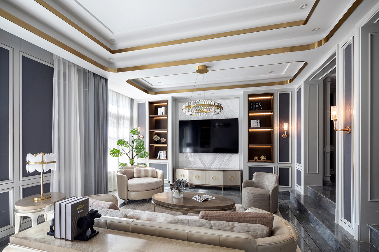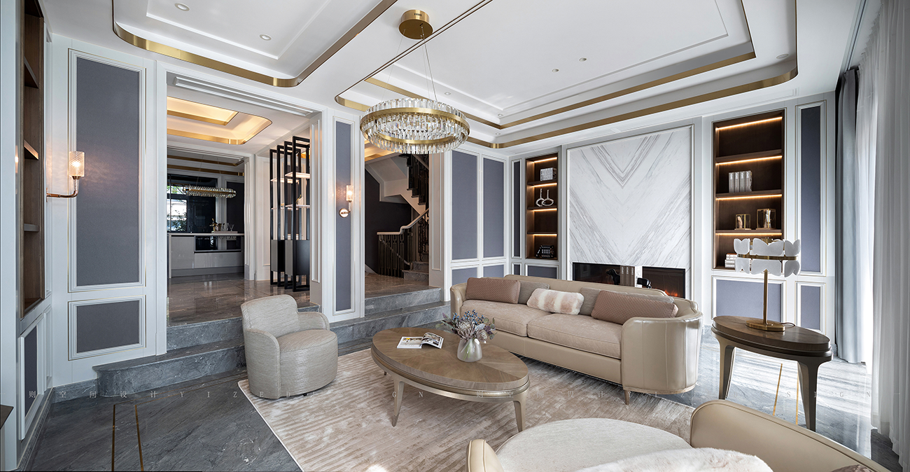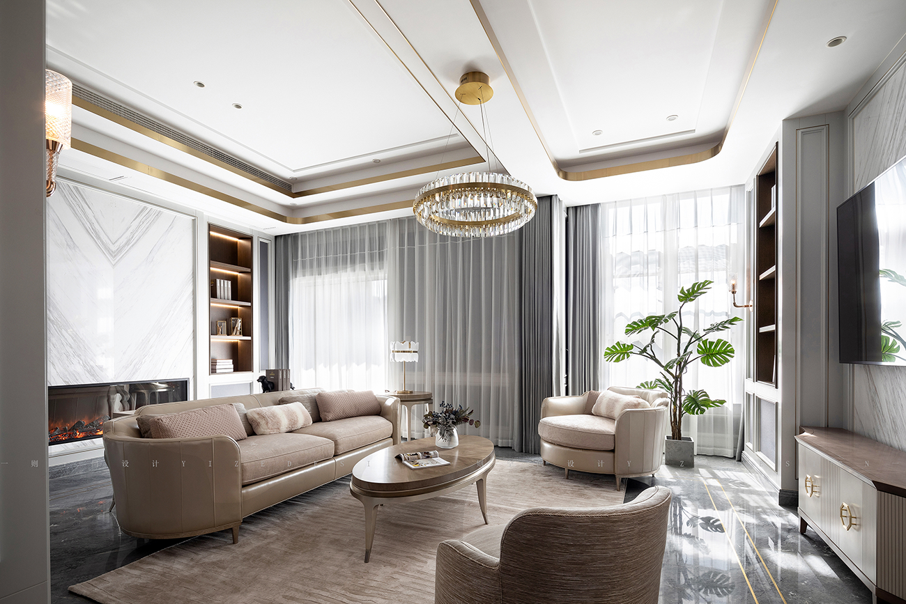 one design, the beauty of success 一则设计,成人之美 01 项目信息 项目地址/浙江·杭州 项目类型/别墅 设计团队/赵艺哲设计工作室 设计风格/轻奢美式 设计时间/2019年5月 设计面积/450㎡ 02 实景拍摄 | 客厅 THE LIVING ROOM |