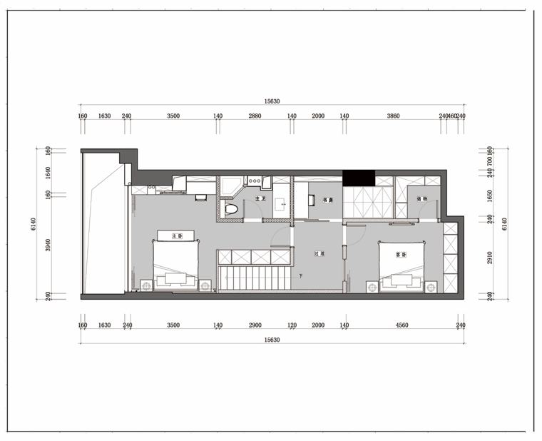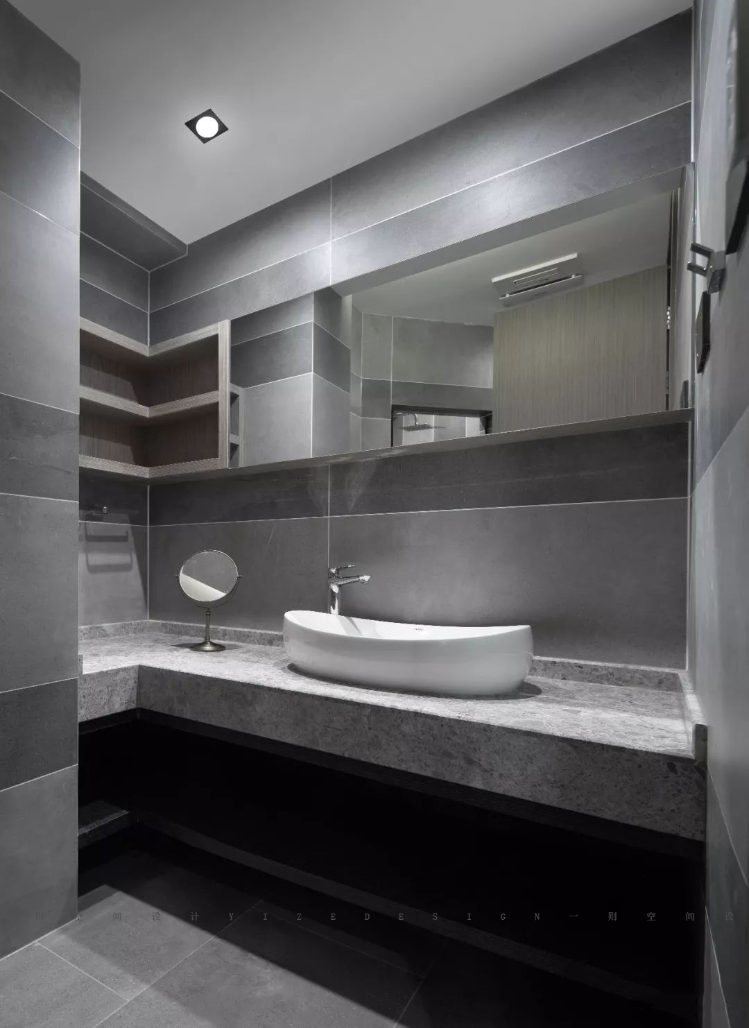 由于卫生间本身的占地面积较小,也是因为这样的原因我们采用了灰色拼接式墙面设计,横向的拼接花纹可以延长空间的视觉效果。不同颜色的组合也增加了一些灵动性。盥洗台面的天然大理石,融入整个灰调空间。 客卫