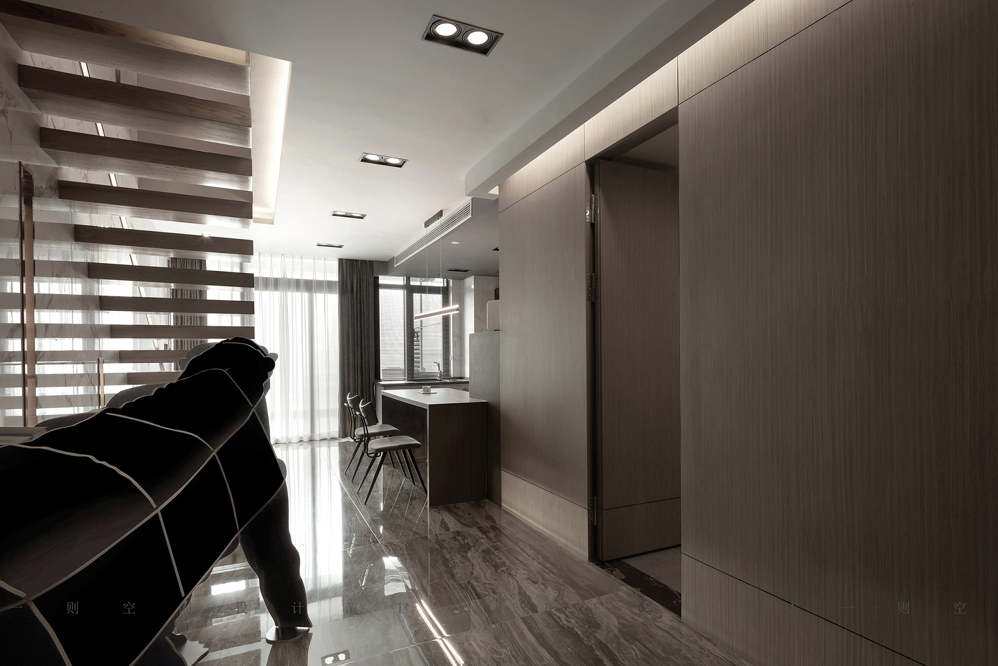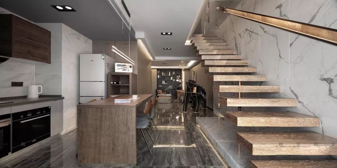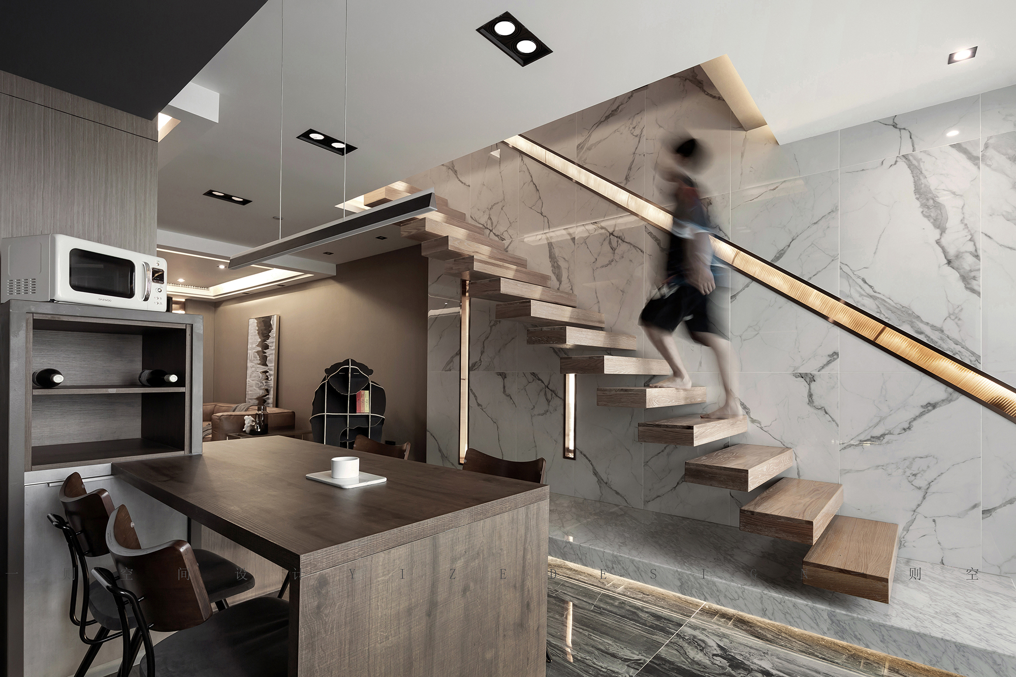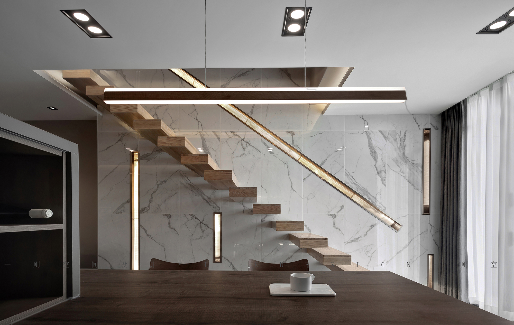 空间意境:灯带与无扶手悬空楼梯的结合是本案的一大亮点。使得较窄的户型变得通透,公卫隐形门与客厅书架的安排,既美观工整又大方得体。