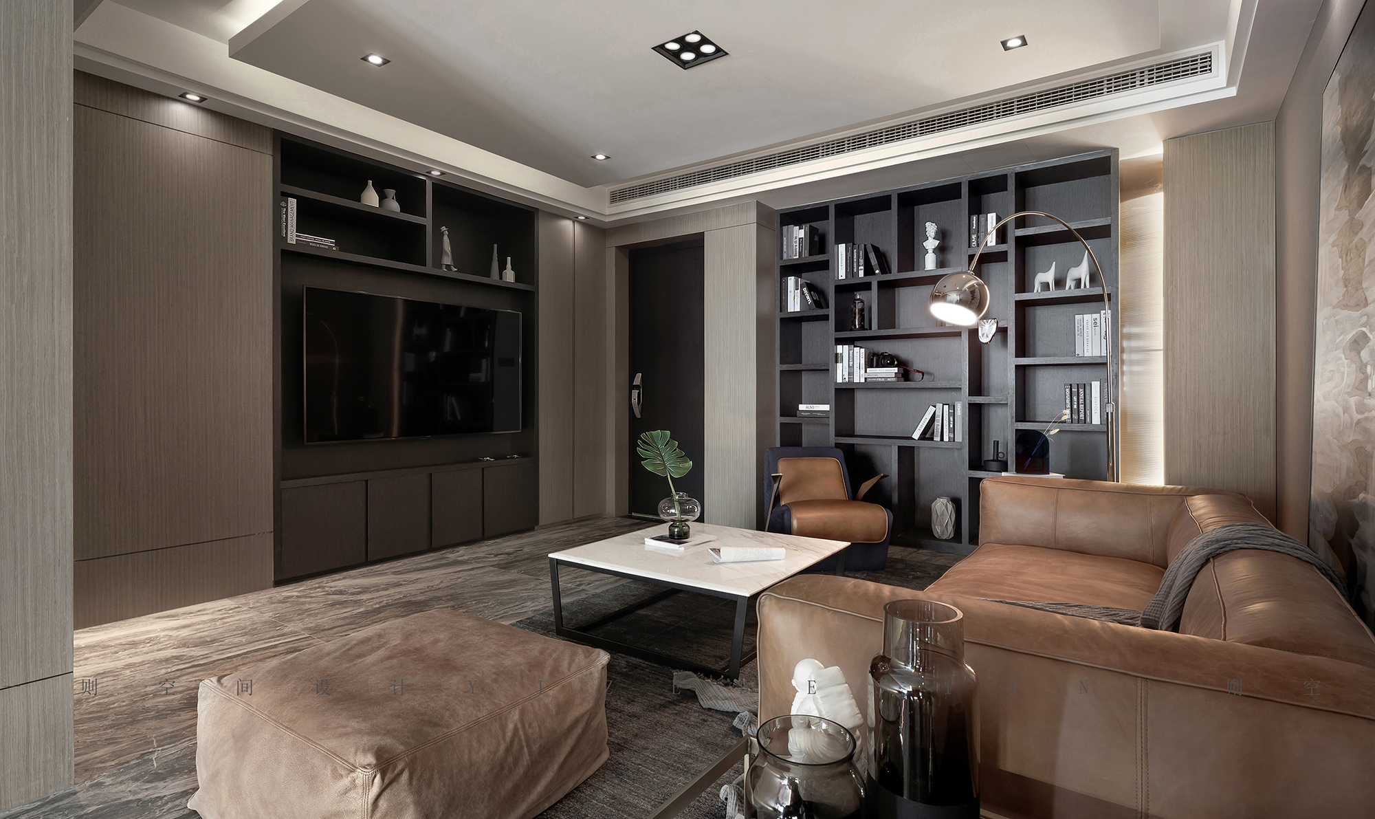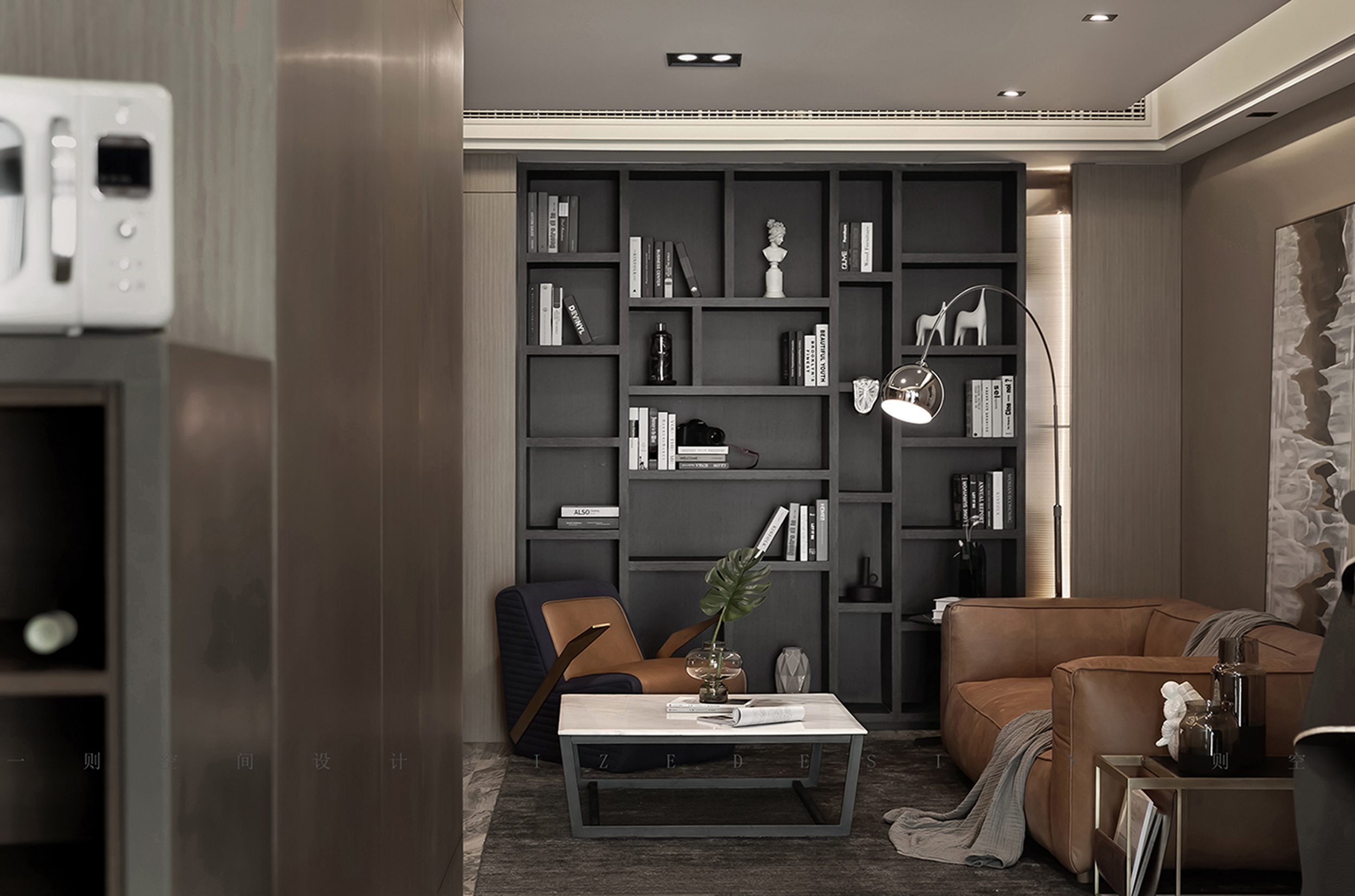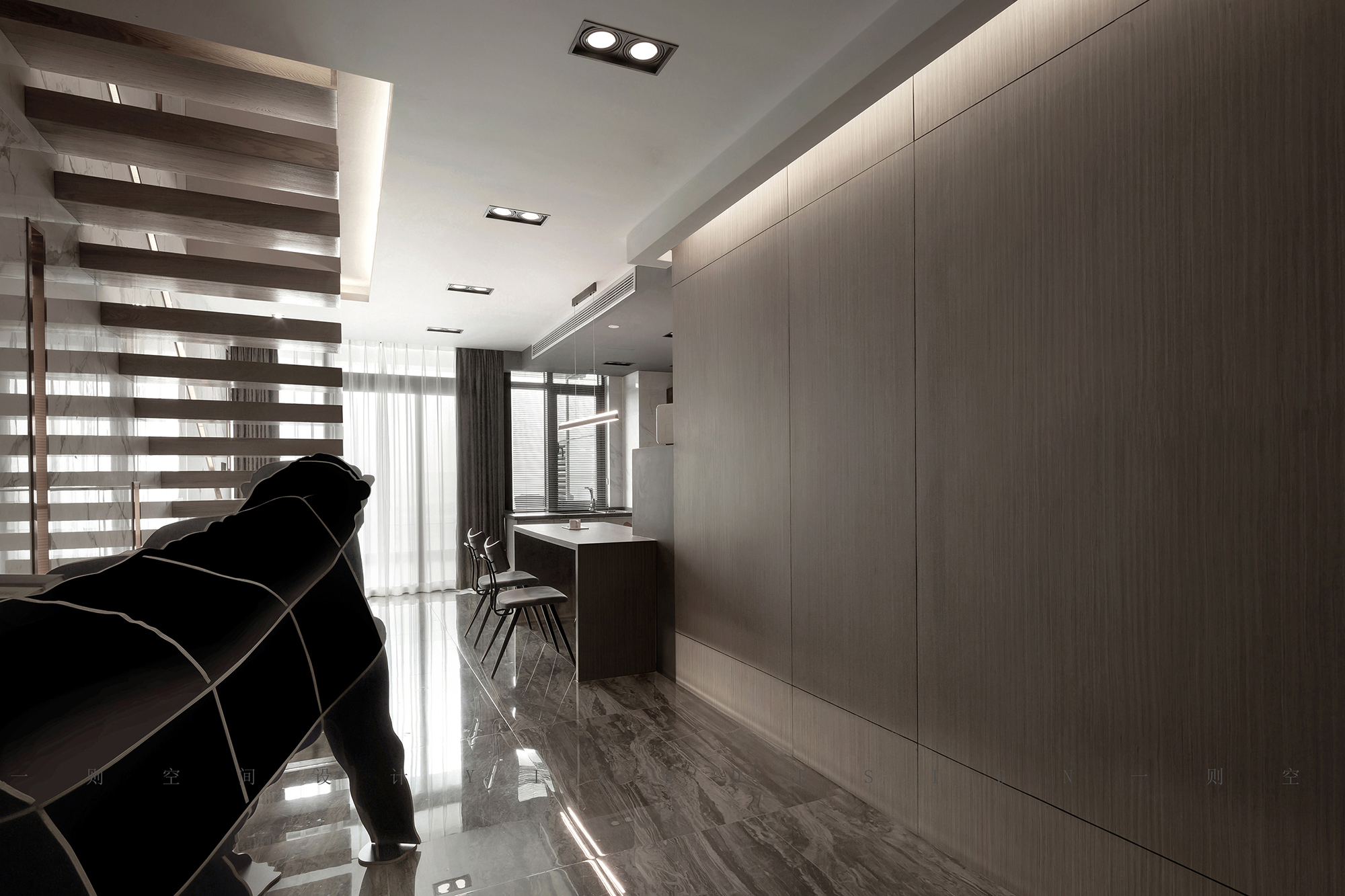 空间意境:灯带与无扶手悬空楼梯的结合是本案的一大亮点。使得较窄的户型变得通透,公卫隐形门与客厅书架的安排,既美观工整又大方得体。
