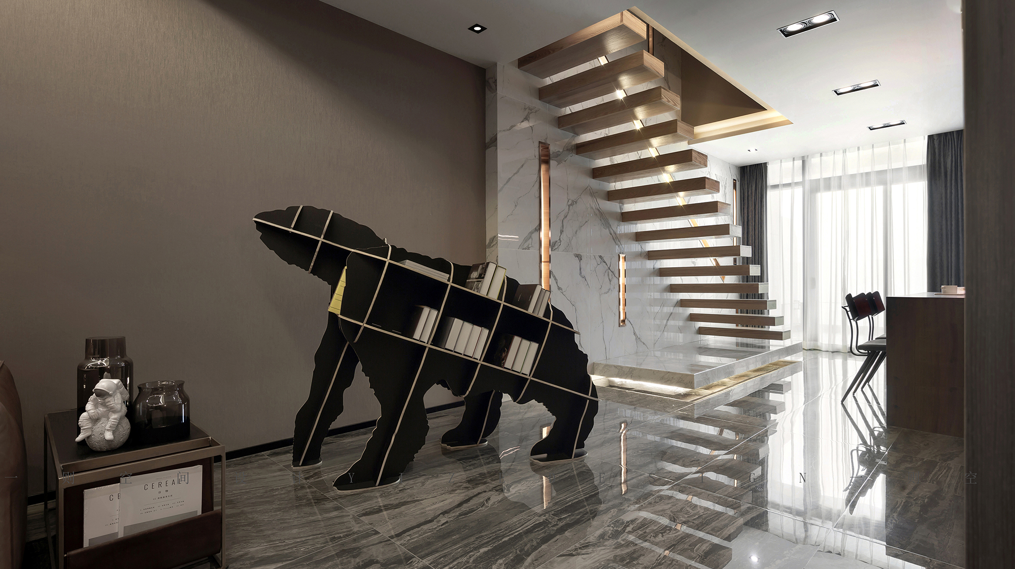 进门左手就是一个充满生气的客厅,黑熊的置物架使整个灰色空间多了一些自然灵动之感。一缕缕温暖的光线从镂空台阶的缝隙间穿梭进客厅中,让置身于繁忙的城市之中人儿,仿佛在这找到了一片自然的恬静。 楼梯