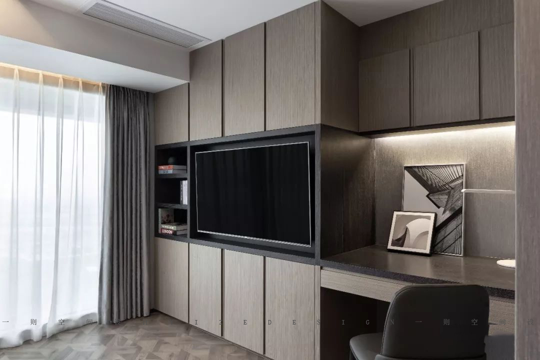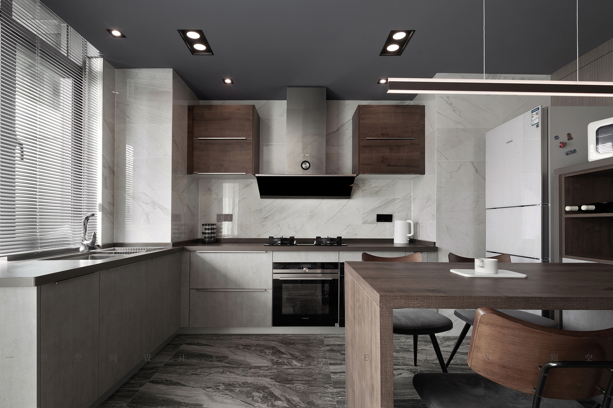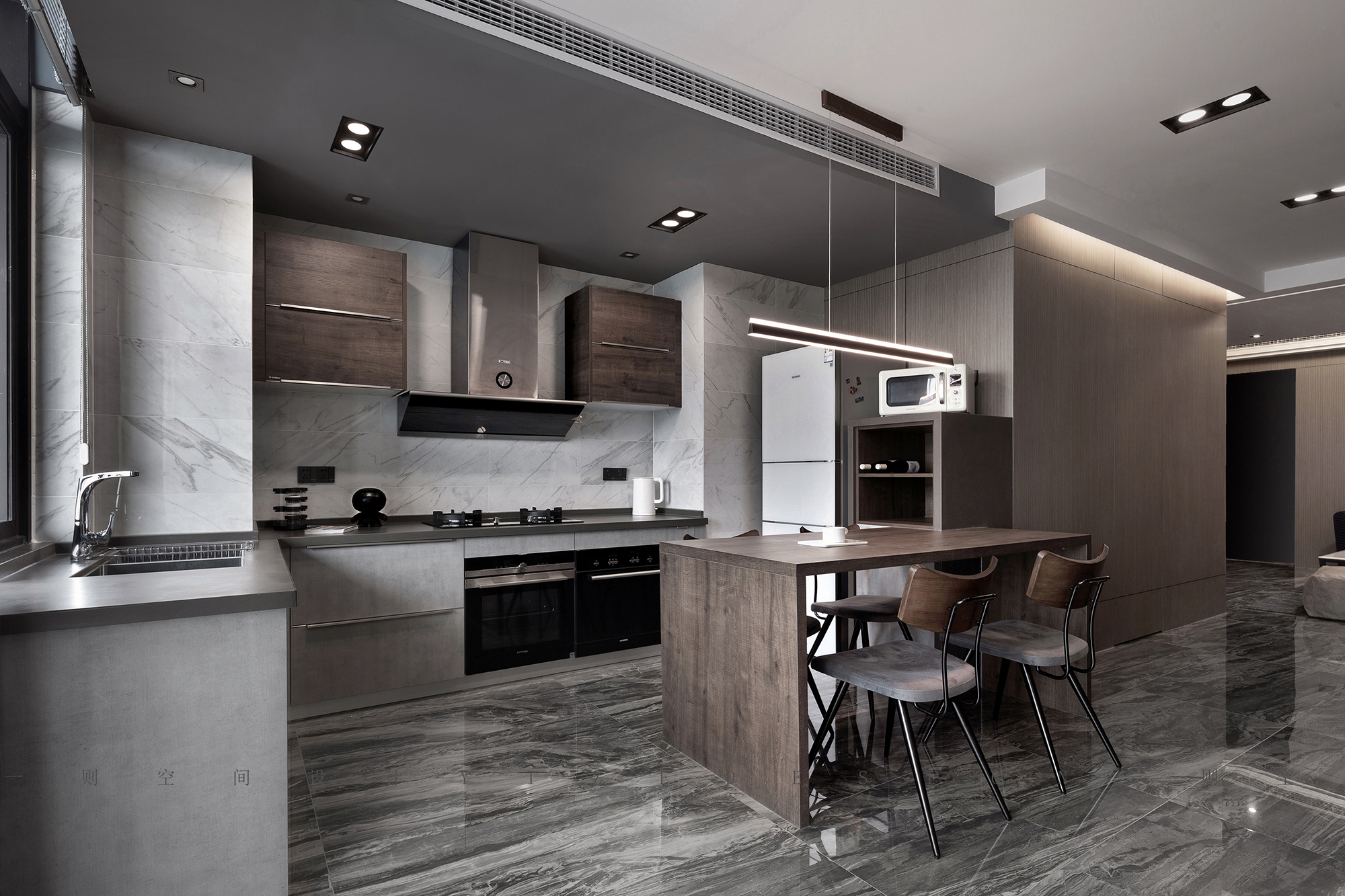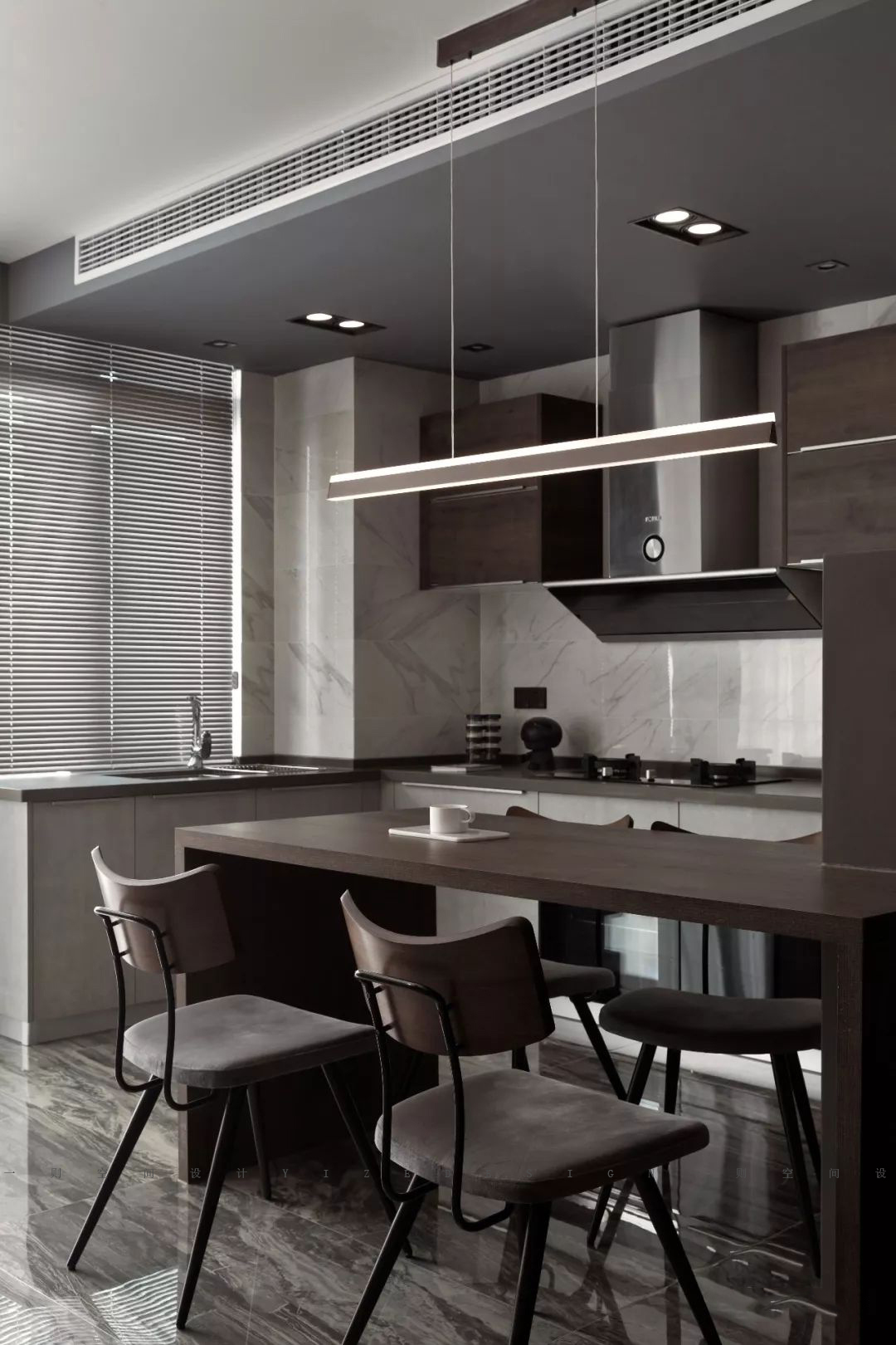 由于客户是单身男性,平时很少料理,所以厨房选用了开放性的空间设计,更加的年轻化、现代感。厨房的色调还是延续了客厅的基础色调,在沉稳中不失个性,在硬朗中又是不温馨。 主卧
