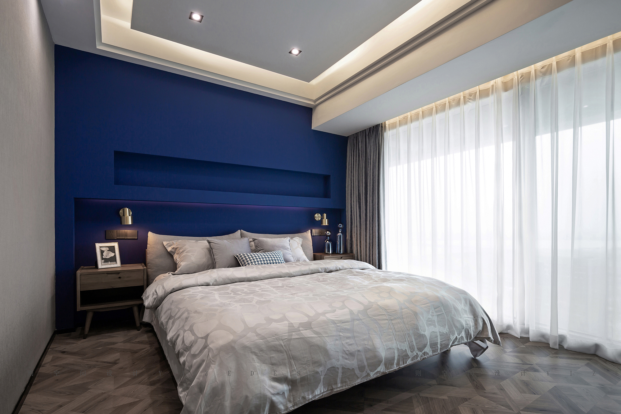 主卧拥有大大的落地窗,在满足收纳的基础上,我们将嵌入柜子电视机和梳妆台结合。主卧背景选用了克莱因蓝,睡觉时仿佛置身于夜色星空之中。穹宇宙之宏大叹人之渺小。 主卫