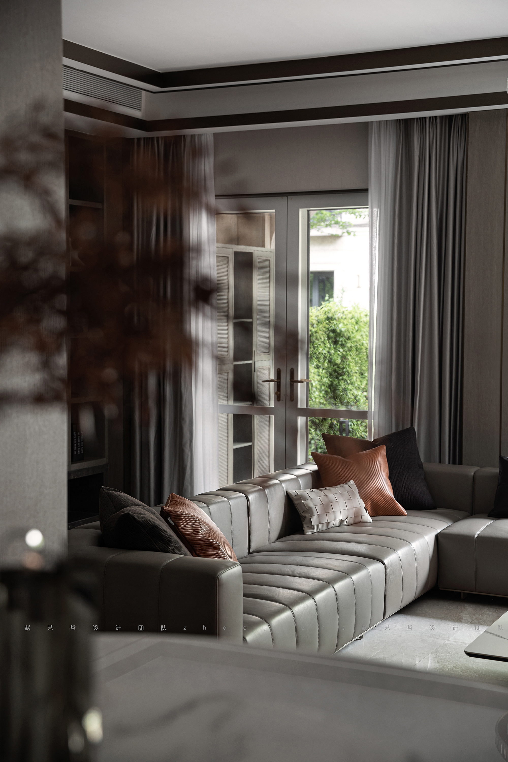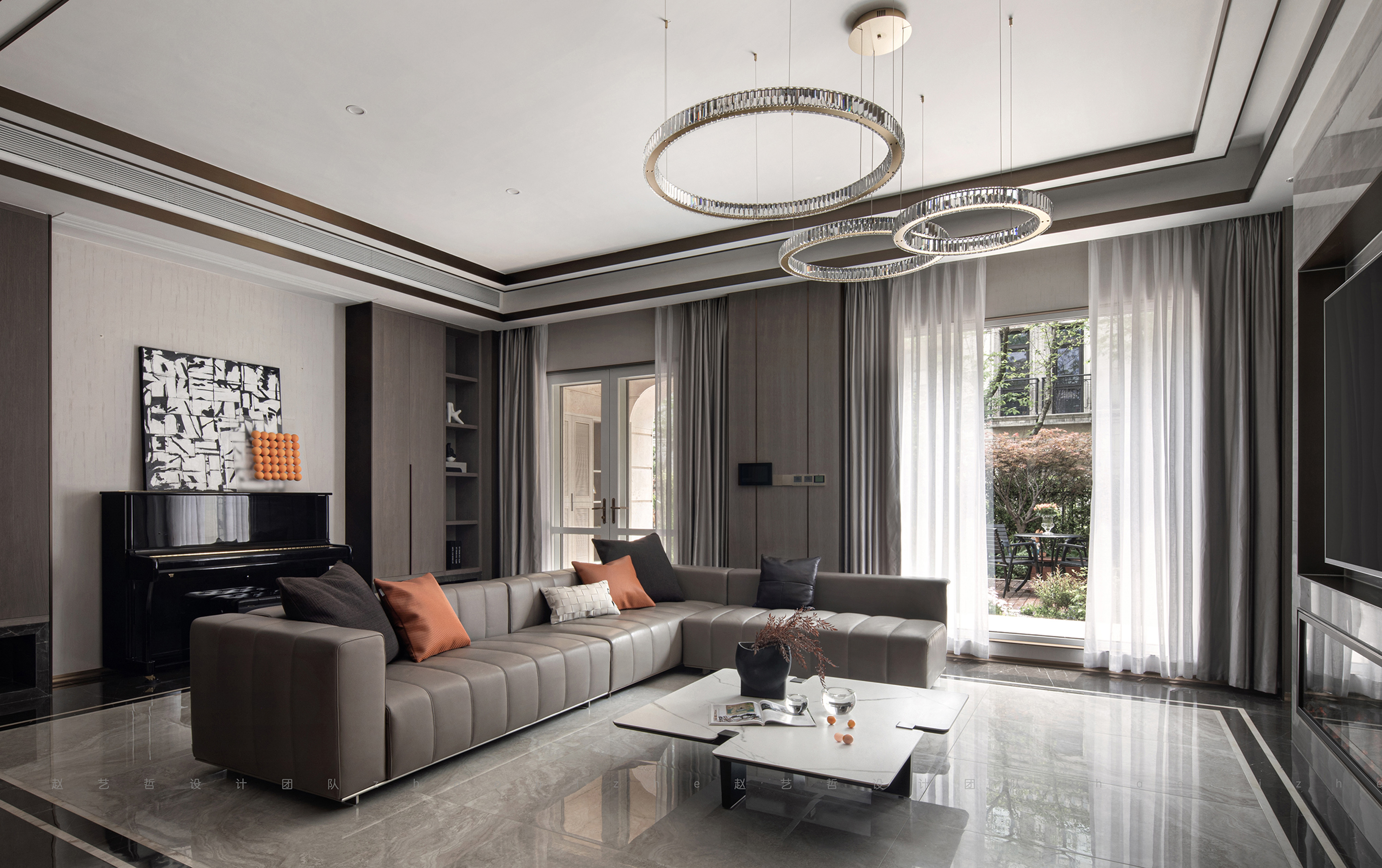 客厅以典雅的现代灰为主基调,将亮橙色作为不经意间的点缀,增添视觉上的动感