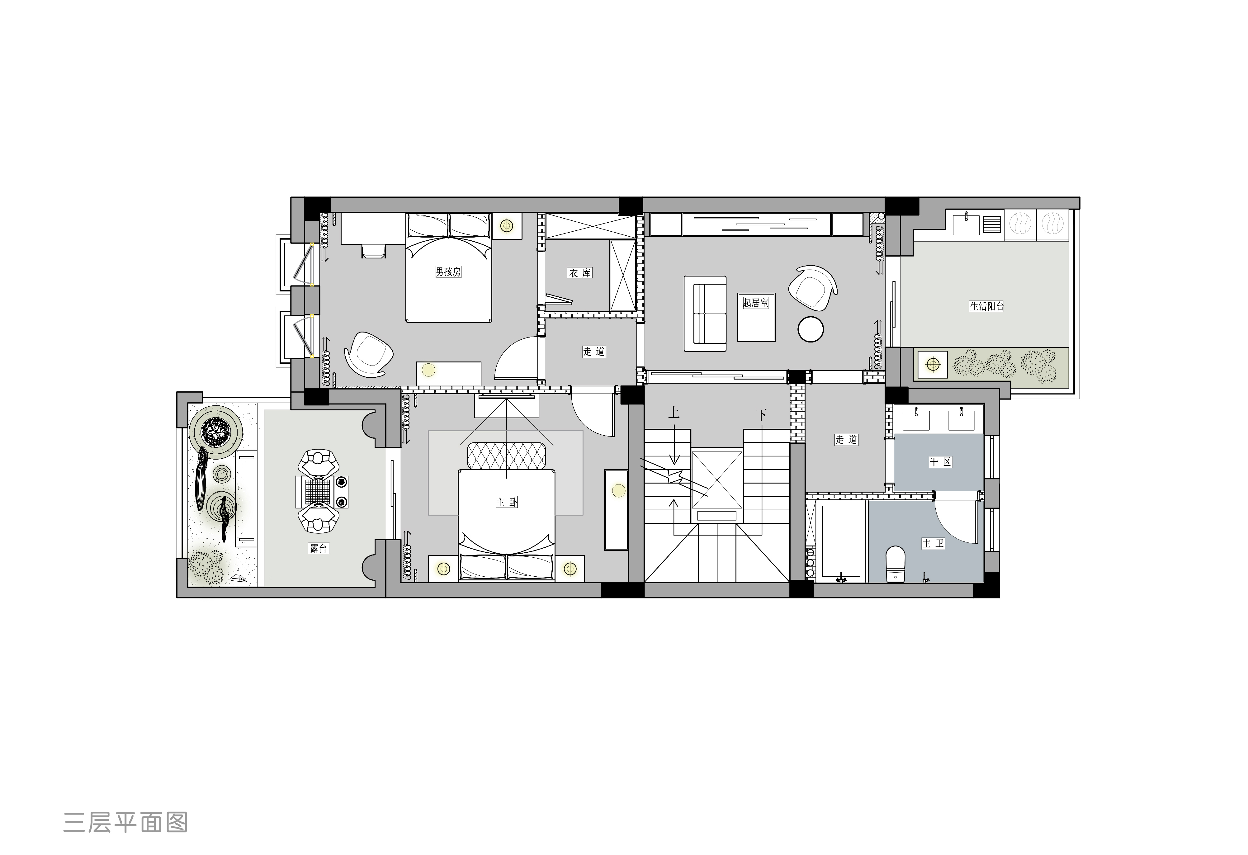 三层为主人空间,该空间包含卧室,大采光起居室,衣帽间,卫生间。
