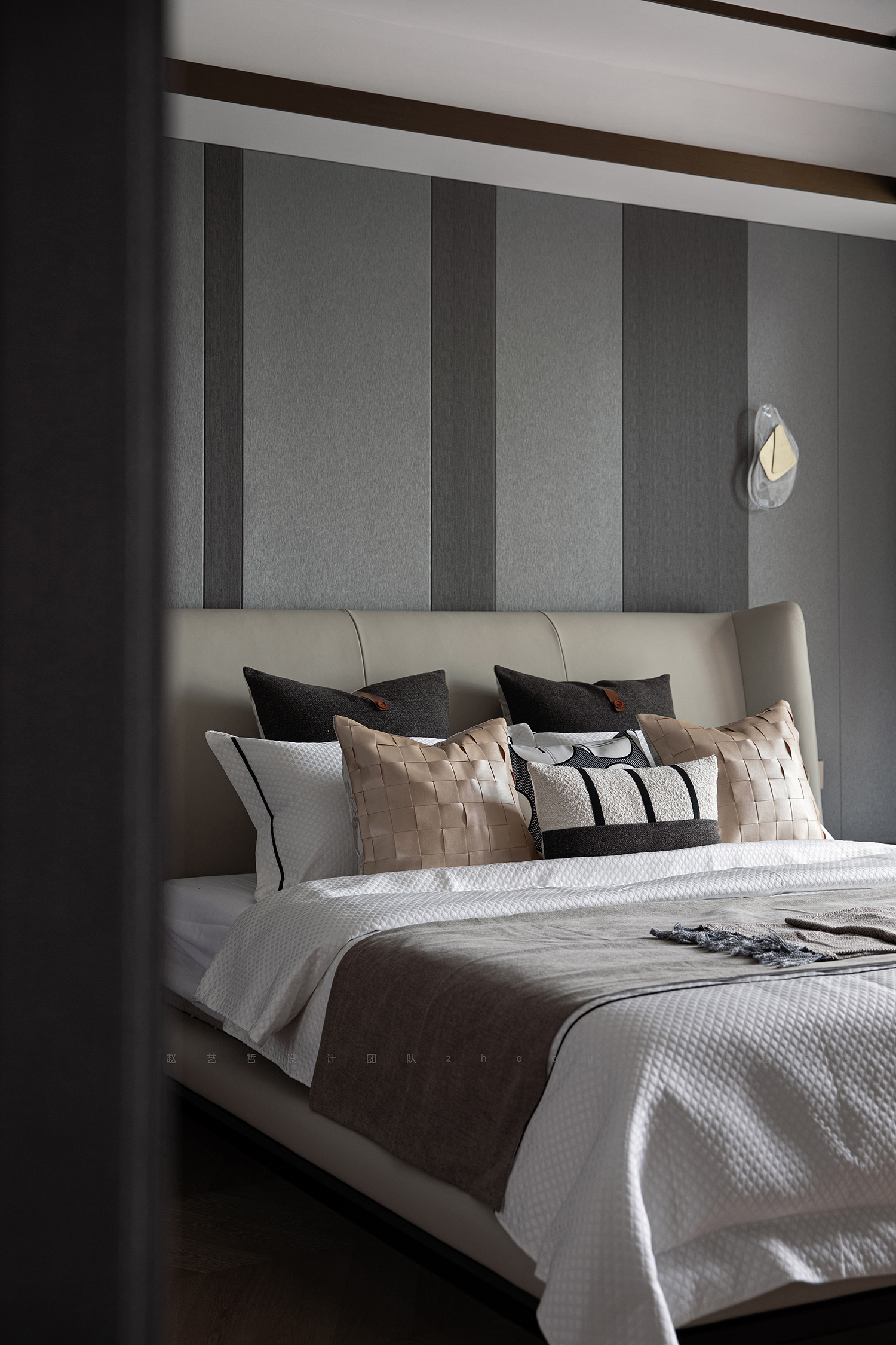 房间整体灰白映衬,素雅简洁。白色天花板做了木色描边,突出空间的层次感;米色的床品搭配大格编织的床头,不失活泼