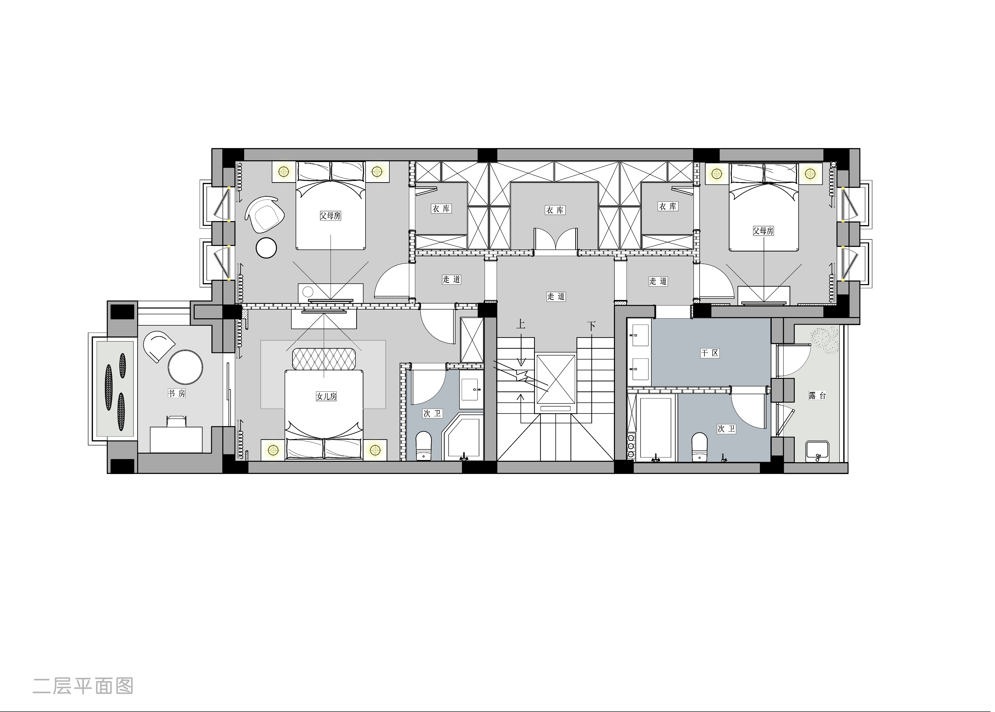 二层为起居活动区、女儿房及两间客房;